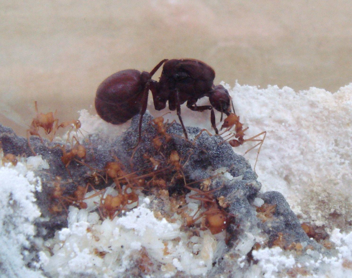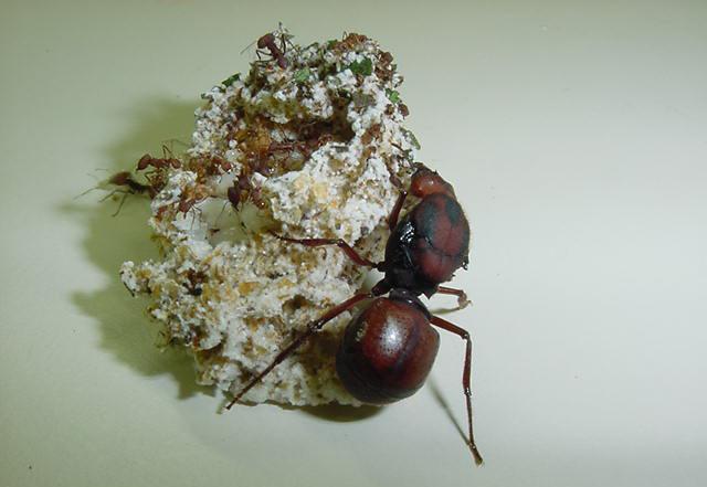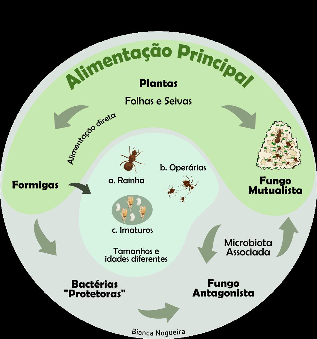 Esses insetos, originalmente com ferrão, têm em comum a vida em sociedade. Diferentes das abelhas, cujo comando está centrado na rainha, as formigas não apresentam um comando central, mas sim de toda a sociedade. O fungo mutualista das formigas-cortadeiras é um Basideomycota (basidiomiceto), dentro da Ordem Agaricales, espécie Leucoagaricus gongylophorus, que raramente aparece na forma reprodutiva (cogumelo) e é encontrado só no interior dos ninhos; portanto ele é transferido pelas içás durante o voo nupcial ao estabelecer um novo sauveiro.