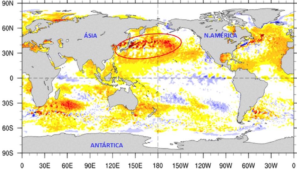 de 28,6°N-28,6°S de latitude para a mínima de 18,4°N-18,4°S de latitude num intervalo de 9,3 anos e retorna para a posição máxima em mais 9,3 anos, totalizando um ciclo de 18,6 anos. Em um intervalo de aproximadamente 10 anos, o plano da órbita lunar se situa fora dos trópicos, ou seja, sua declinação é maior que 23,5° (latitude dos Trópicos do Câncer e Capricórnio). Nessas circunstâncias (declinação entre 23,5° e 28,6° de latitude), o componente da força gravitacional lunar é maior na direção equador-polo e acelera as correntes marinhas, particularmente a do Golfo (Atlântico Norte) e a de Kuroshio (Pacífico Norte), transportando mais calor da região tropical para as latitudes mais elevadas. Isso faz com que as águas do Pacífico Norte e do Atlântico Norte fiquem mais aquecidas que o normal e torne o clima dos países banhados por elas, como a costa oriental da Ásia (China e Rússia), Europa Ocidental (Inglaterra e Escandinávia), mais ameno e úmido. A curto prazo, uma das consequências dessa configuração de TSM é o inverno norte americano atípico de 2025 em que, no Mapa da próxima página, se veem águas aquecidas no Pacífico Norte em decorrência de o plano da órbita ter estado em sua declinação máxima em 22/03/2025 (Veja a Coluna 3 da Tabela). Em cima das águas quentes, se estabelece um sistema de baixa pressão atmosférica e, entre esse e o Continente Norte-Americano, um sistema de alta pressão atmosférica que “bombeia” ar frio da Sibéria para América do Norte, produzindo um inverno mais frio e prolongado.