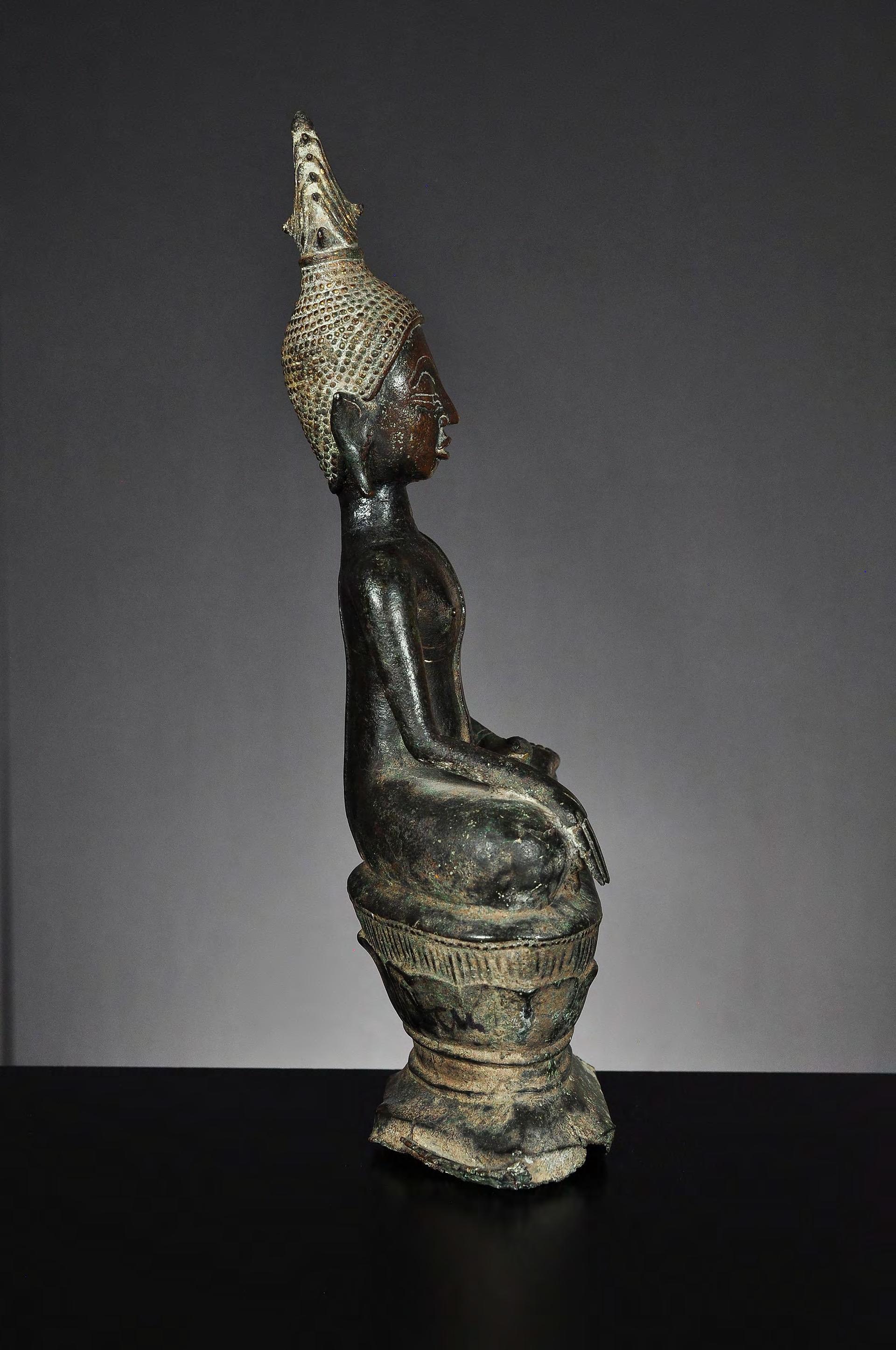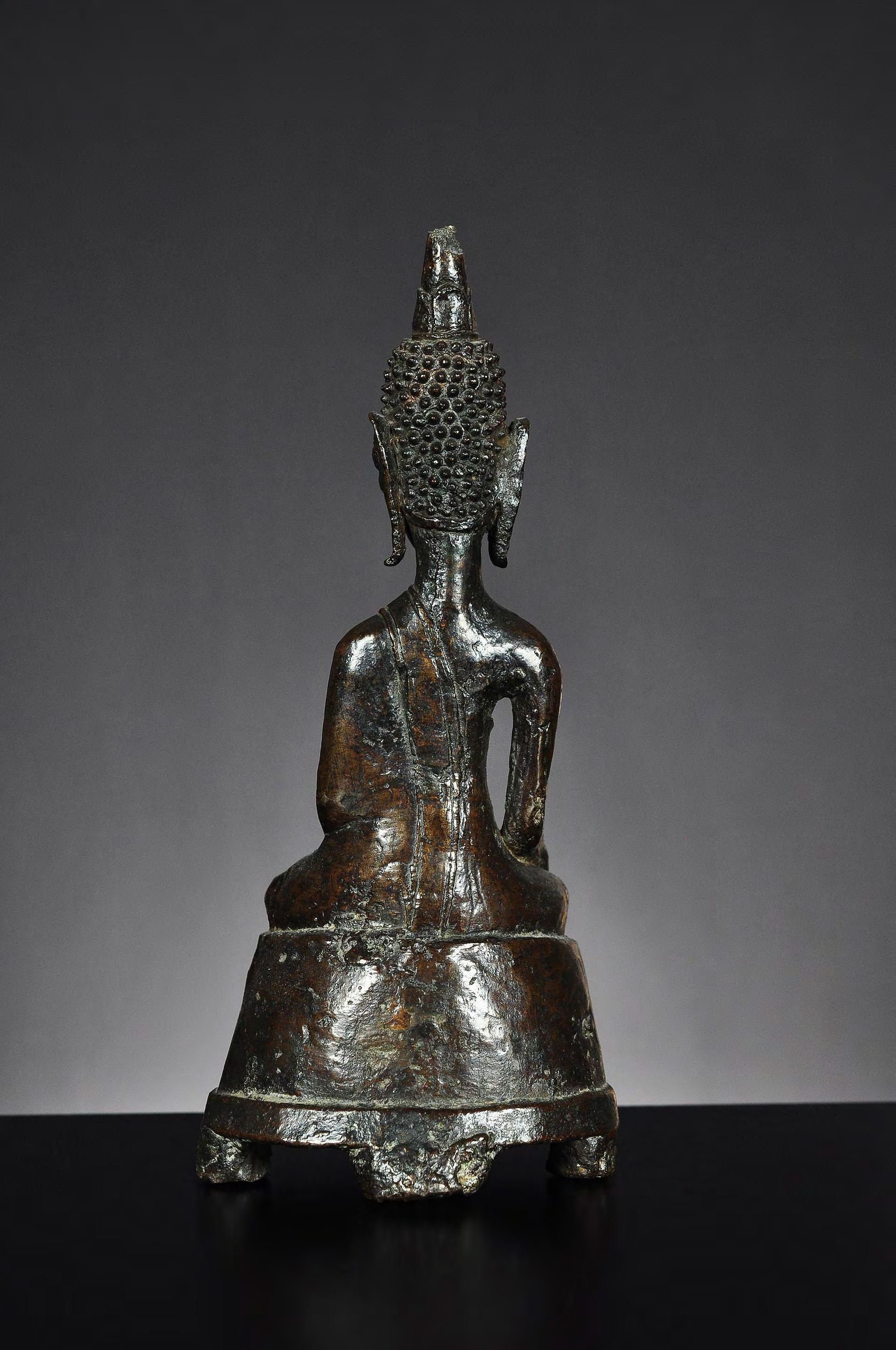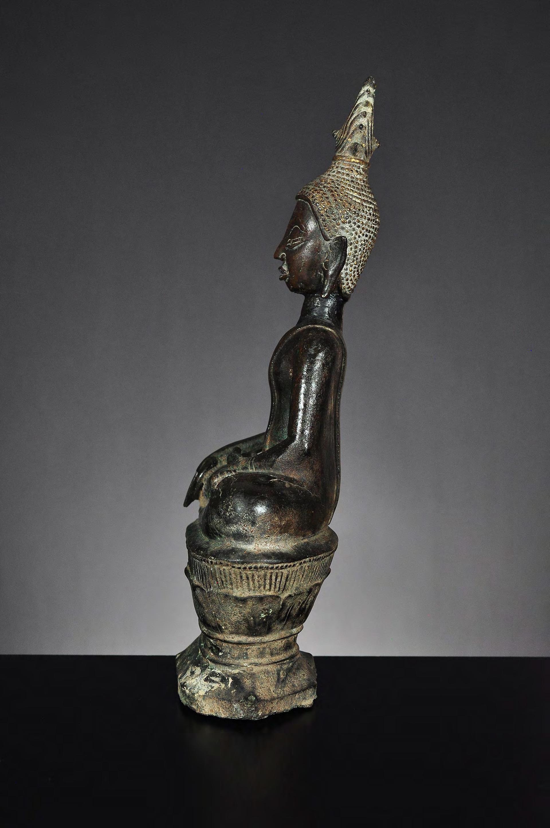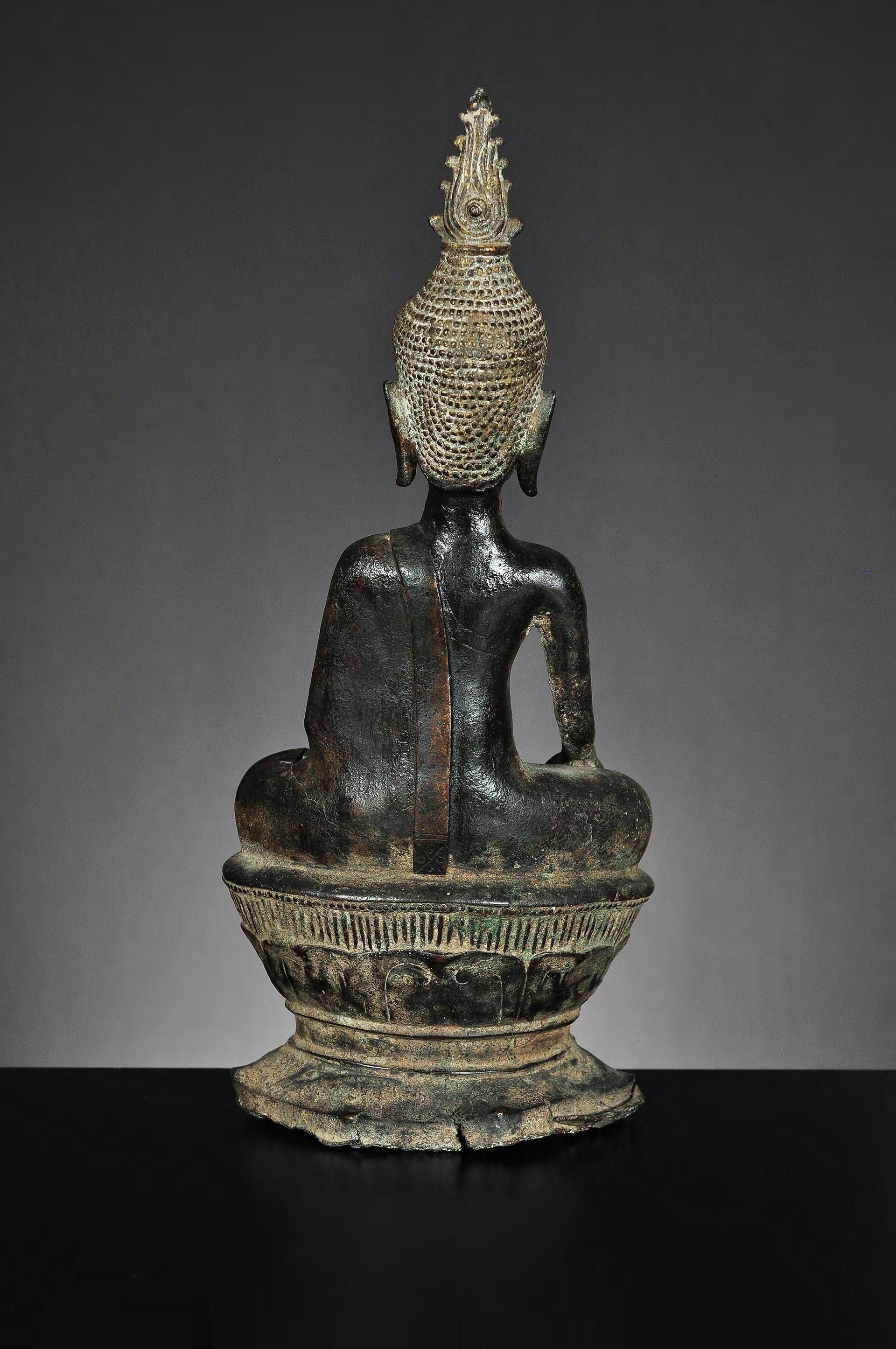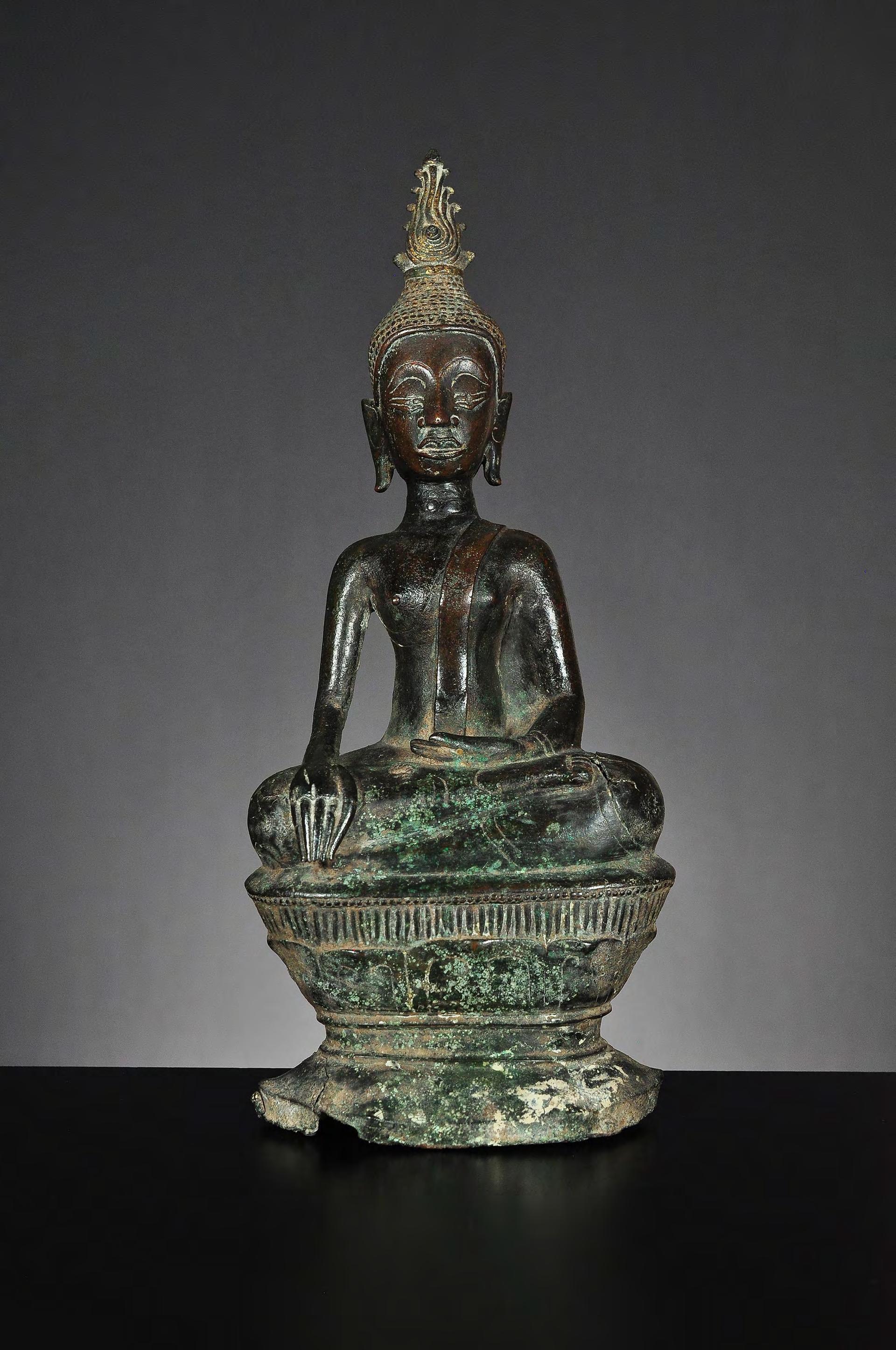 A seated bronze statue of Buddha on a lotus throne. Please note the large, impressive radiance with traces of gilding. Typical for the Buddha images of the early Lan Na period (probably Fang). Small curls are precisely arranged in lines. The eyes with pupils are downcast. The ear lobes are rather short. The lips are fine and detailed executed. The shoulder is rather tight and the arm with the earth touching gesture is long and slender. The statue appears in perfect proportion and with a superb dark patina. condition: cracks to the base and body, partly restored, hairline crack to the neck, with repairs