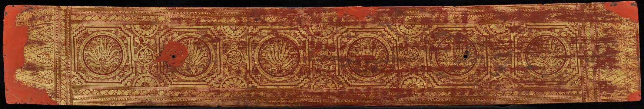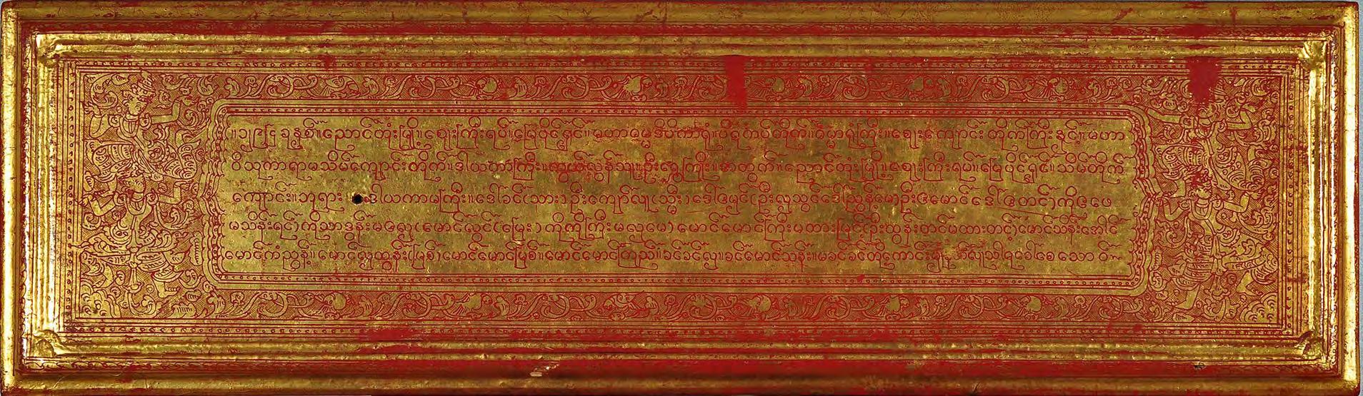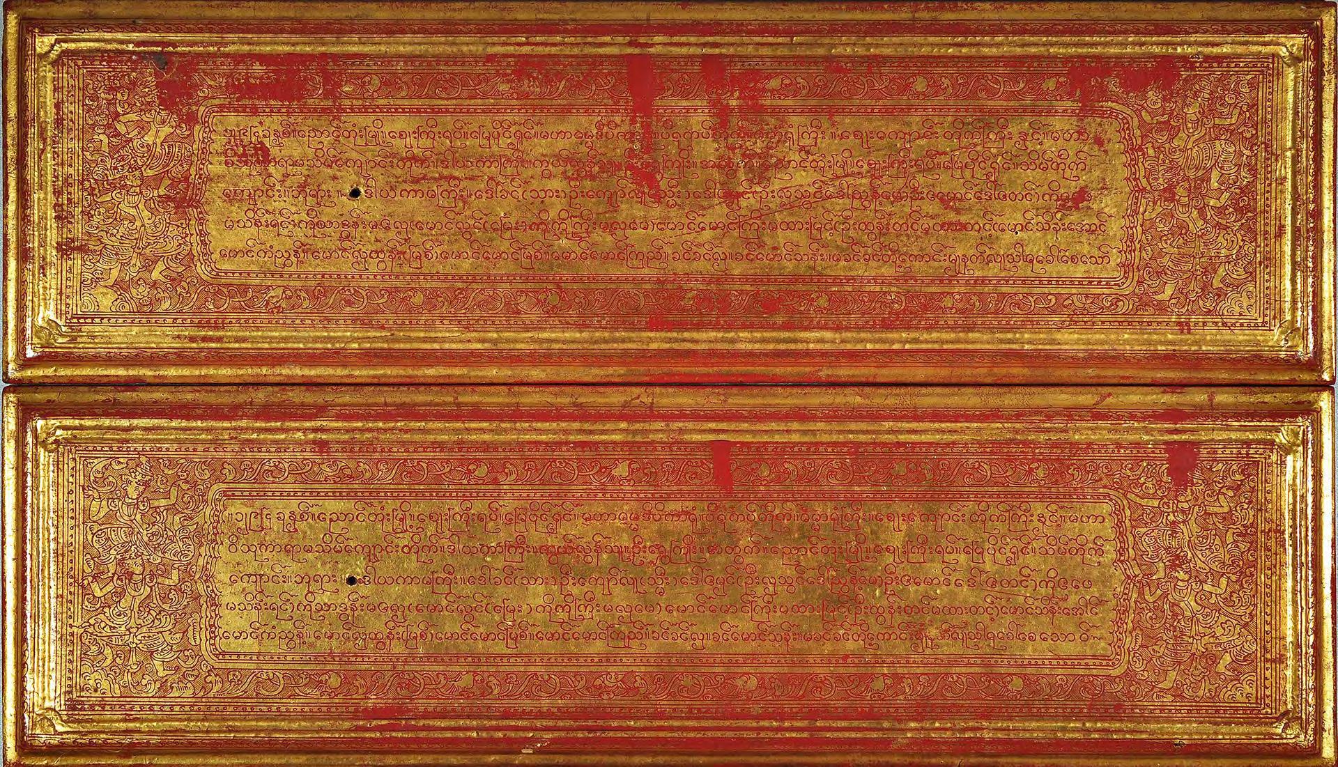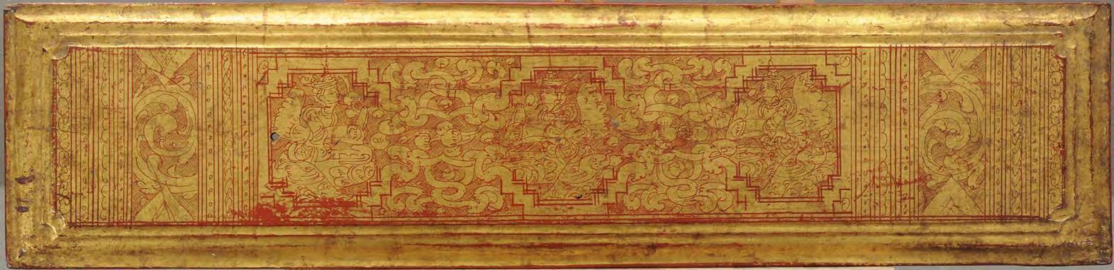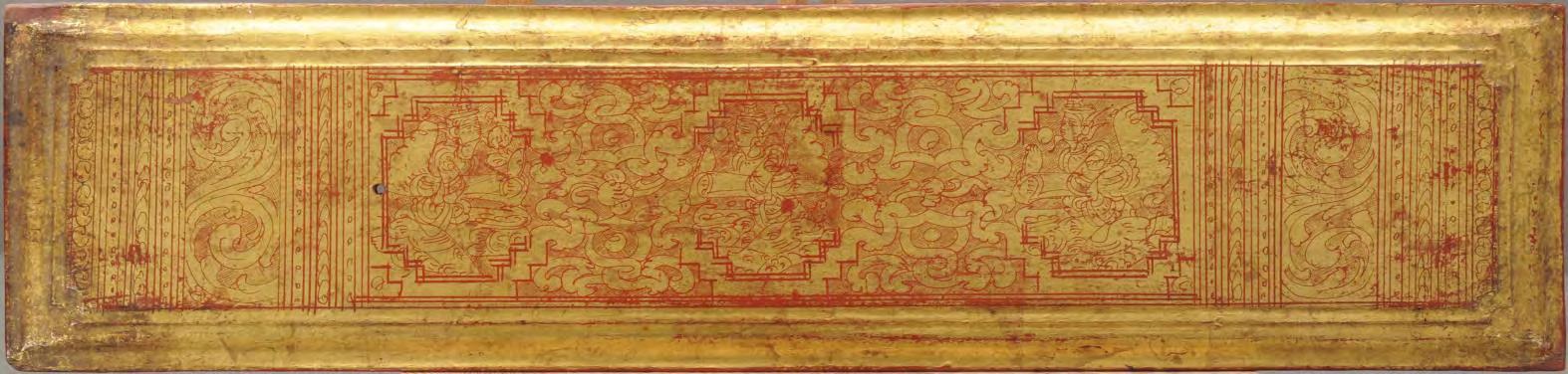 condition: one gilded main page with lotus bud decoration is missing, some edges and holes are restored with red lacquer