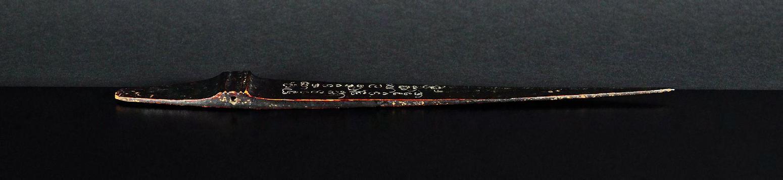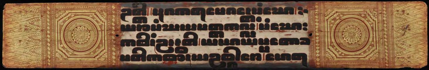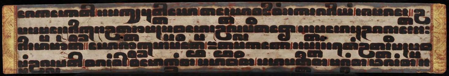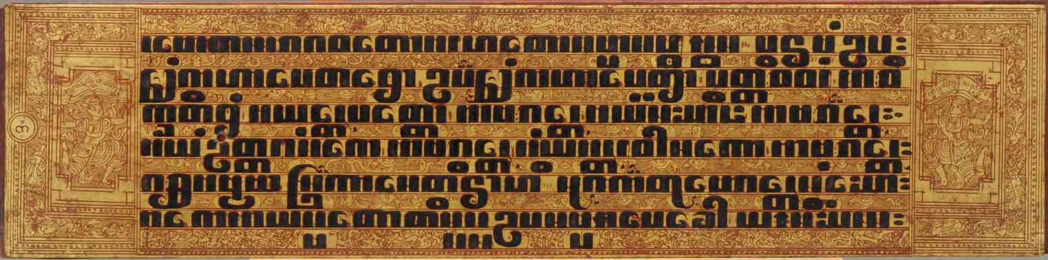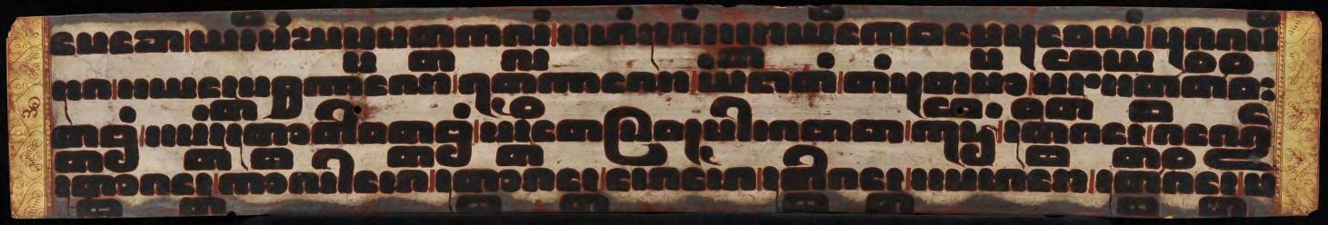 This early Buddhist manuscript consists 14 thin, fragile lacquered and (partly) gilded palm leaf folios with two wooden covers. Four lines of black lacquer writing in large square letters on an undecorated silver ground and the narrow punctuation symbols in red ink indicate the early time of origin (N. F. Singer: “14th century to early decades of the 18th century”) The lotus flower that graces the front page can be found in a tighter form as the radiance on Buddha images (see no. 1 in this catalogue).