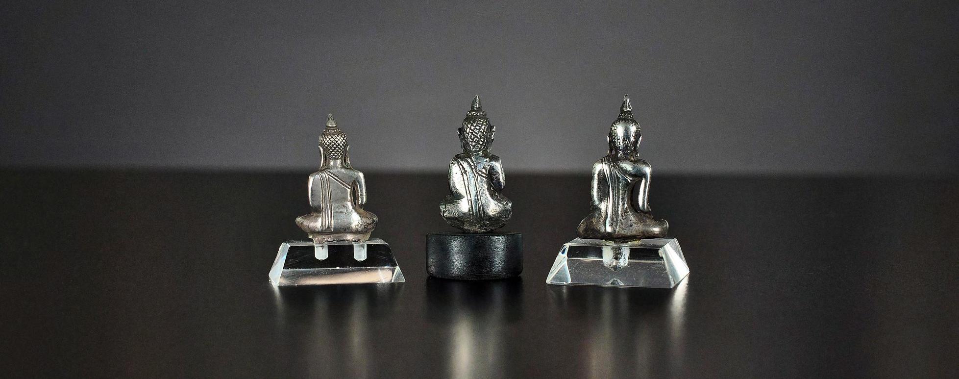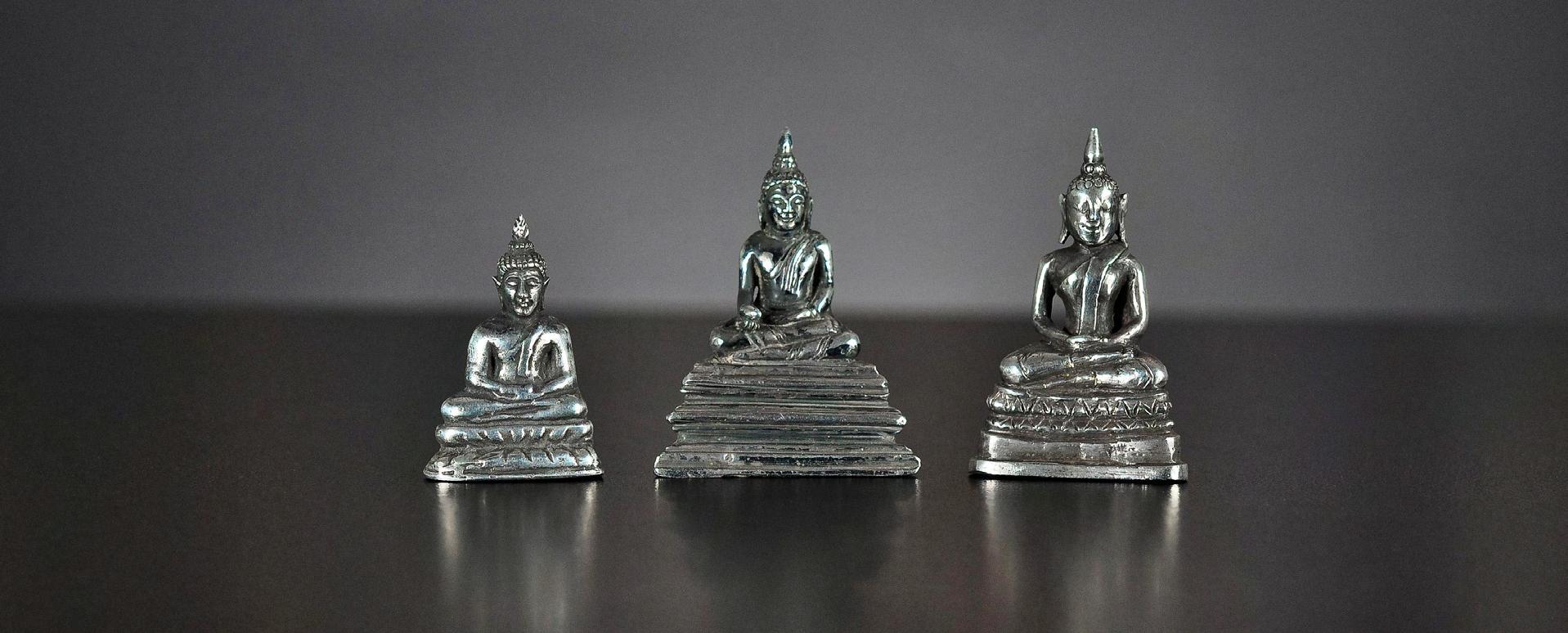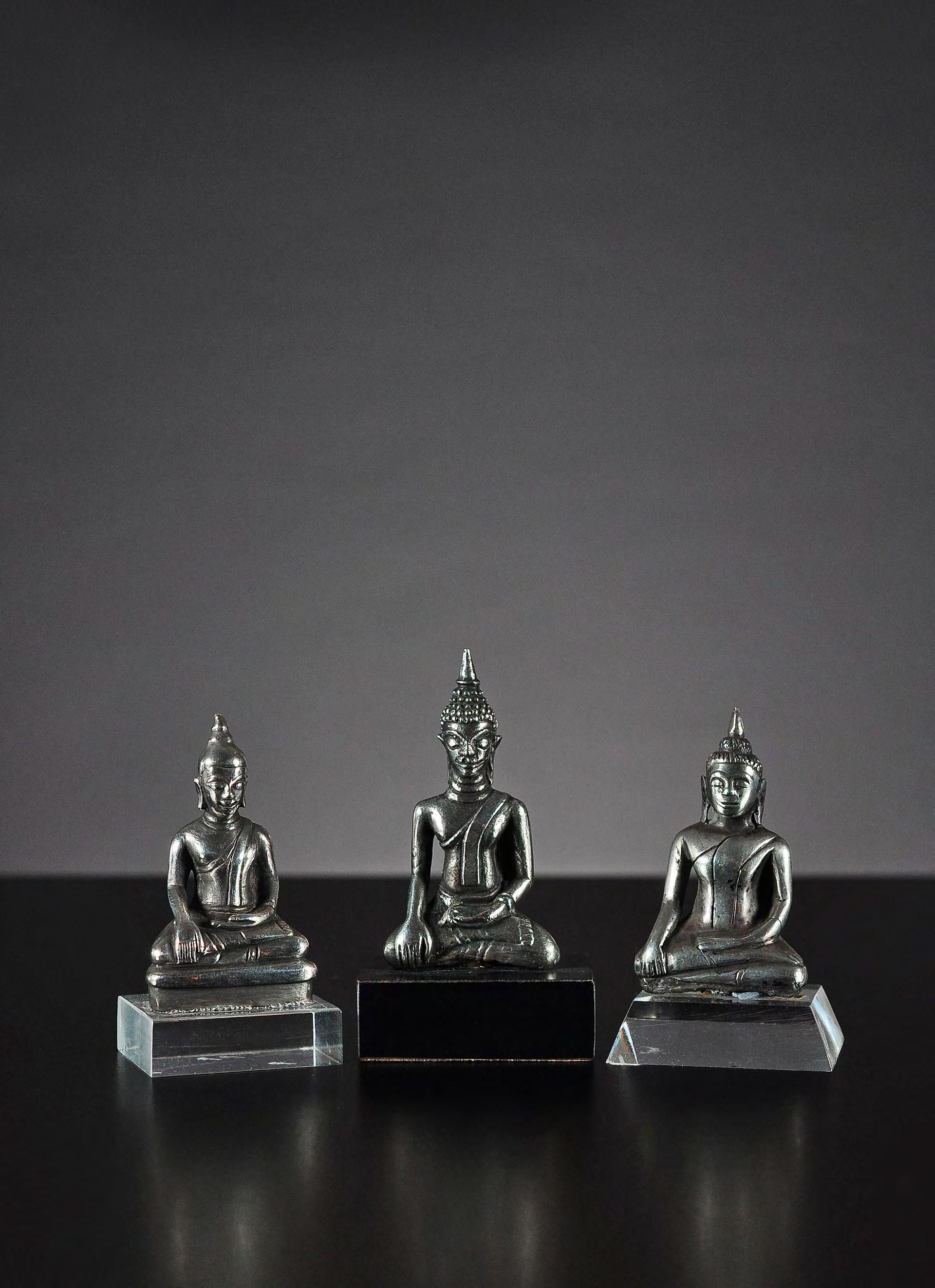 9 Three seated miniature Buddha statues, silver alloy, Thailand, 19th century