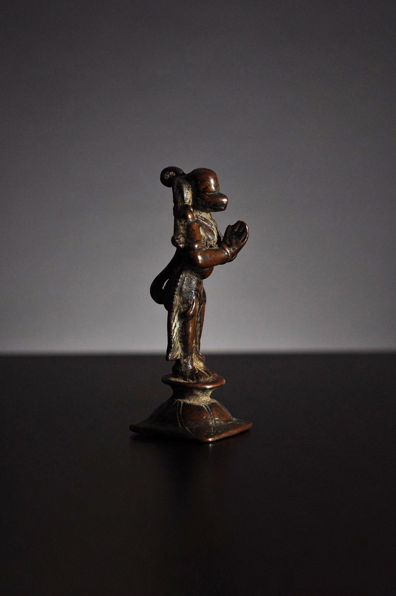 A bronze sculpture of Hanuman, the famous monkey general in Hindu mythology, stands on a circular lotus pedestal with a square bottom. His hands clasped in Anjali mudra and in obeisance, his long tail scrolling up to his head Hanuman is depicted in anthropomorphic form, only face and his upwards curved tail confirming his monkey identity.
