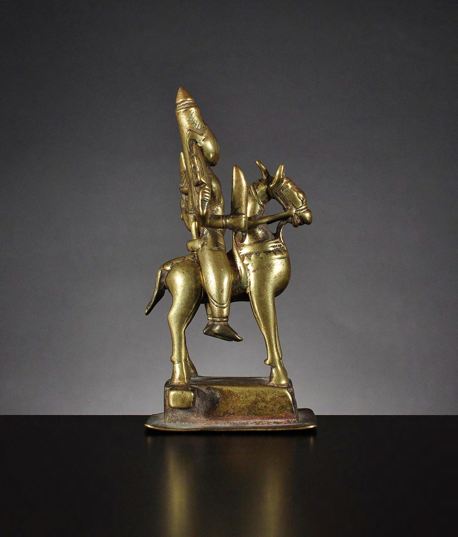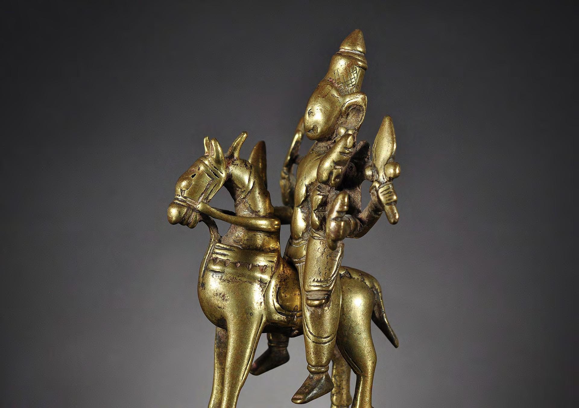 A detailed brass statue of Shiva as Khandoba with his wife Parvati as Mhalsi, depicted as an image of a warrior riding a horse. The sculpture consists of two separate parts. condition: smooth worn condition, crack to the base, Mandorla missing dimensions: 115 x 78 x 53 mm / 4.53 x 3.07 x 2.08 in reference: The Metropolitan Museum of Art: https://www.metmuseum.org/art/collection/search/75277