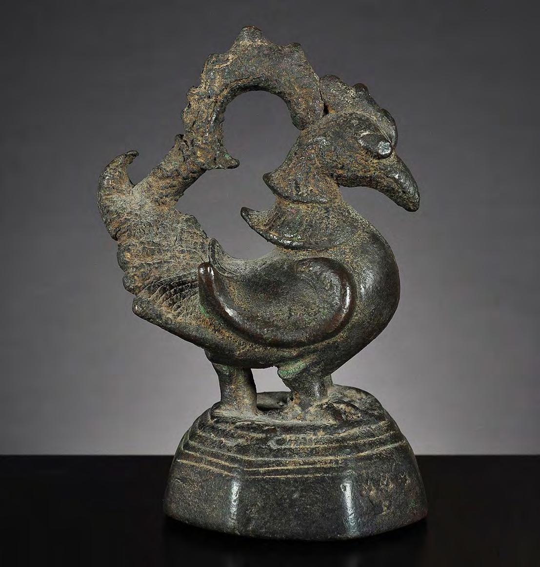 13 Bhu Devi sculpture, Copper alloy, Southern India, circa 18th century or earlier Bhu Devi, the goddess of earth, stands with a lotus bud in her right hand on a circular lotus pedestal fixed to a rectangular base. Her hair is piled up to a conical headdress with a lotus bud on the back of her head. Beside Sri Devi, Bhu Devi is one of the two consorts of Vishnu, often depicted as a triad sculpture, flanking Vishnu in mirrored poses. Sri Devi is distinguished from Bhu Devi by a breast band that adorns her chest condition: very good condition with extensive wear, minor traces of paste used during worship, fine copper patina