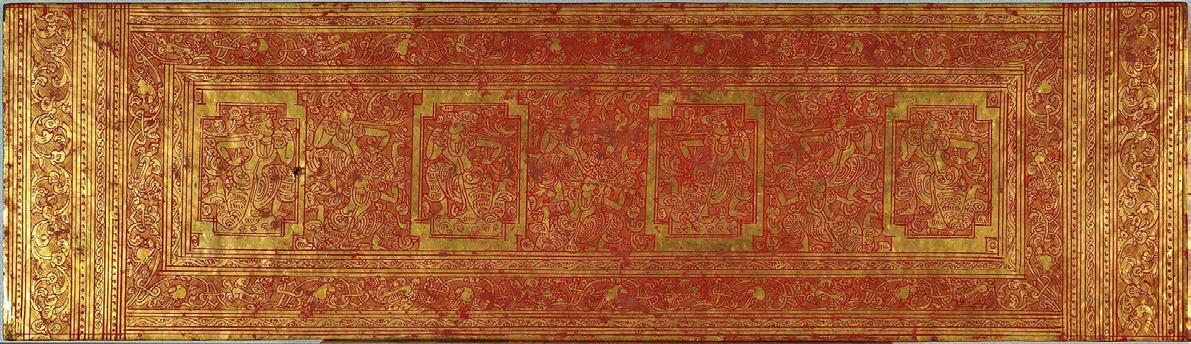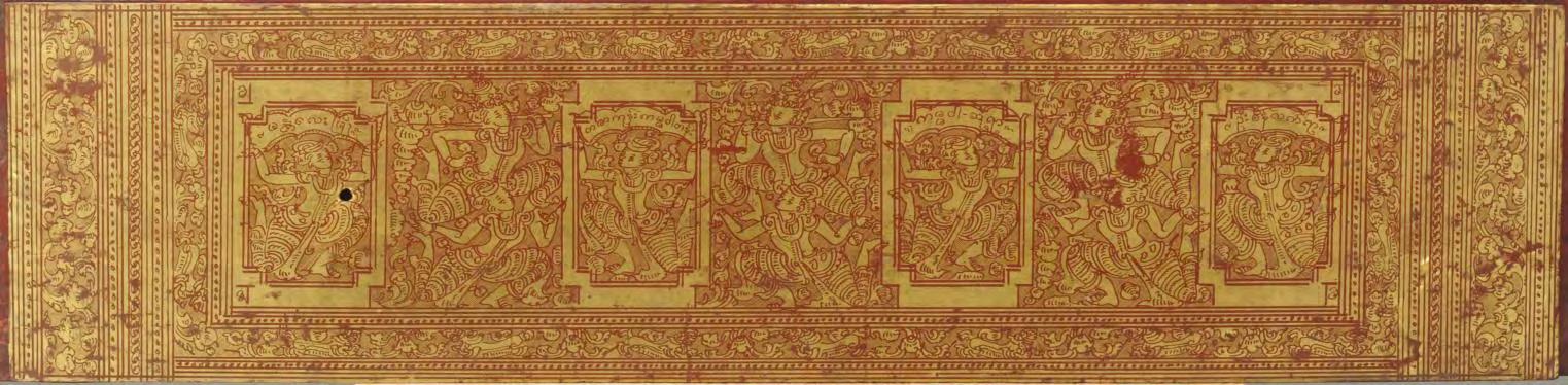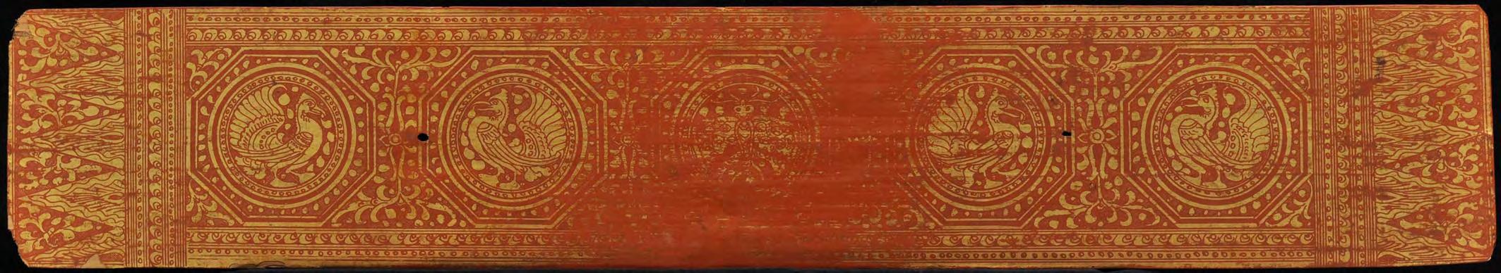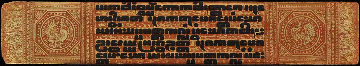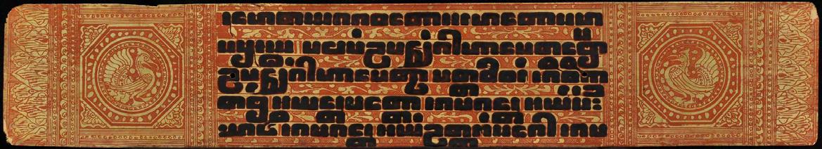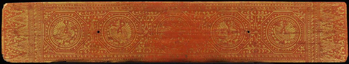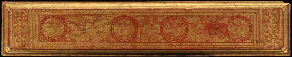 This Buddhist manuscript consists 12 thin lacquered and gilded palm leaf folios with two wooden covers. Five lines of script on gold ground with fine floral decoration. ANGELS (!) separated by parrots in circles on both covers and Hintha birds in framed circles resemble mandalas. Even though the cover size match the size of the leaves, it’s not sure whether the wooden covers are originally belongs to this manuscript or replaced damaged or lost pieces. But however, images of Western angels on Kammavaca covers are extremely rare, especially in this quality (please compare reference below).
