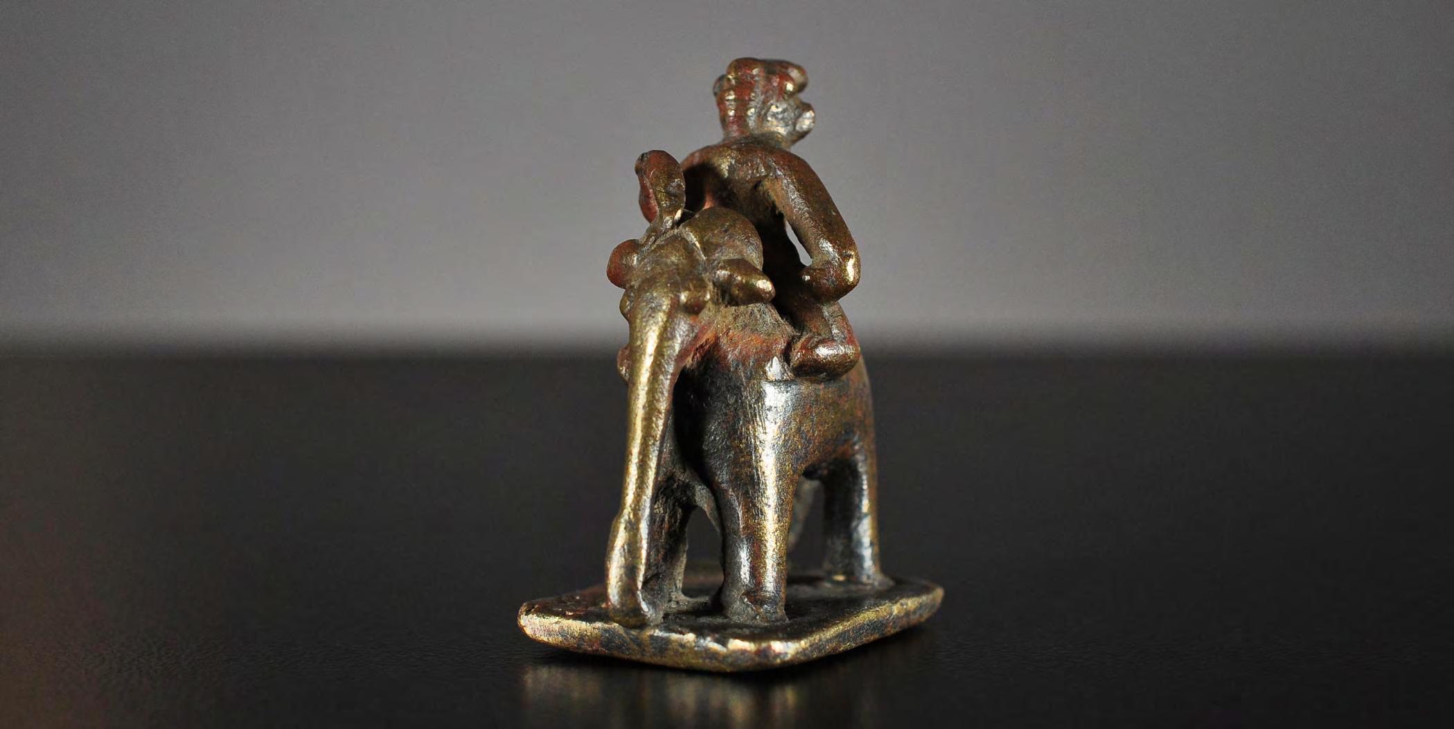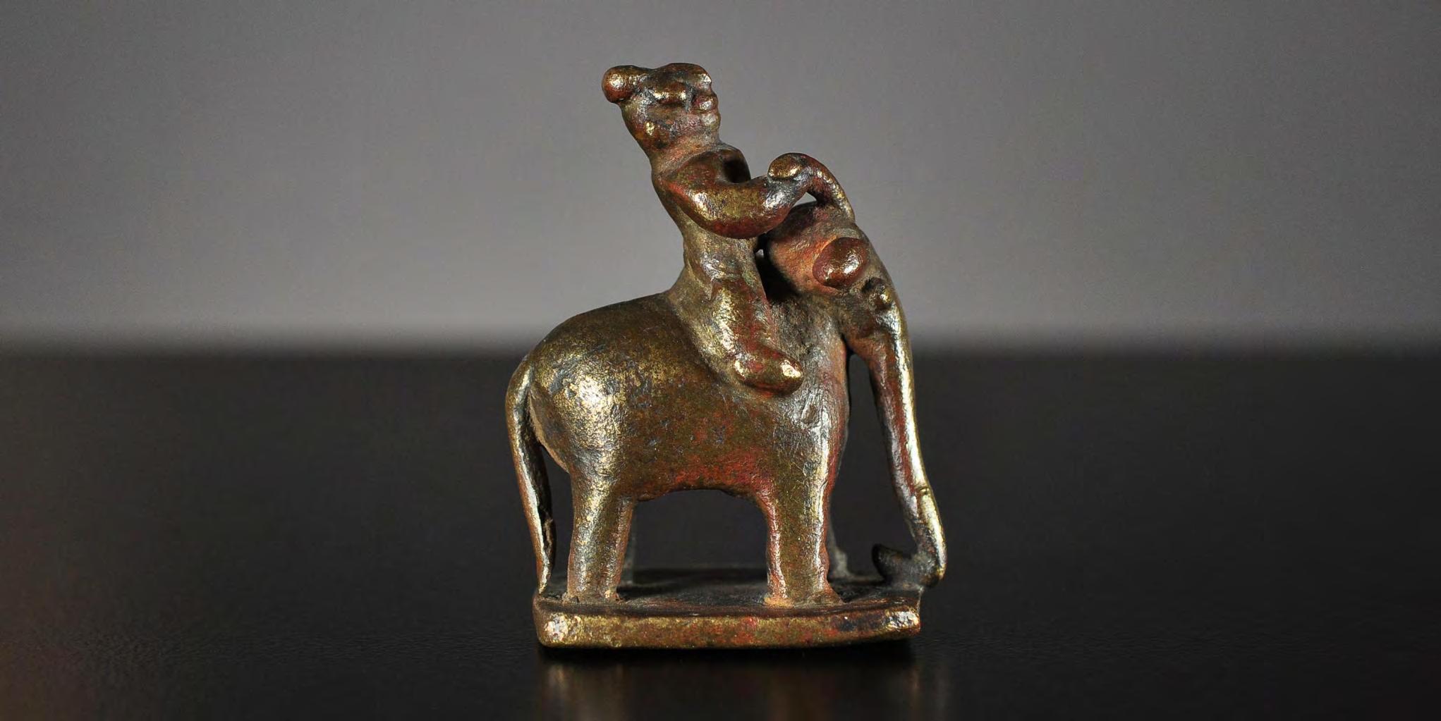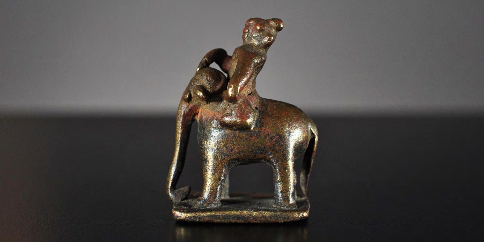 A miniature figure of a mahout astride an elephant, made of bronze or brass. Possibly the Hindu god Indra with his elephant Airavata is depicted here.