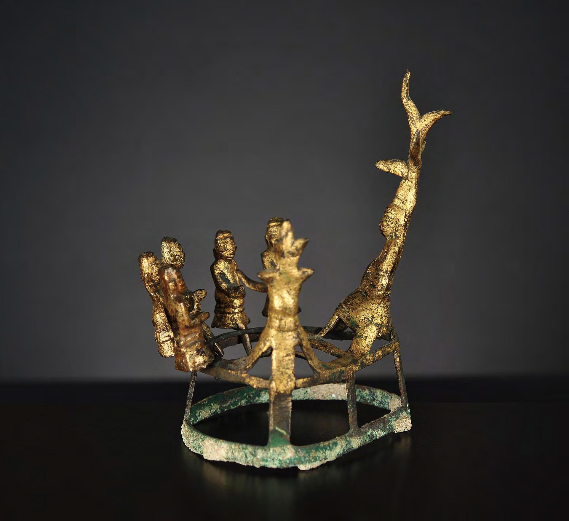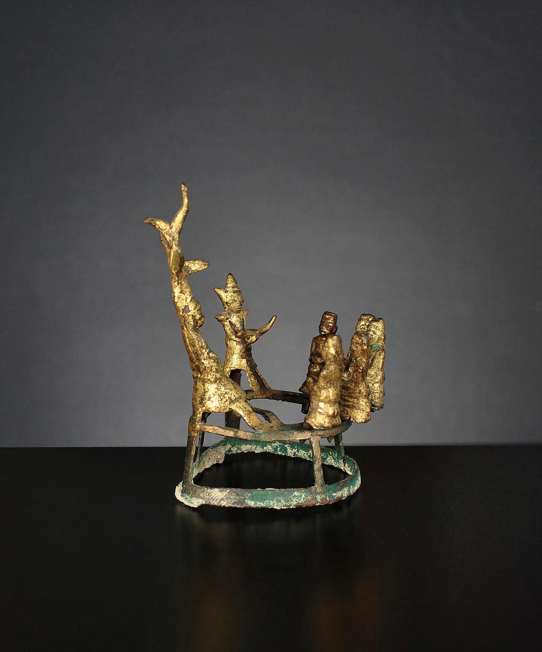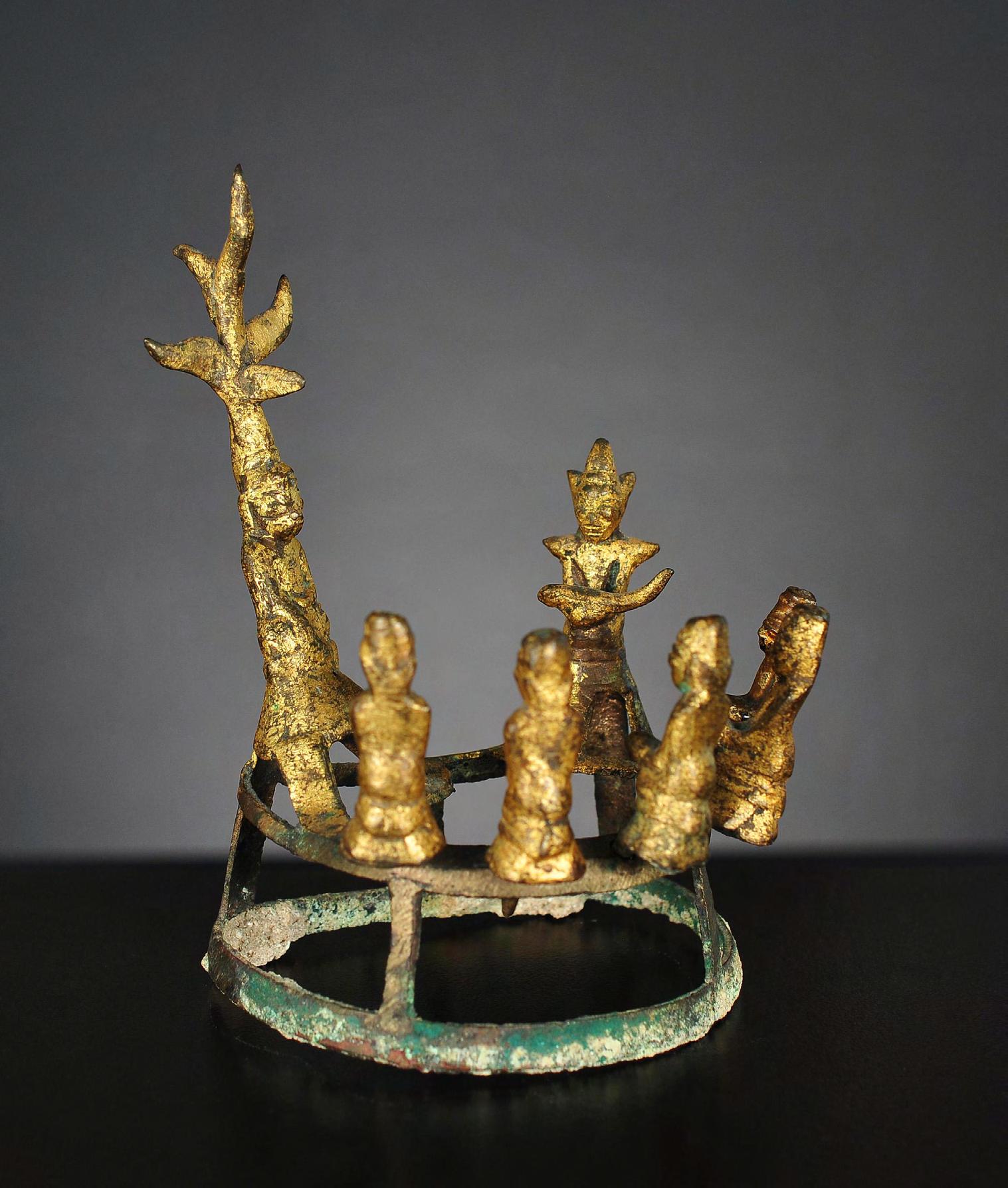 These small works of metalsmiths from the Shan States are rarely offered. They depict the main stations of the life of the Buddha. These lacquered, gilt metal objects were used as votive offerings to be sealed in the walls of newly build pagodas. The Buddha and the Nat are fixed, the worshippers hang loosely to the ring.