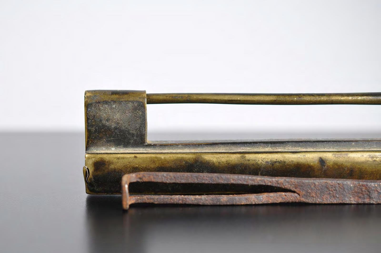 condition: very good condition with extensive wear, remnants of black coating, natural copper patina