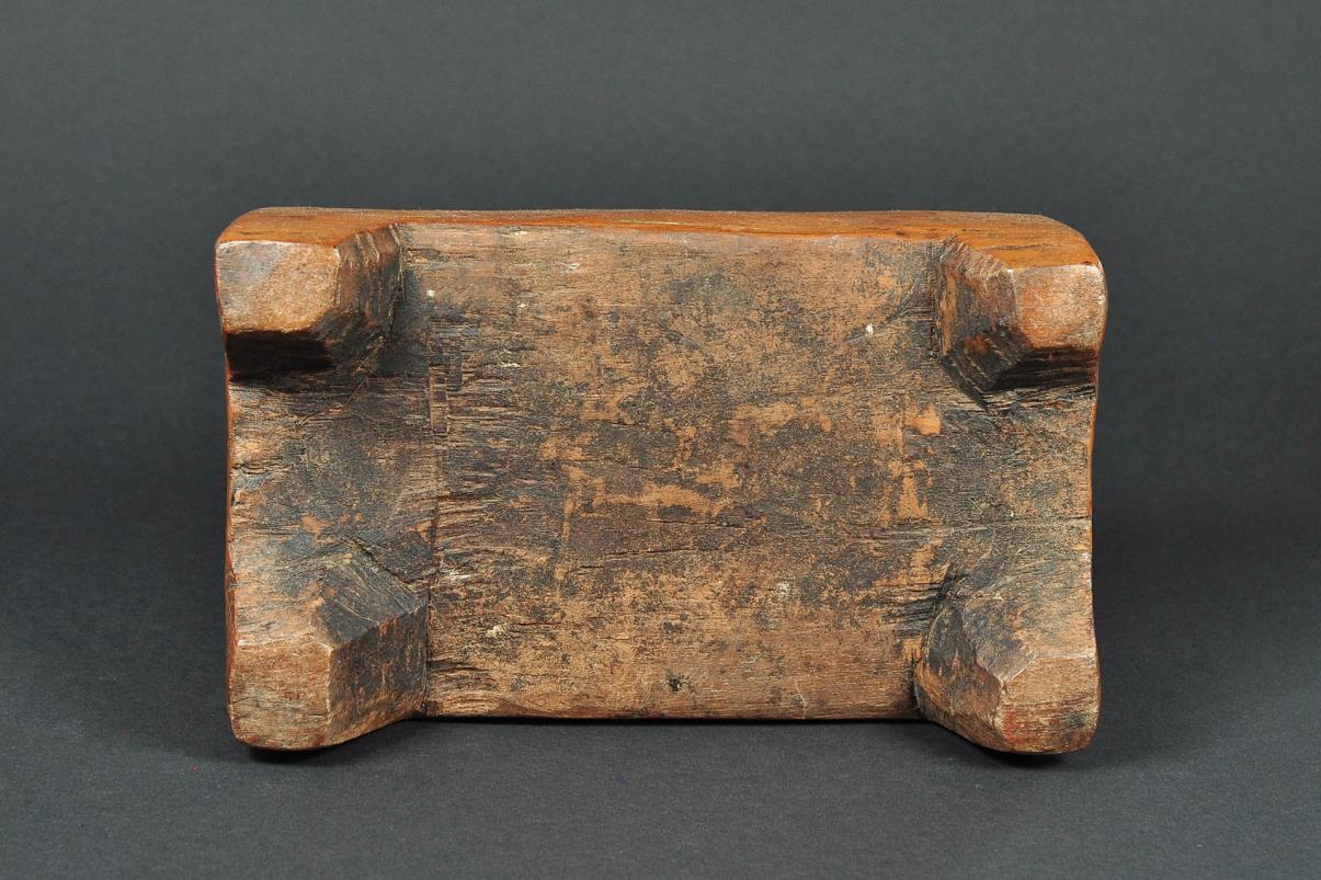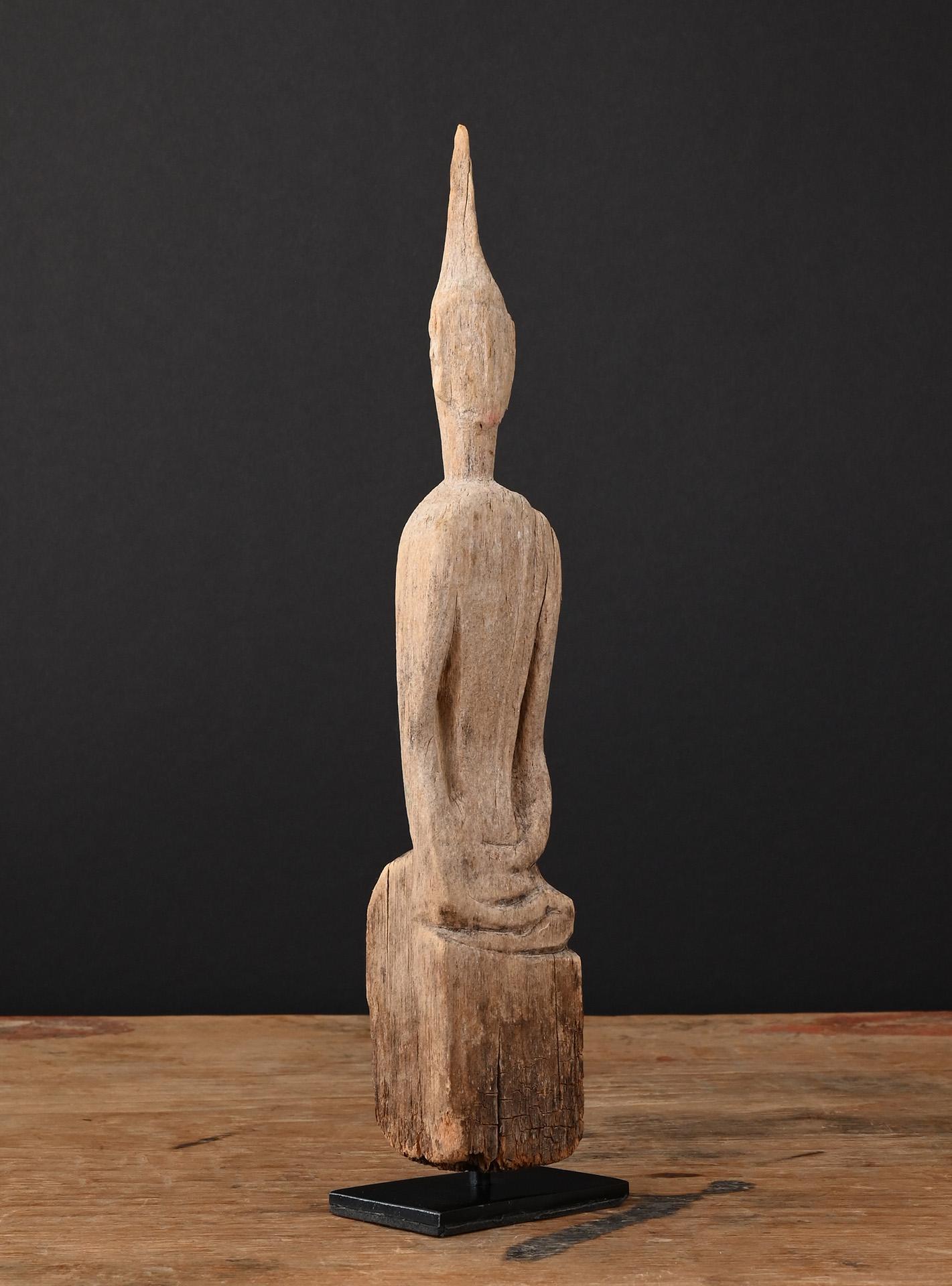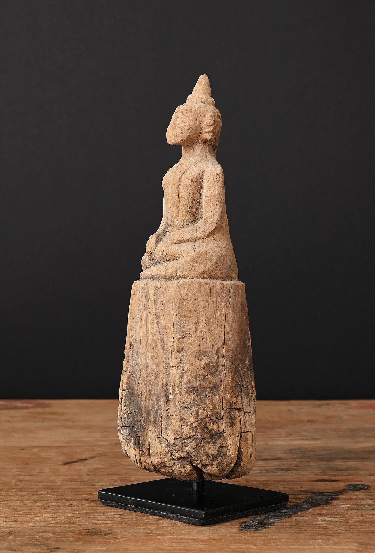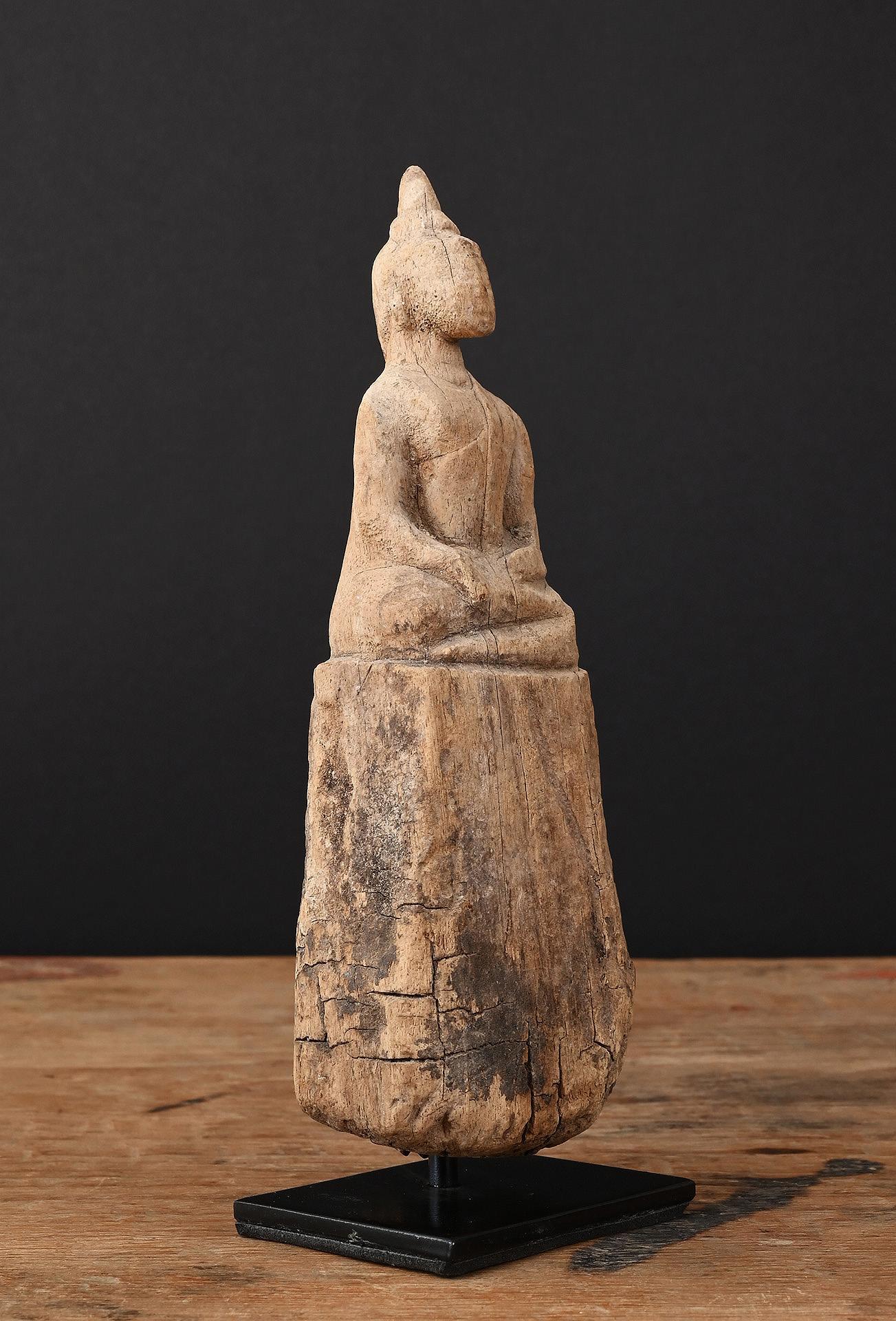 This small wooden Buddha image shows extensive weathering, giving the statue a special charm. Obviously the statue has been placed somewhere outside, exposed to the elements for many decades.