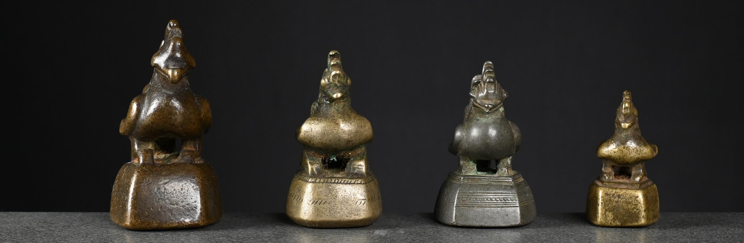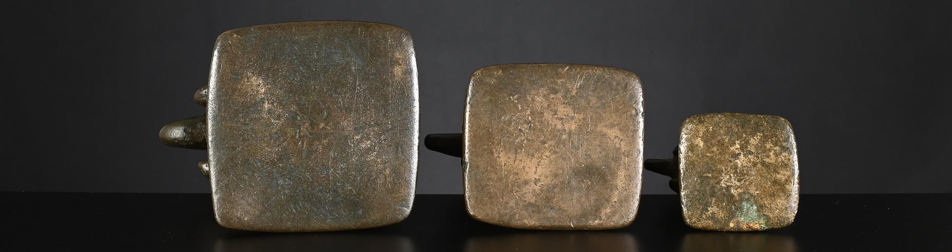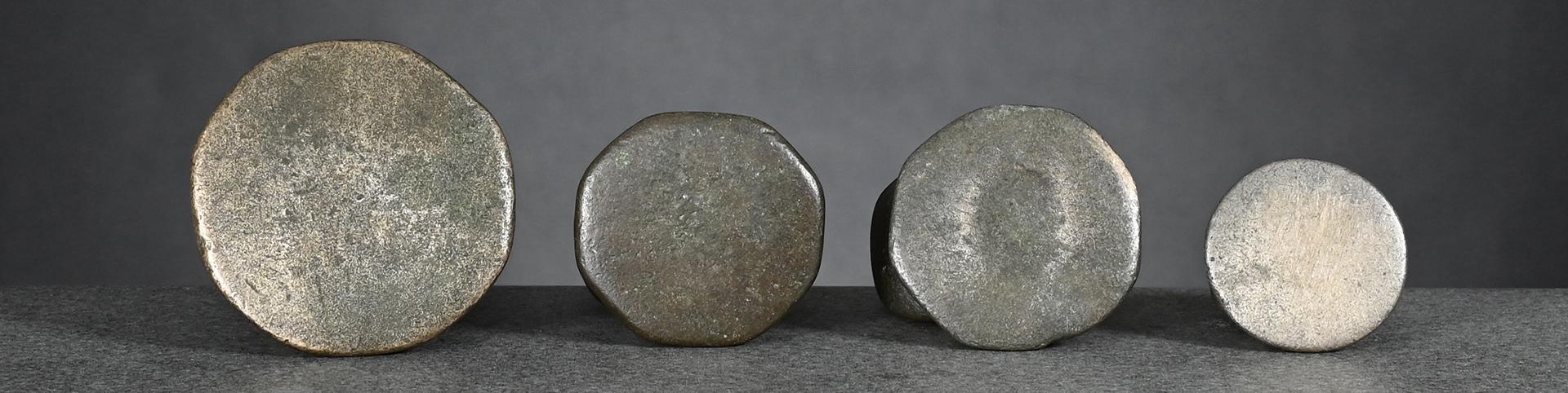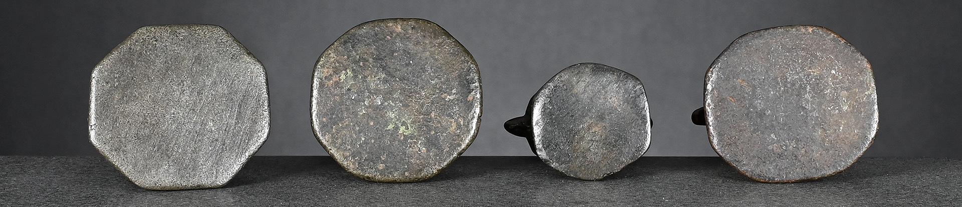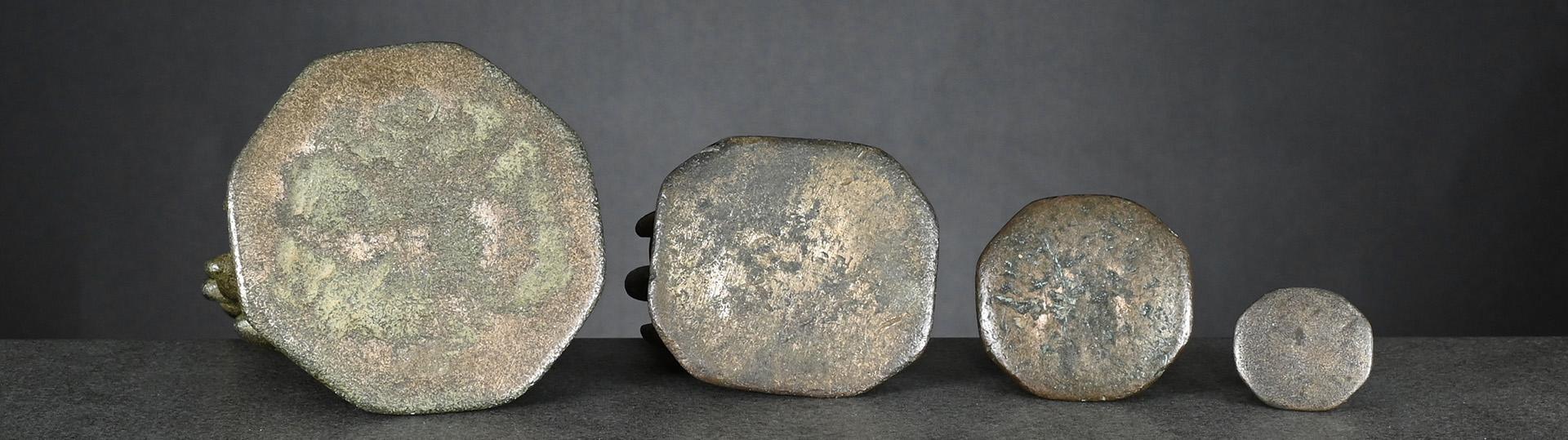 The two bronze weights, left one and centre right, issued pre-1900 and both brass weights, centre left and right, later, between 1900 and before 1925.