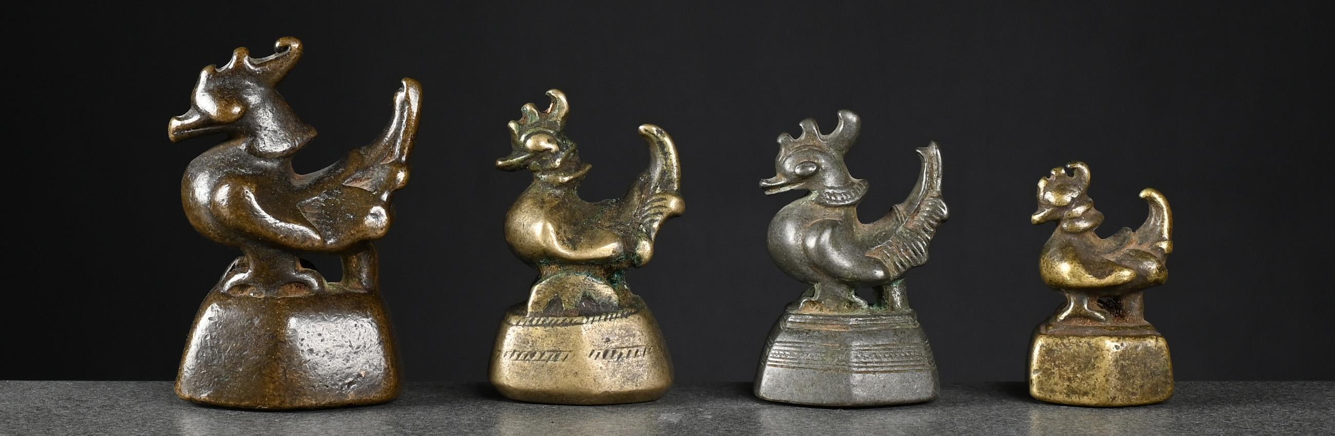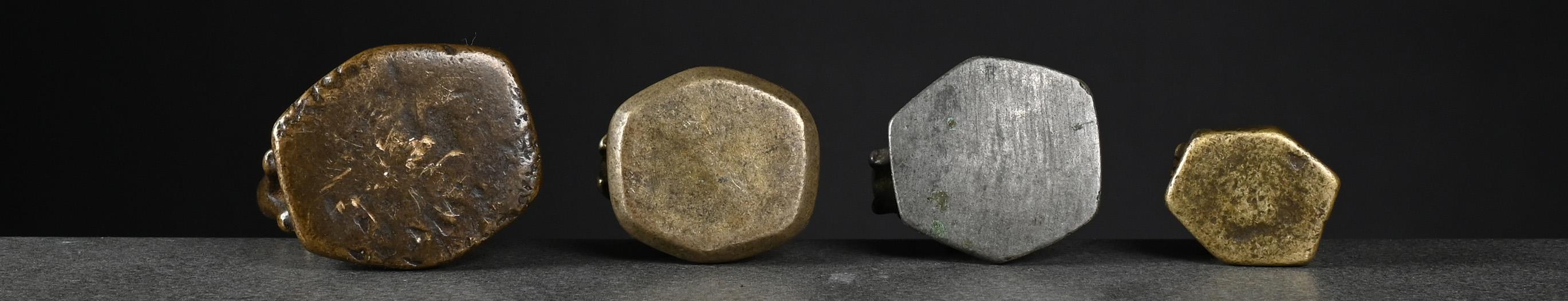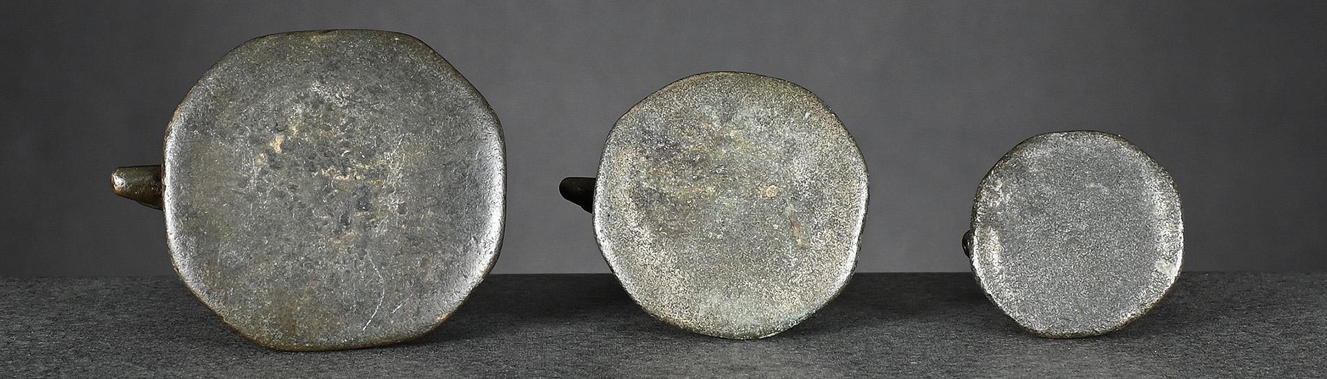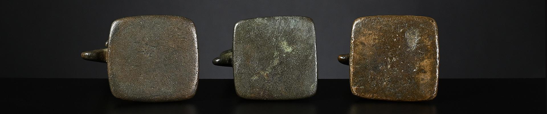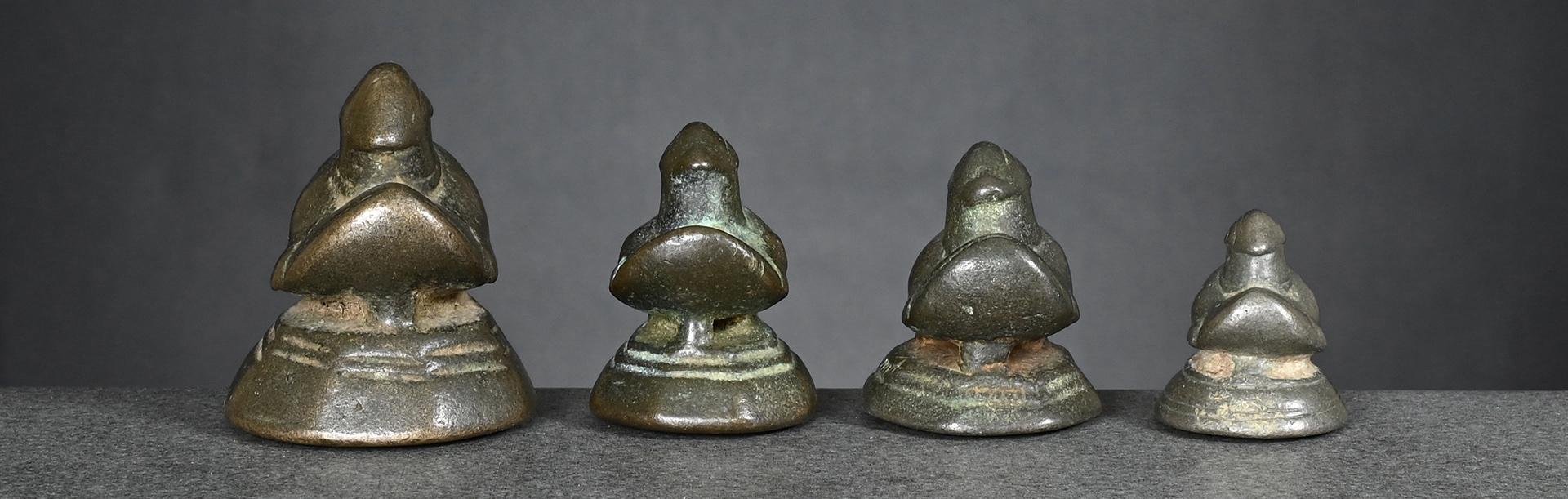 The two bronze weights, left one and centre right, issued pre-1900 and both brass weights, centre left and right, later, between 1900 and before 1925.