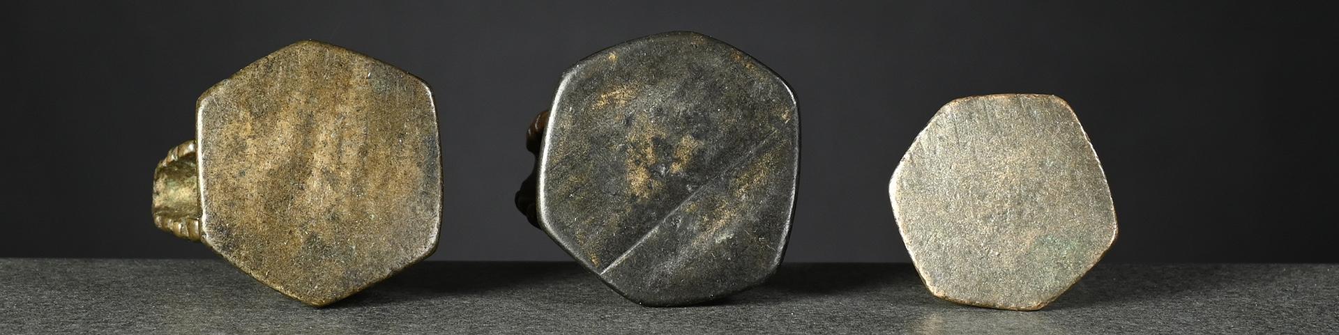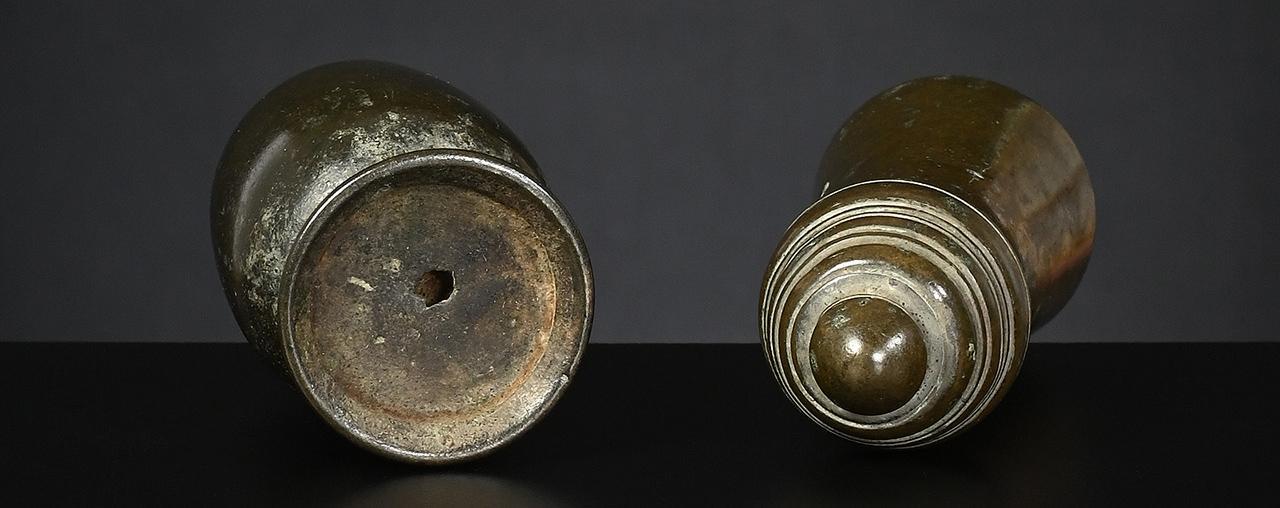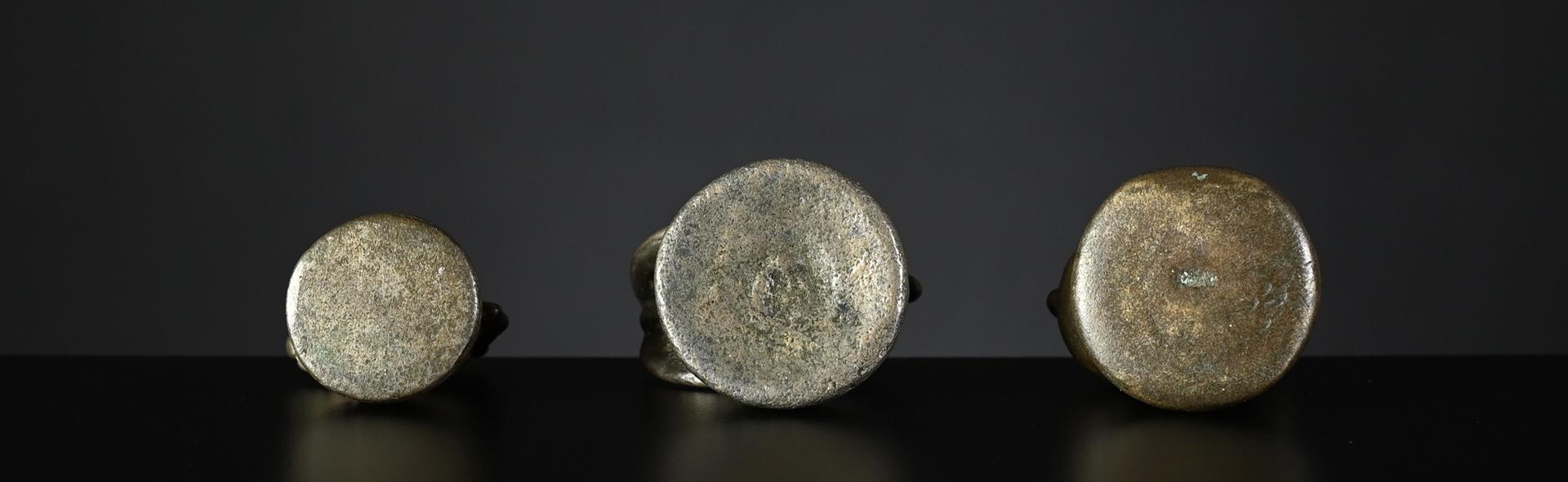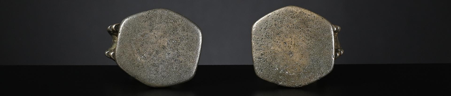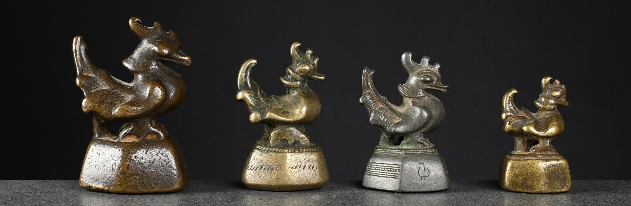 The two bronze weights, left one and centre right, issued pre-1900 and both brass weights, centre left and right, later, between 1900 and before 1925.