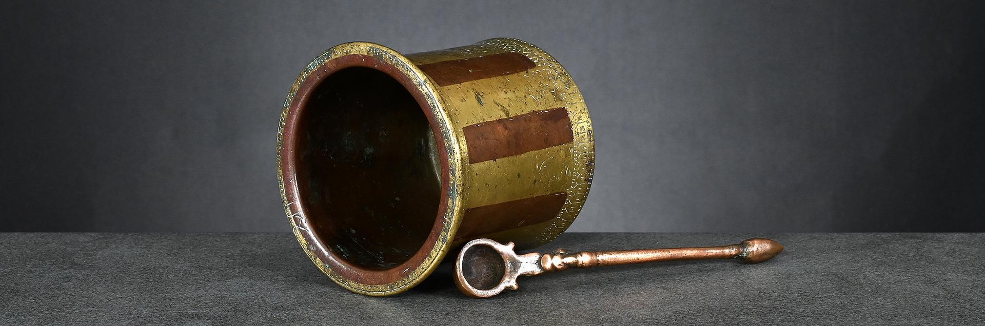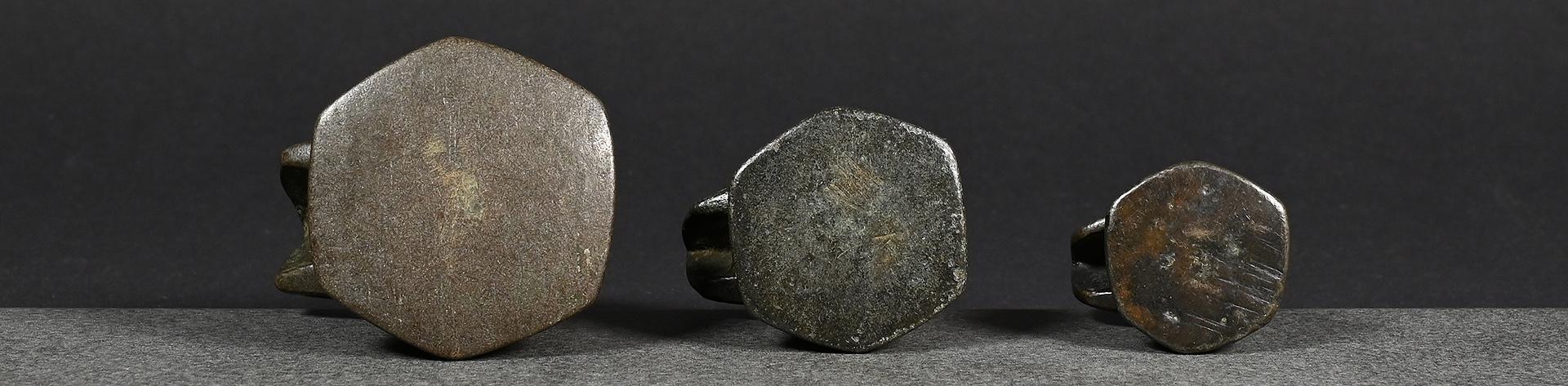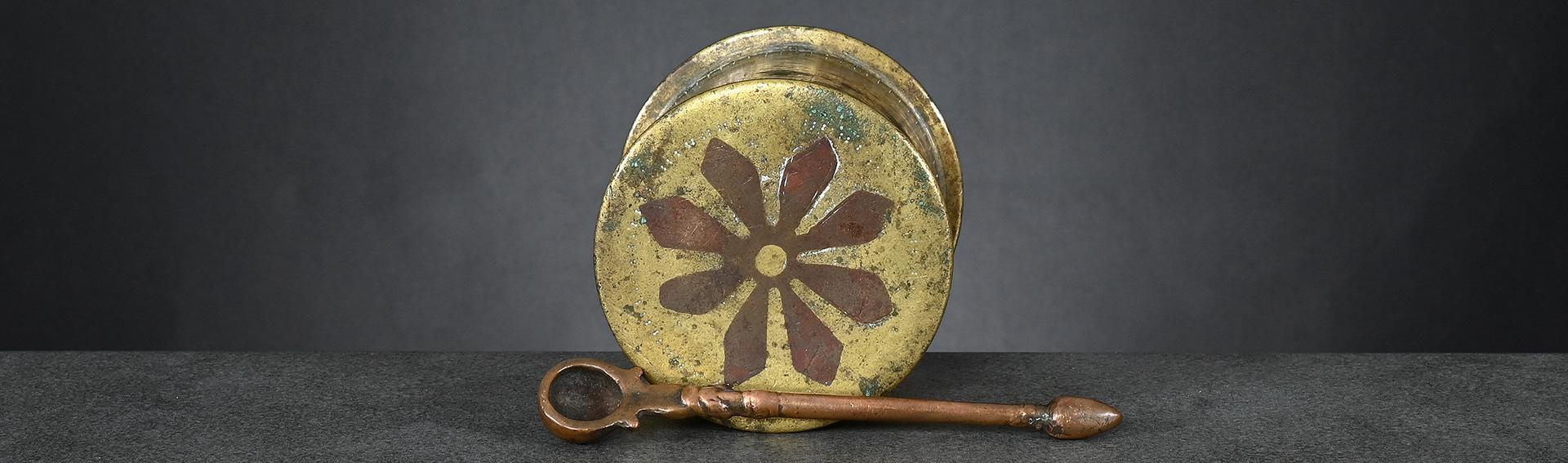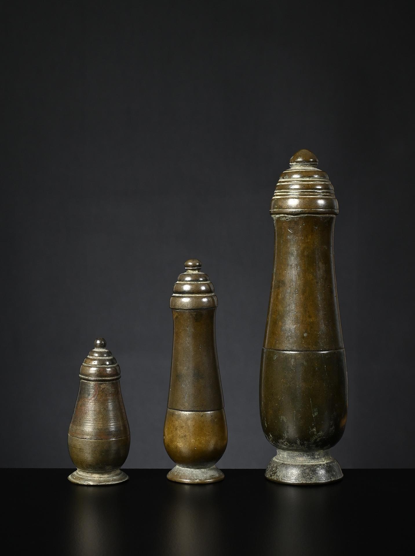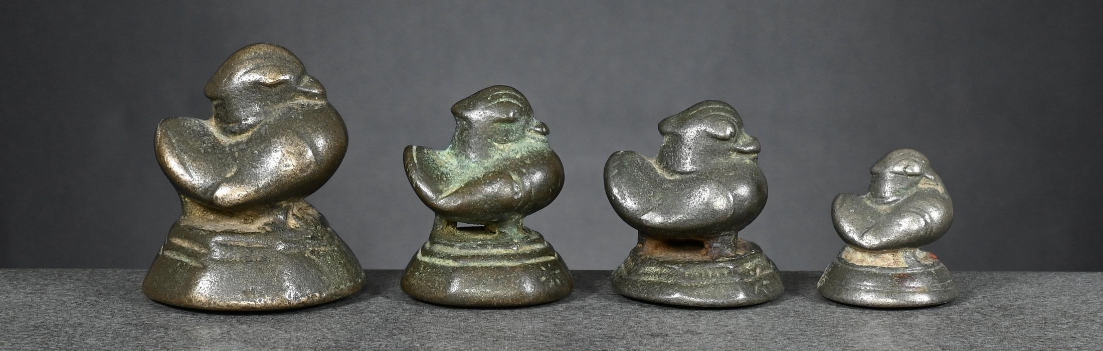 The two bronze weights, left one and centre right, issued pre-1900 and both brass weights, centre left and right, later, between 1900 and before 1925.