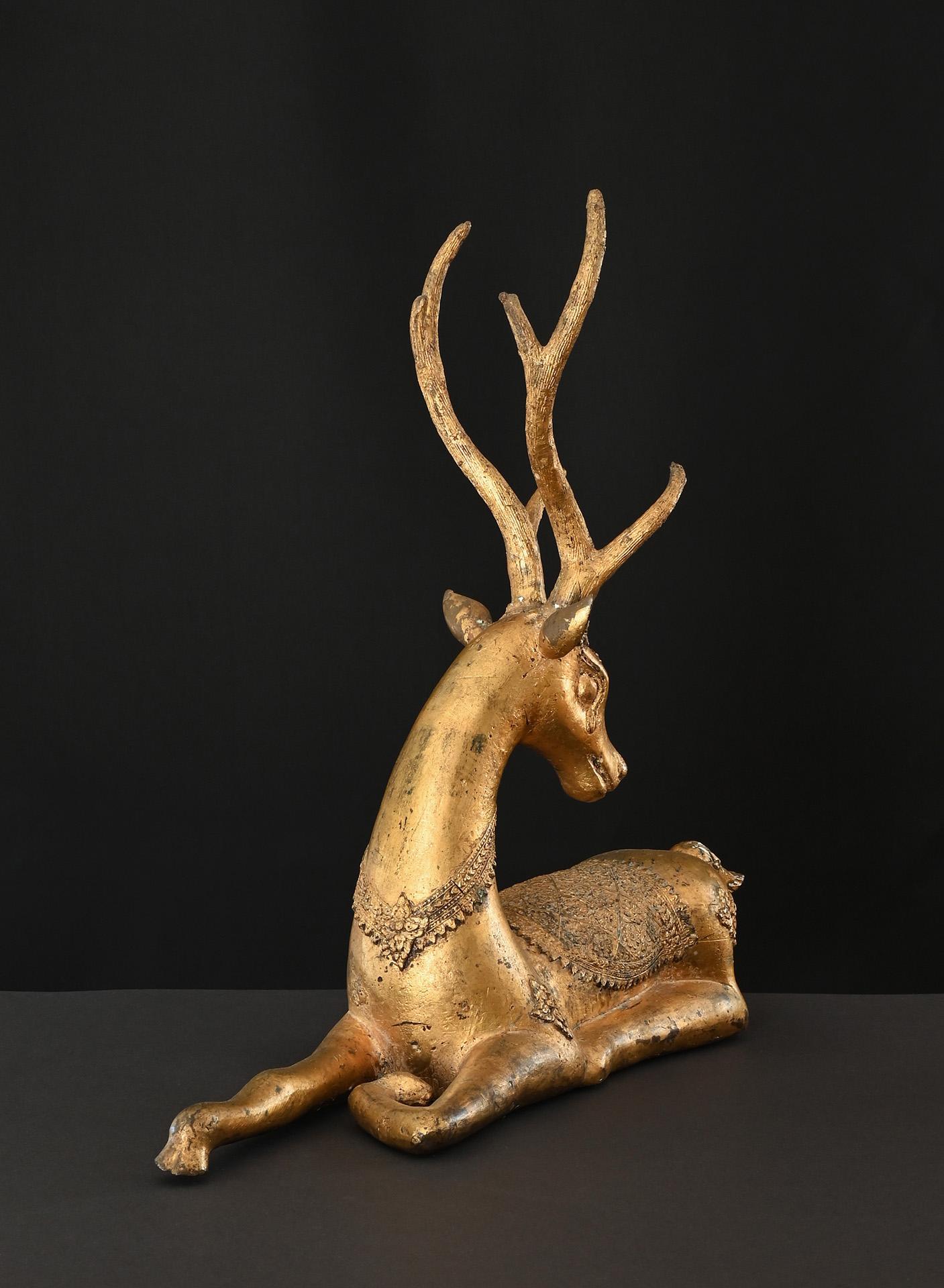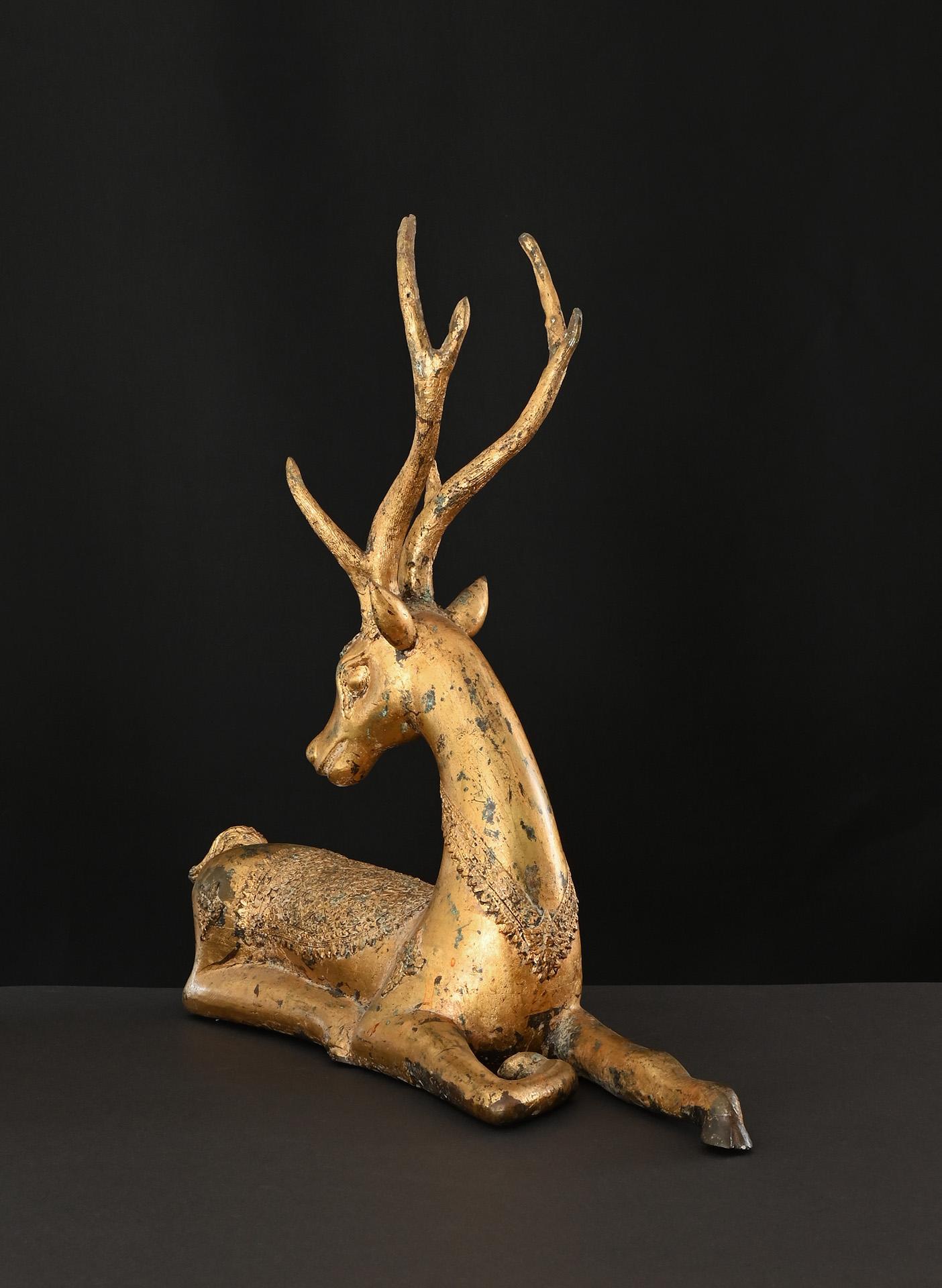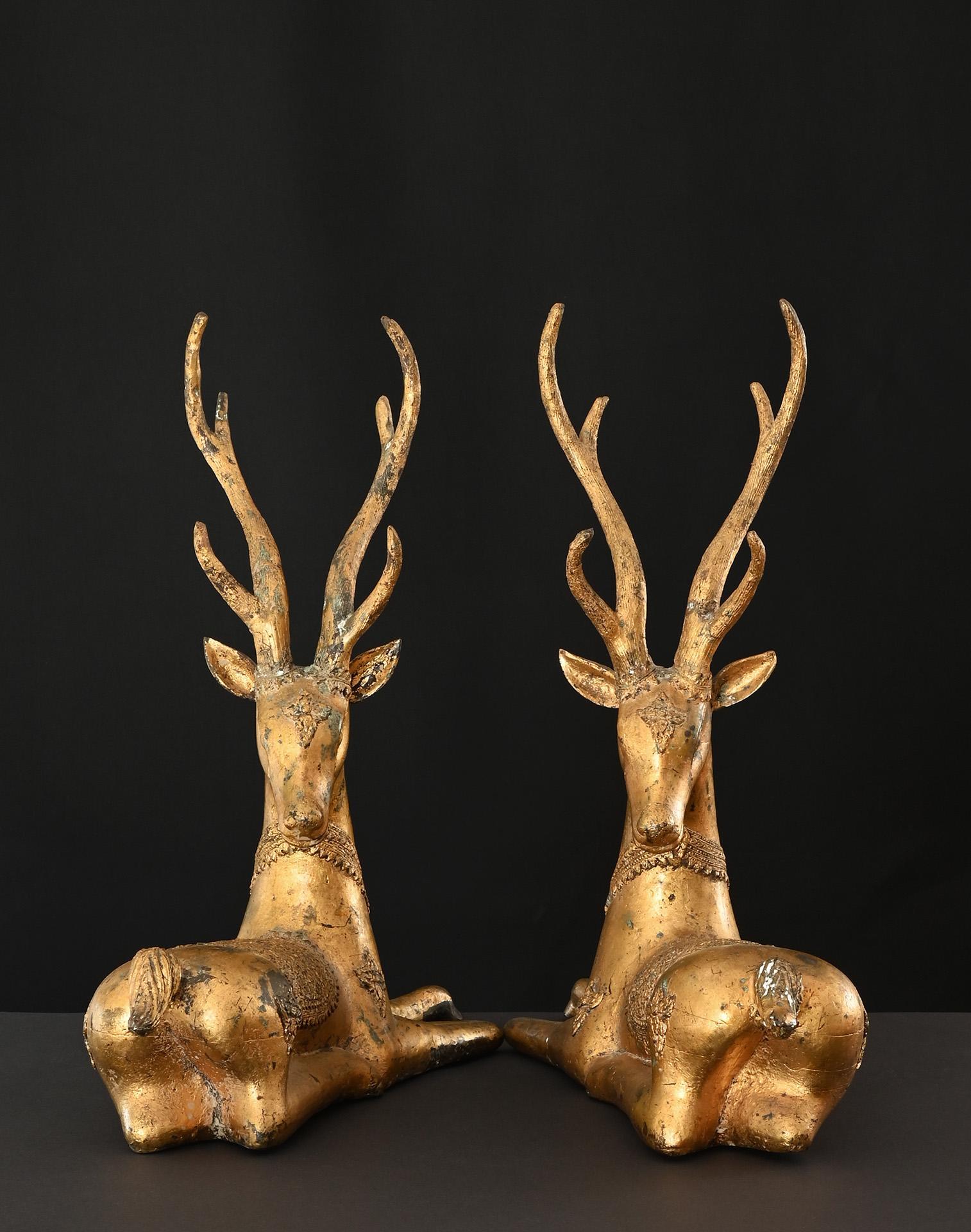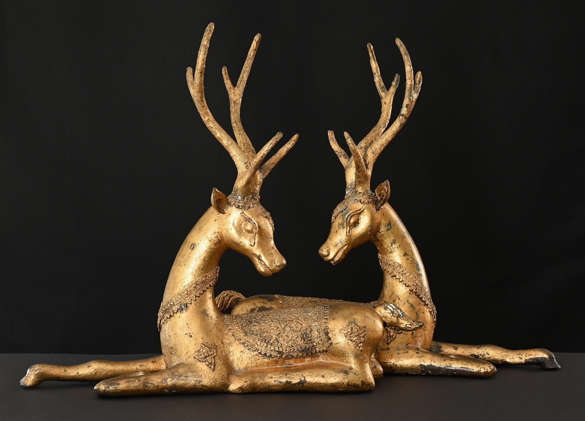 An impressive pair of gilt bronze statues of recumbent sika deers, decorated in the typical Rattanakosin style of the 19th century. The sika deer is closely associated to Buddha’s famous Sermon in the Deer Park at Sarnath, where the Buddha initiated his teachings.