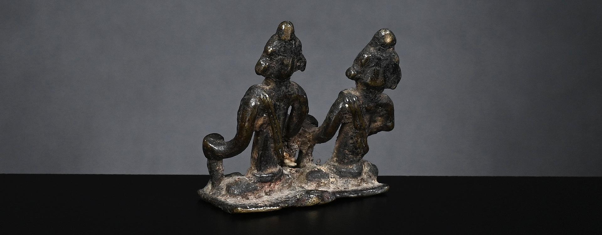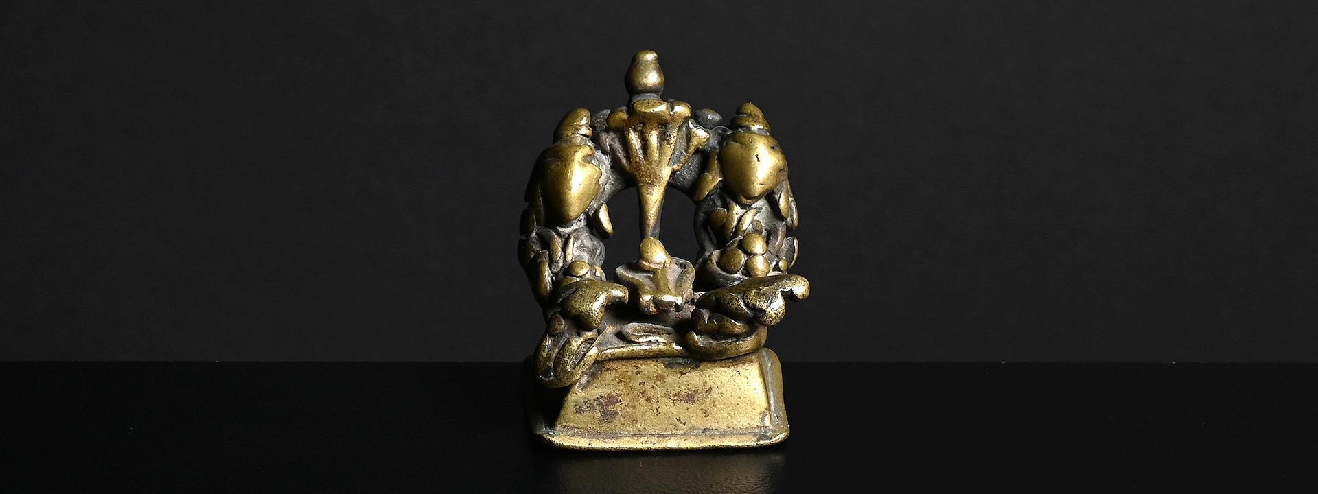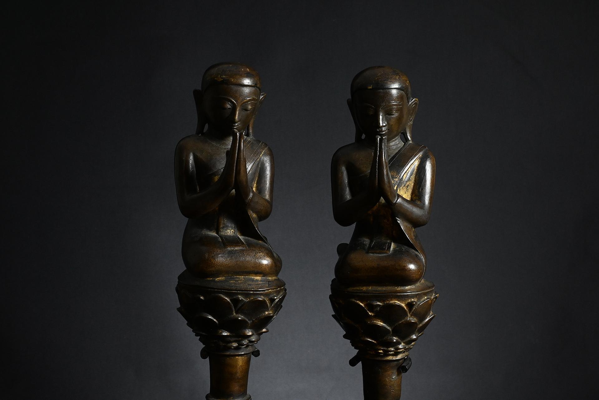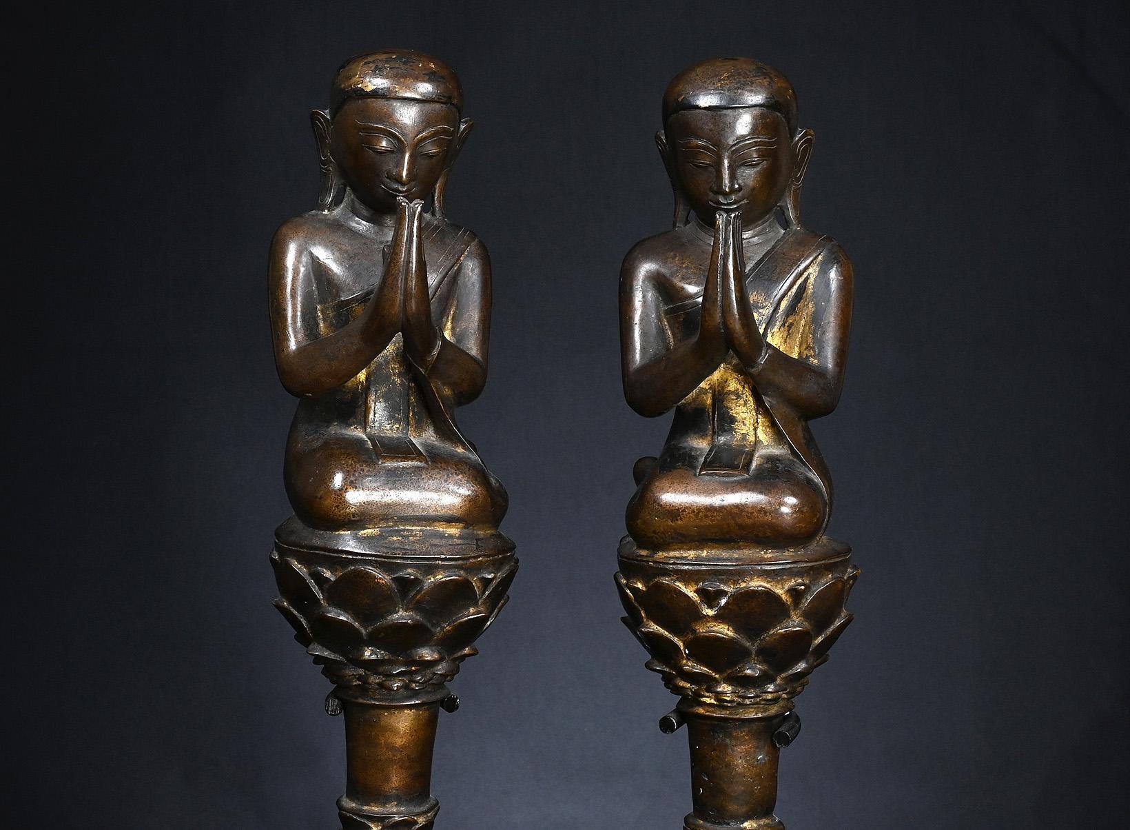 A very expressive representation of two adorants of the Buddha, seated on a throne in the shape of a lotus flower. The delicately modelled faces with downcast eyes emanating great serenity. Warm bronze patina with rich traces of gilding.