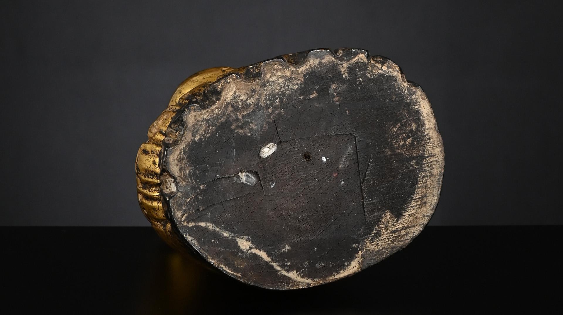 The Buddha statue, seated cross-legged in bhumisparsha mudra, is made of lacquered wood with traces of gilding. The oval face turned downwards. With custom-made stand.