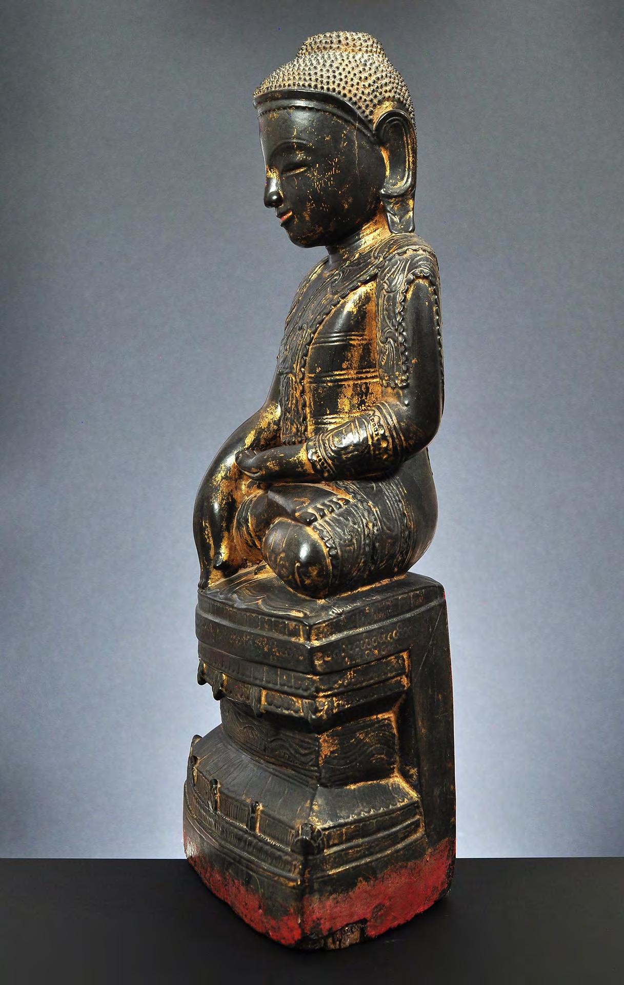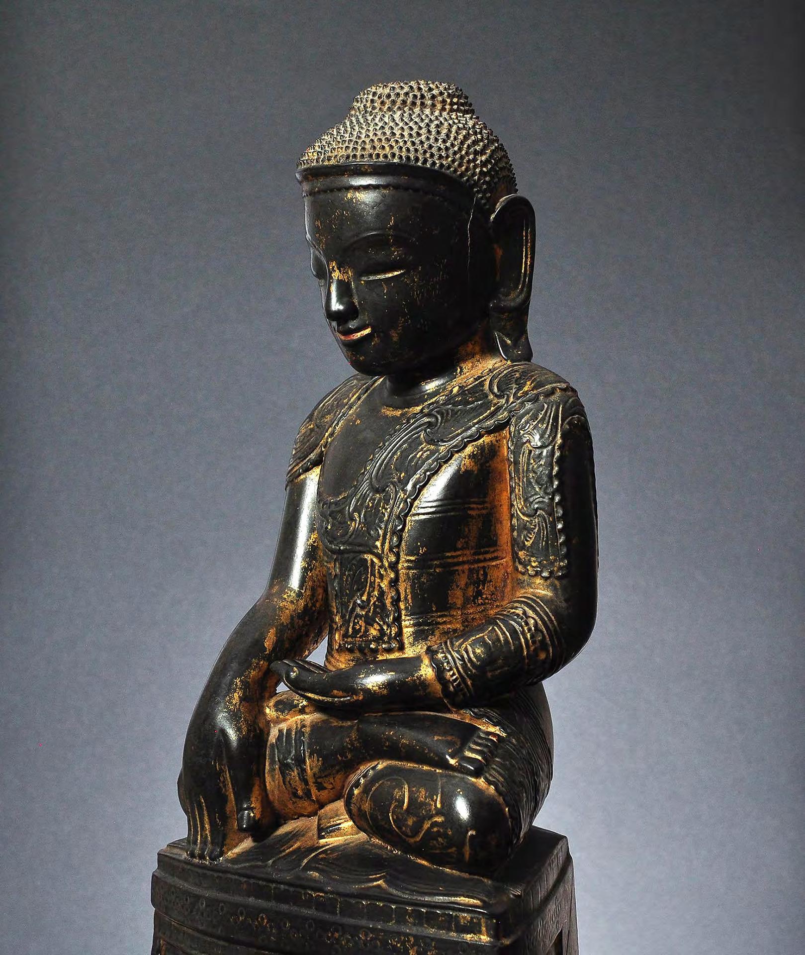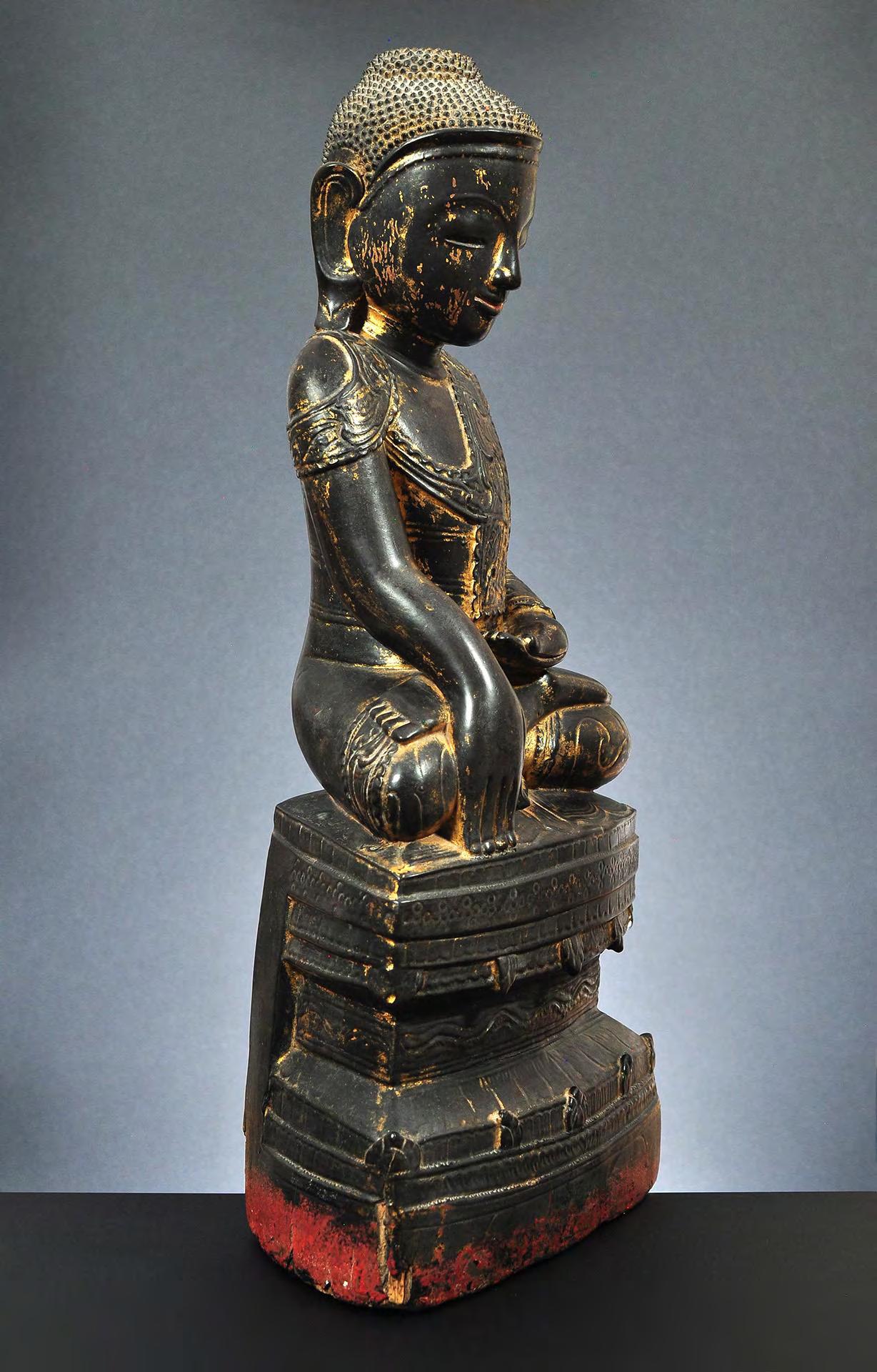 1 Seated wooden figure of Buddha Shakyamuni, lacquered and gilded, late Amarapura, Burma, mid-19th century