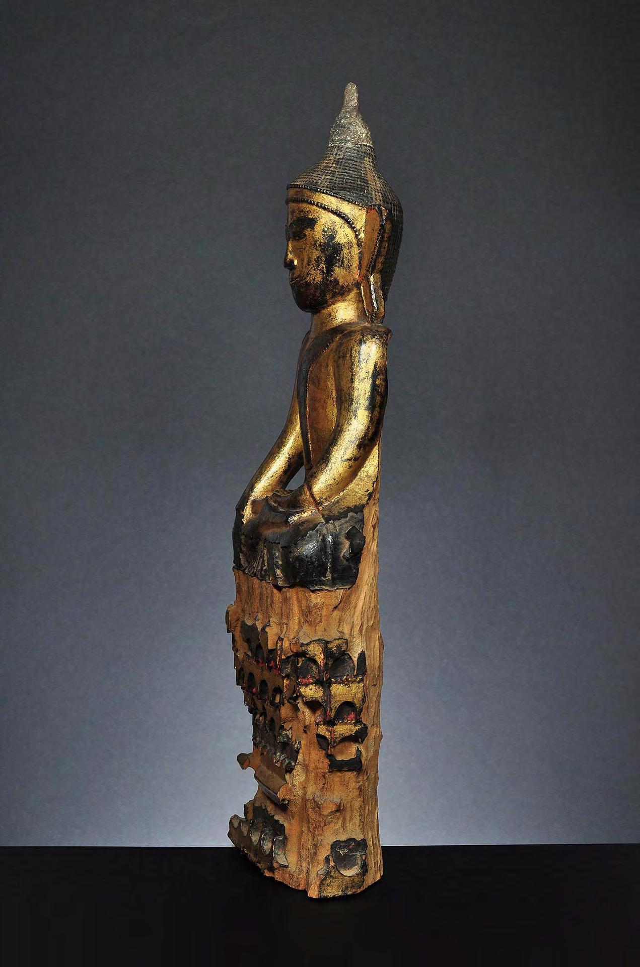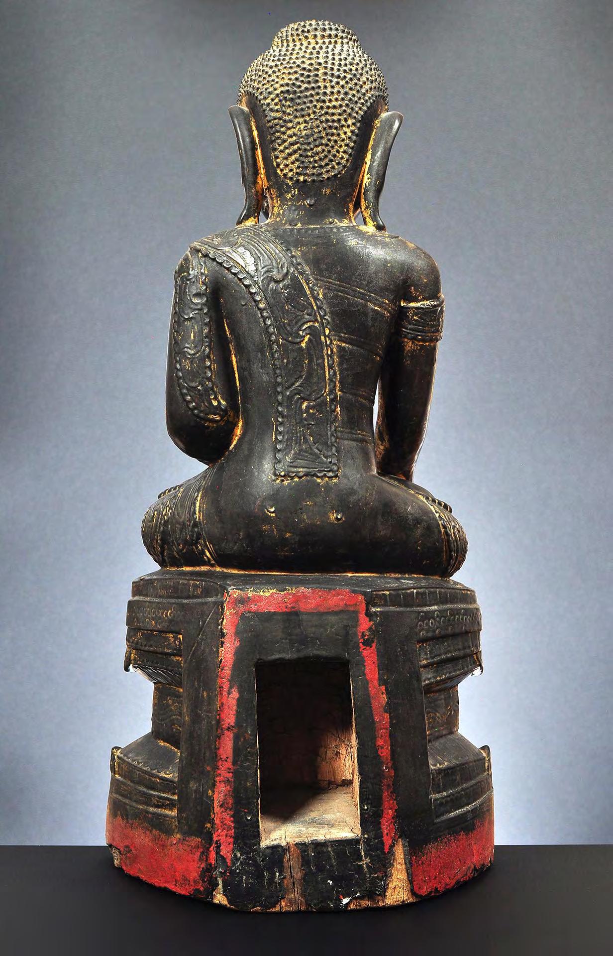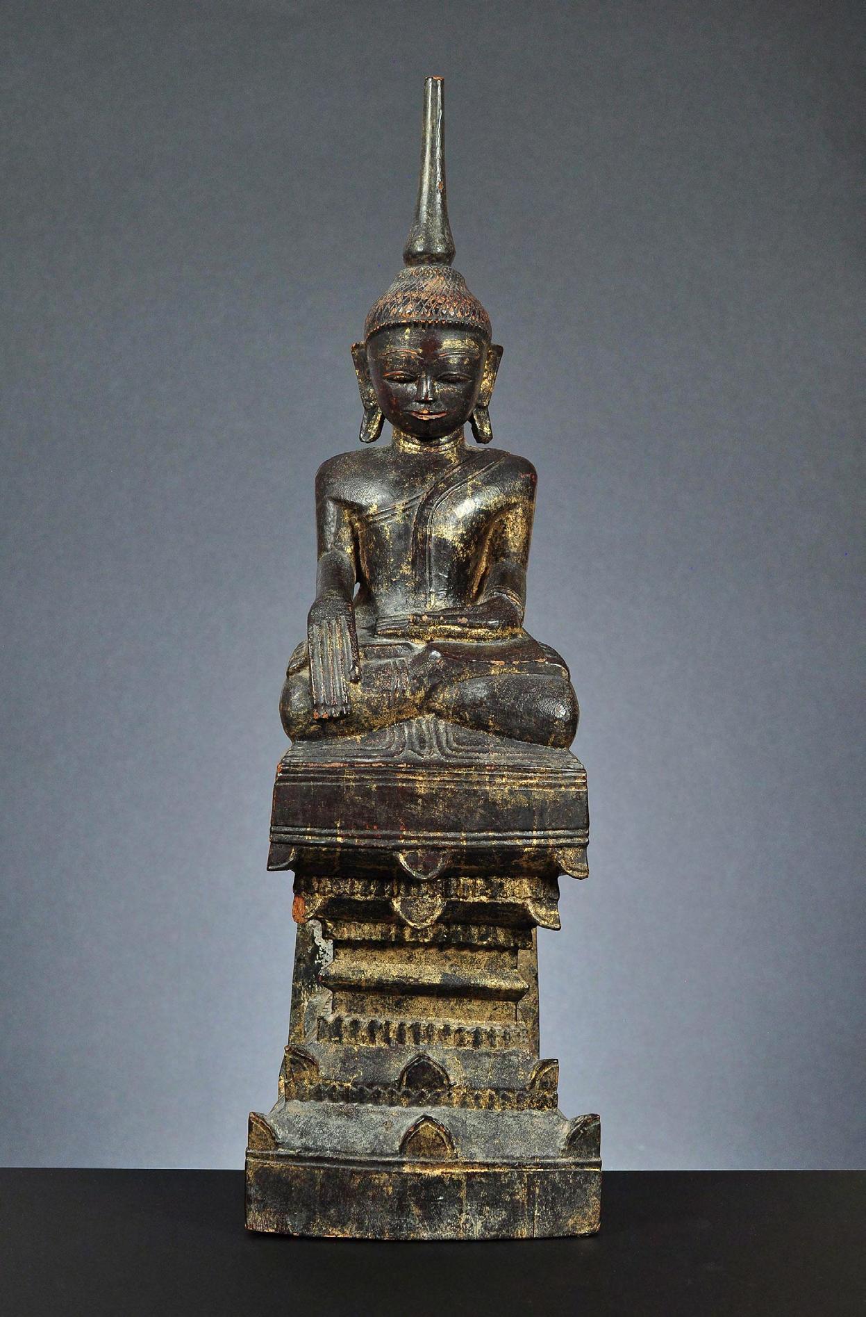 1 Seated wooden figure of Buddha Shakyamuni, lacquered and gilded, late Amarapura, Burma, mid-19th century