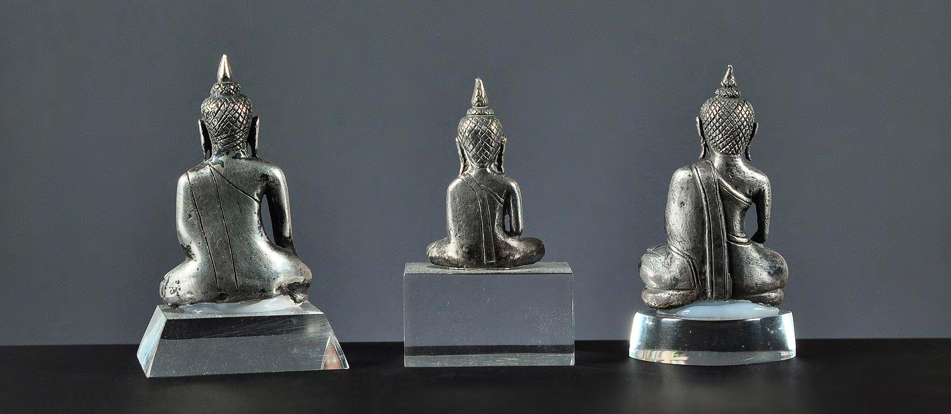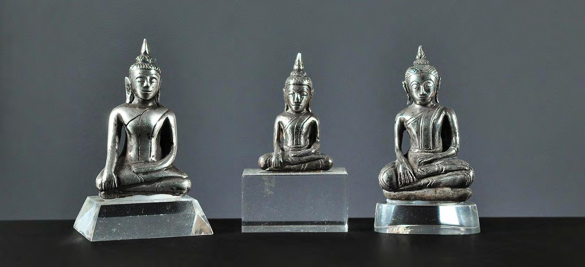 Three small figurines of the seated Buddha in half lotus position, each with the right hand in bhumisparsha mudra, made of high-grade silver.