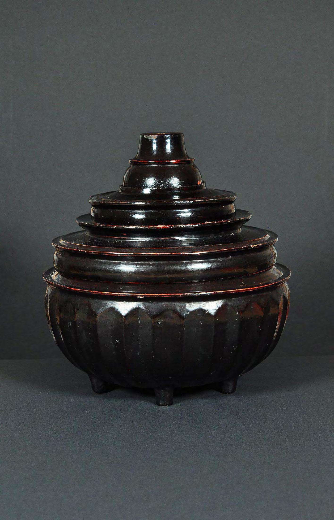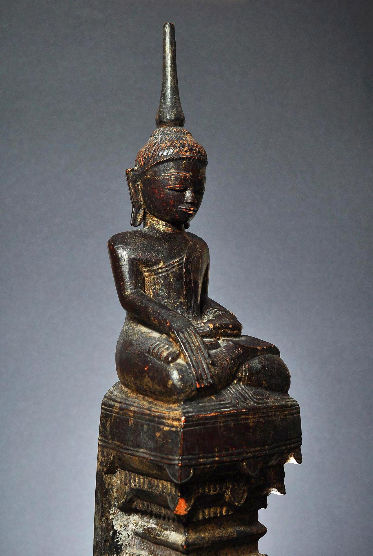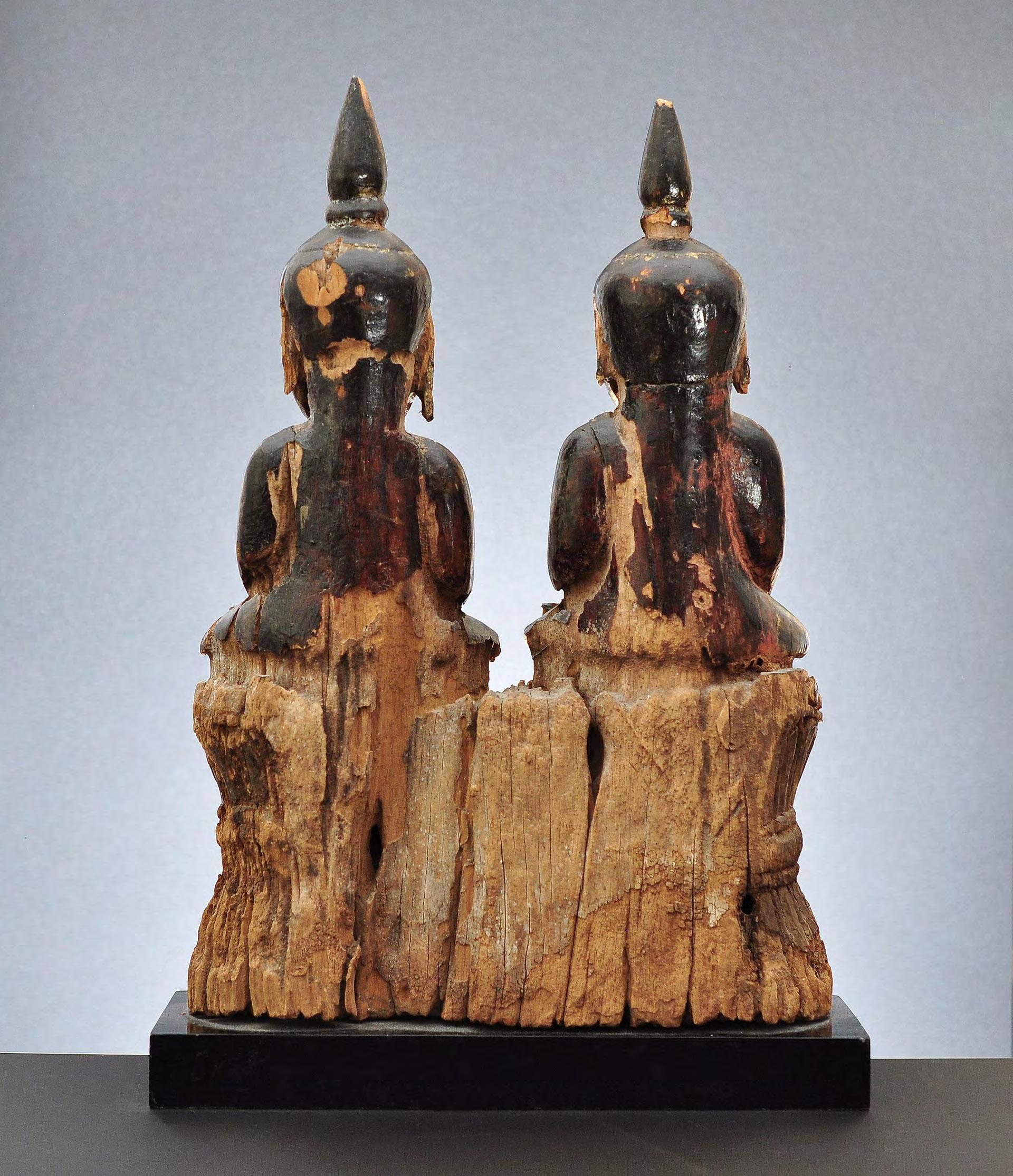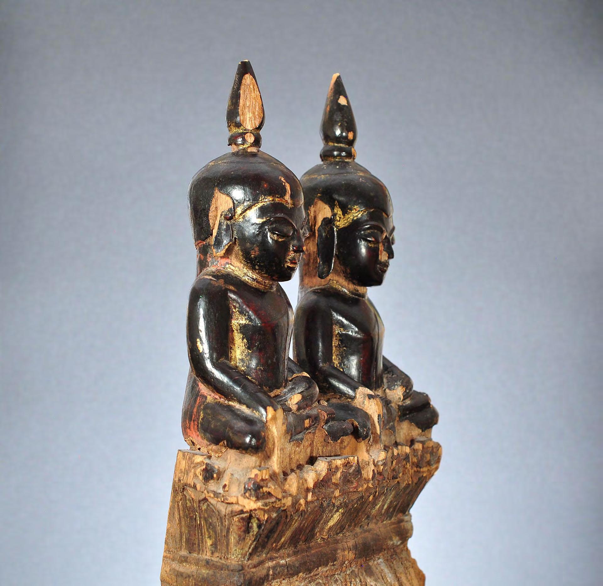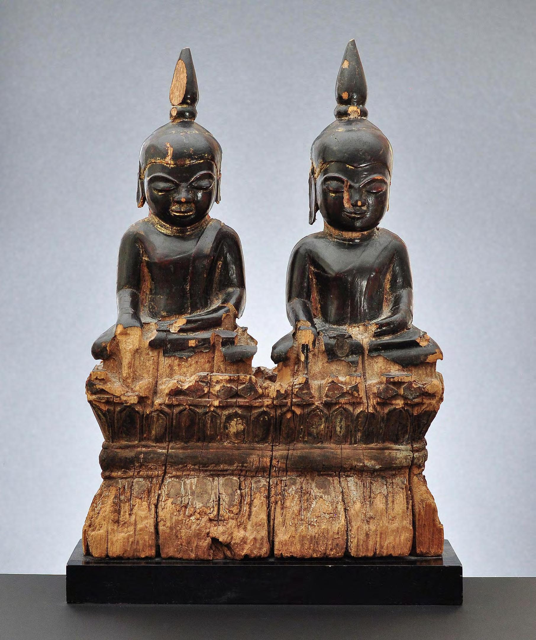 Very rare image of the present and the future Buddha, seated on a double lotus throne, very likely from Mon State. Images from the Mon State often depicted with plain head, similar to Buddha statues from Bagan. Black lacquered wood with remnants of gilding.