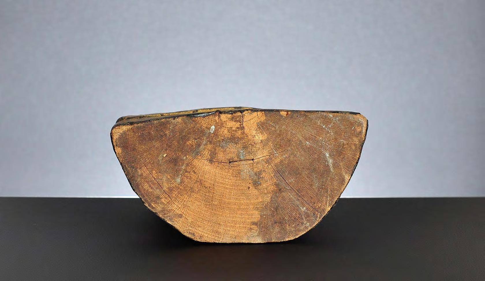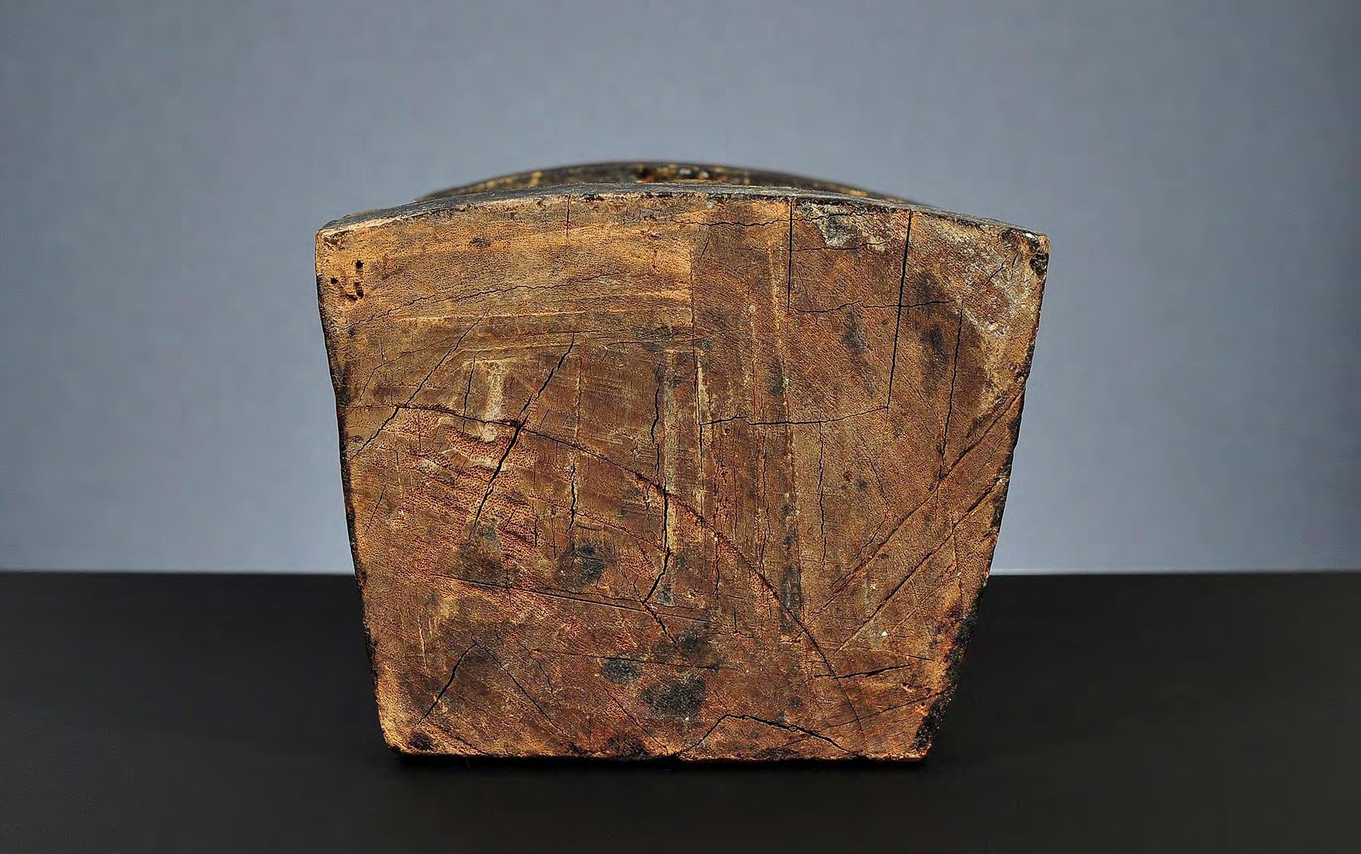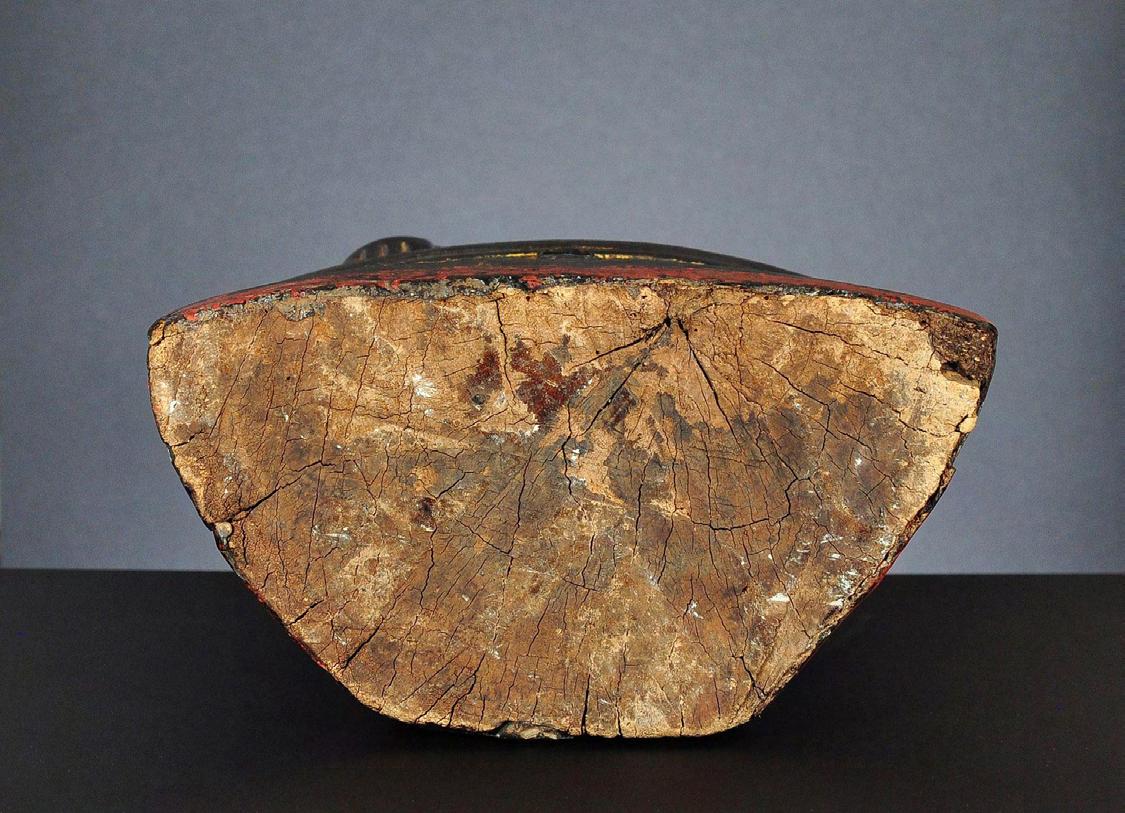 condition: weathering, extensive wear, loss of wood and lacquer, top of the ushnisha/flame roughly repaired