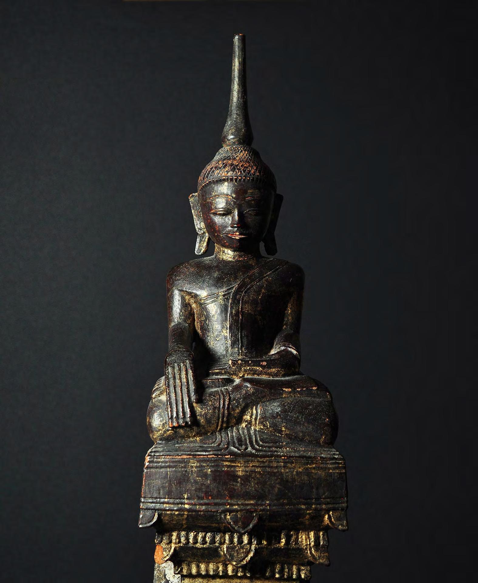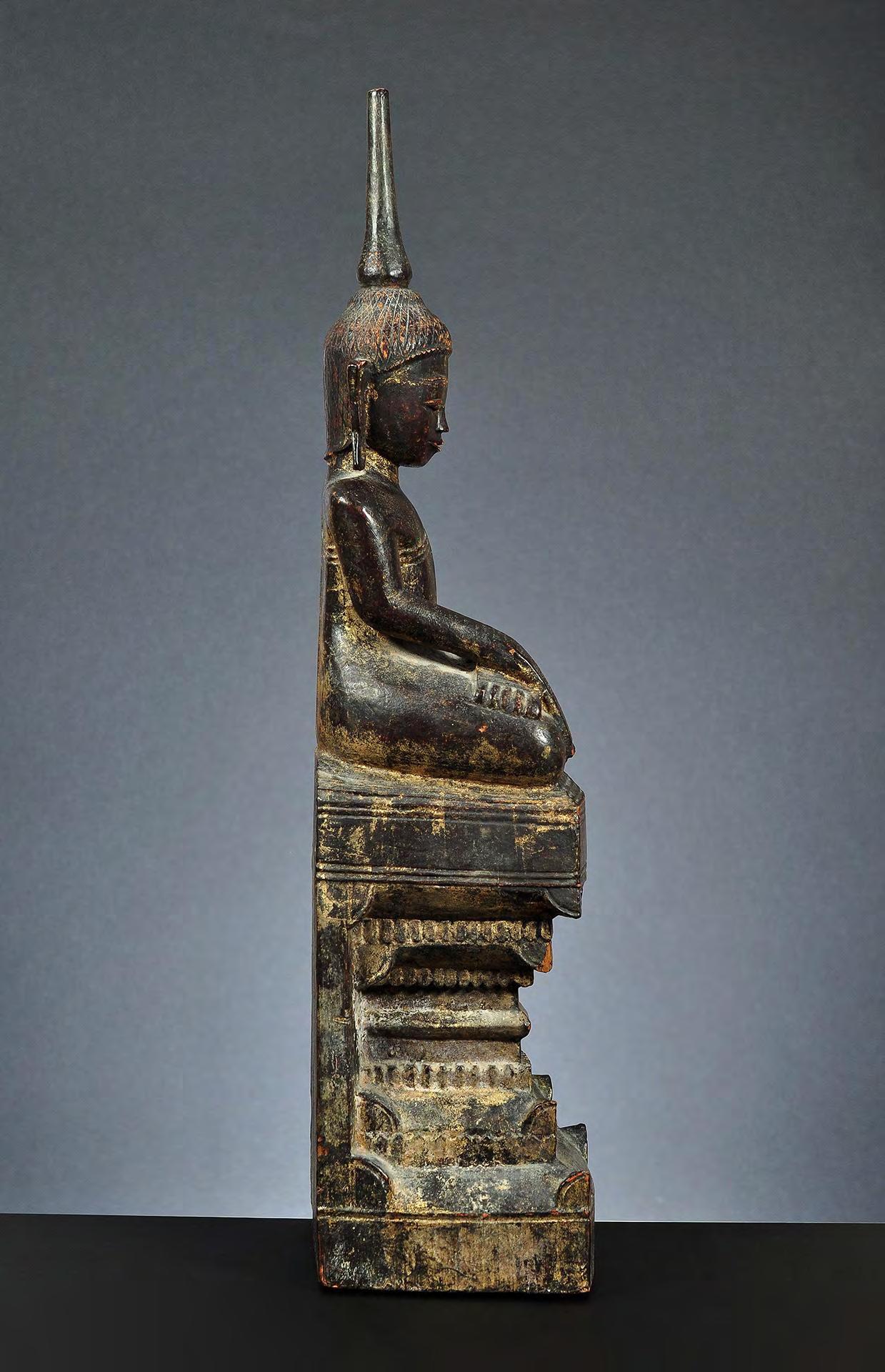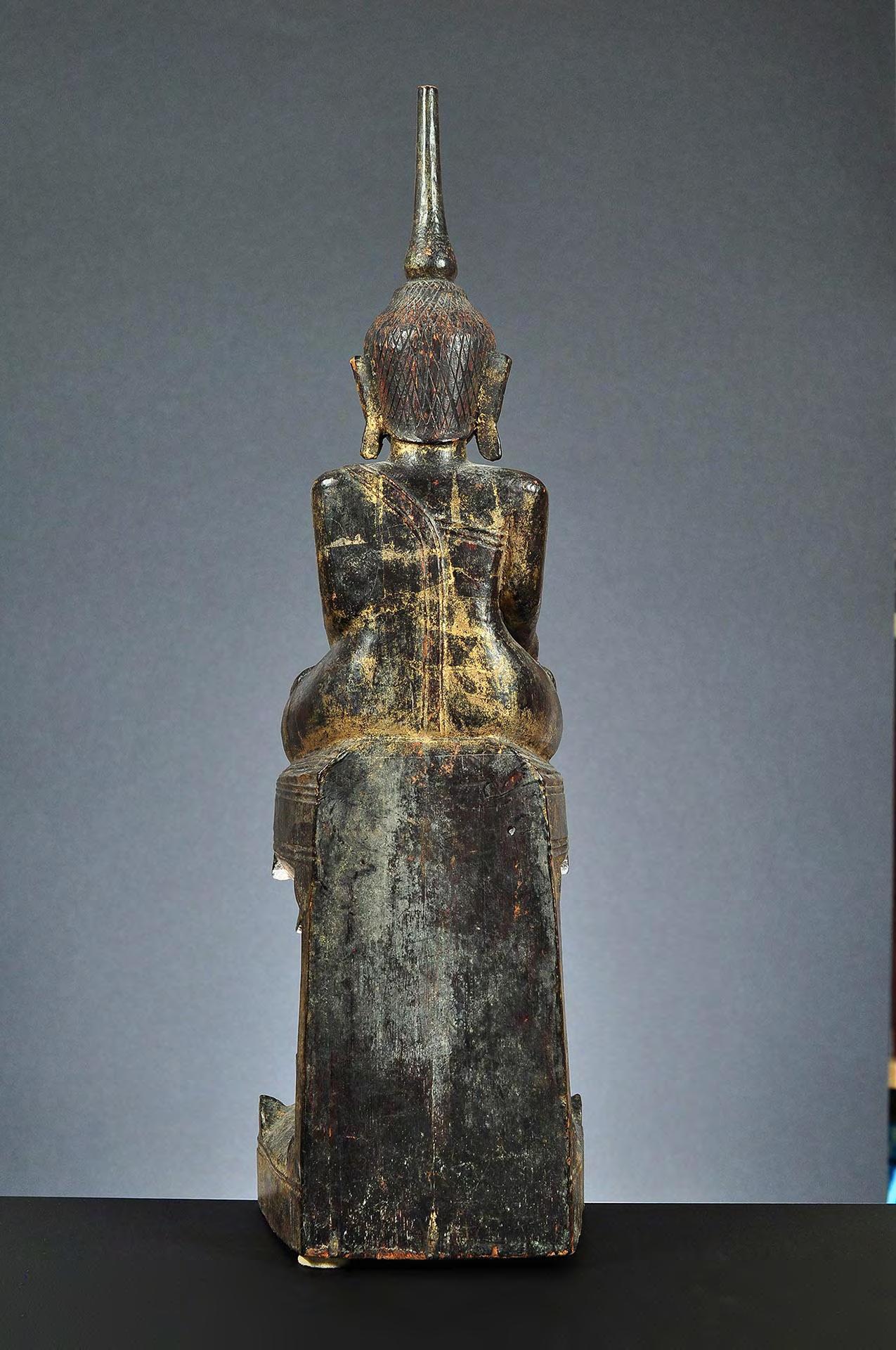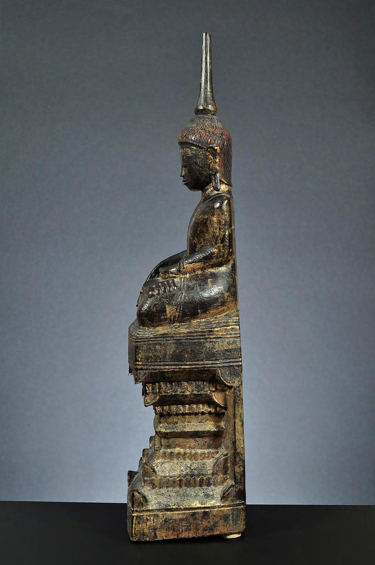 Despite the partly extensive wear, this tall wooden image of the seated Buddha is a rare excellent example of Laotian Buddhist art. In particular the remaining throne decoration is finely detailed.