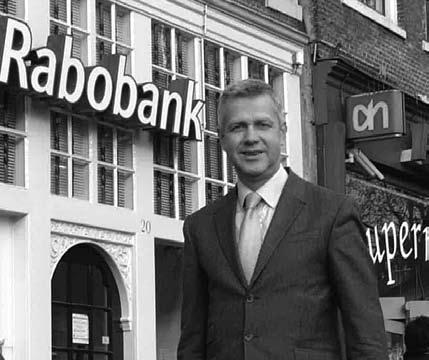 n omdat ik voor een bank werk die van oudsher gebaseerd is op samenwerking wil ik ook een goede band met de buurt opbouwen. De Rabobank heeft geen aandeelhouders, maar leden. Wij staan dus als van nature met beide benen midden in de samenleving, de bank is er een onderdeel van. Dit is geen verkooppraatje, maar een reëel feit dat er onder meer voor heeft gezorgd dat de RABO zich goed staande wist te houden tijdens de kredietcrisis van 2008. Zij behoort nu tot de sterkste banken ter wereld. Voor de leden is continuïteit doorslaggevend en niet het maken van snelle winsten, zoals voor aandeelhouders vaak wel geldt. Het geld dat wij beheren is van onze leden en daar moeten we zorgvuldig mee omgaan. Het mooie van mijn vak is dat ik overdag de bankier ben die particuliere en zakelijke financieringen beoordeelt, klanten spreekt, hem of haar ook helpt om de financiele huishouding op orde te brengen, terwijl ik ’s avonds een maatschappelijke rol speel. Hoewel dat vaak ook door elkaar heen loopt. Om een voorbeeld te geven: ik was onlangs bij de Stichting Oudezijds 100, een fantastische organisatie die daklozen opvangt. De stichting heeft inmiddels de beschikking over 14 appartementen. Laatst ben ik er met leden langsgeweest en we kijken nu naar mogelijkheden om de stichting verder te ondersteunen.”