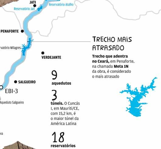 No momento, é o cenário mais atrasado do projeto. Está dentro da chamada Meta 1N, a primeira etapa de obras do Eixo Norte - tem 140 km e sai de Cabrobó (PE), passa por Terranova (PE), Salgueiro, Verdejante (PE), até Penaforte. Segundo o Ministério da Integração Nacional, a execução deste trecho chegou a 92,47%.