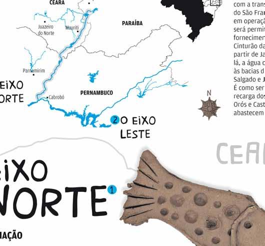 A cada especial, o desafio e o prazer de dar feição ao conteúdo. A identidade visual de mais este suplemento da série A Peleja da Água é moldada no barro, rastro simbólico do rio que chega às terras devastadas pela estiagem. Esse encontro delineia vidas, santos, bichos, imagens. Memória ancestral de onde viemos e pra onde vamos, em meio ao aparato do concreto e da tecnologia de uma mega-obra dessa natureza. Nesse cenário, convidei o artista plástico Carlus Campos para dar vida às esculturas deste suplemento. Paredes laterais em argila guiam o fluxo do conteúdo das páginas, orientam a navegação e registram, através dos desenhos no barro, as várias narrativas. A tipografia vernacular, em títulos e detalhes, dialoga e referencia um povo. Colunas de textos têm desenhos inspirados no canal que contorna chãos e traz a água. É a nossa tradução.