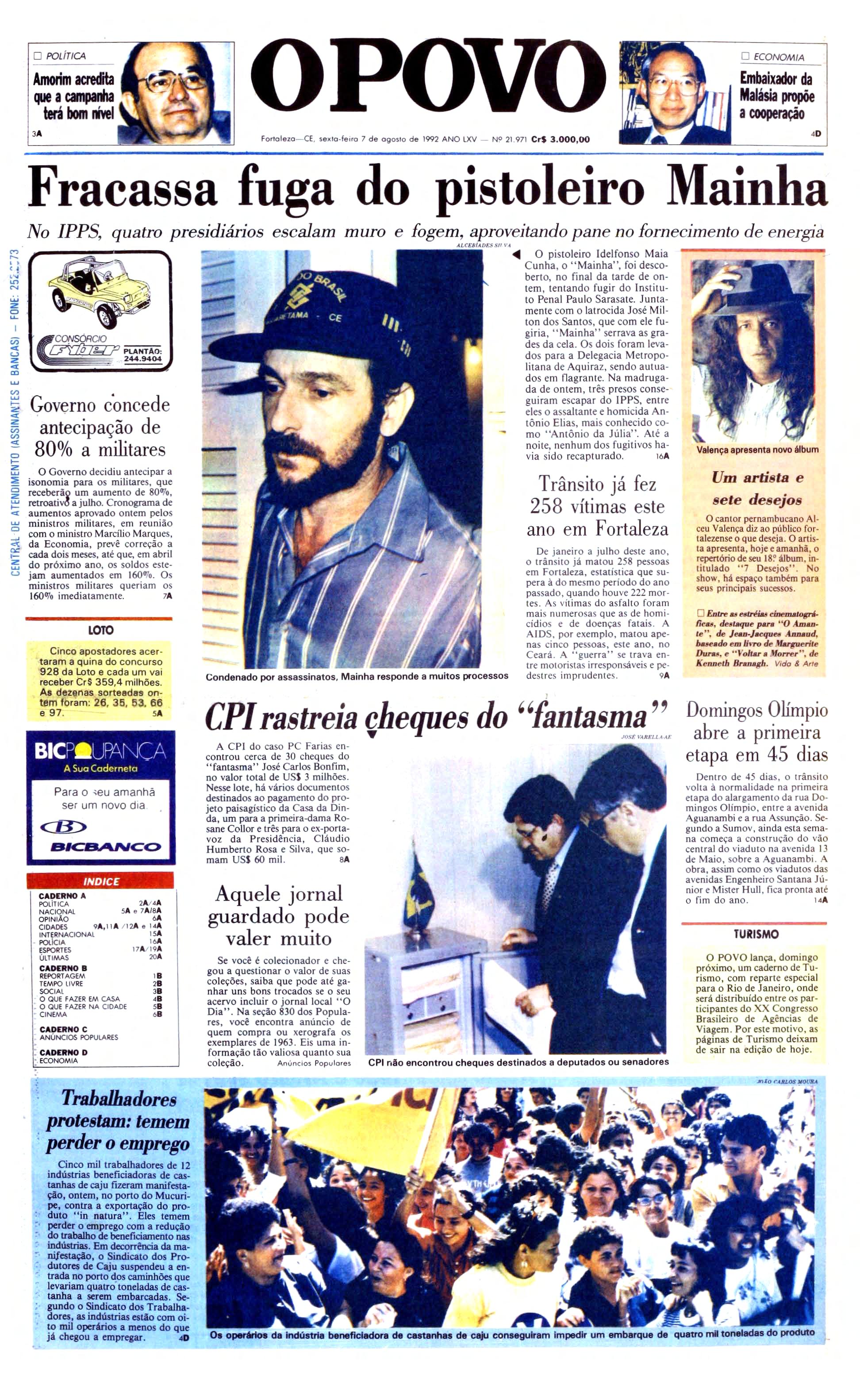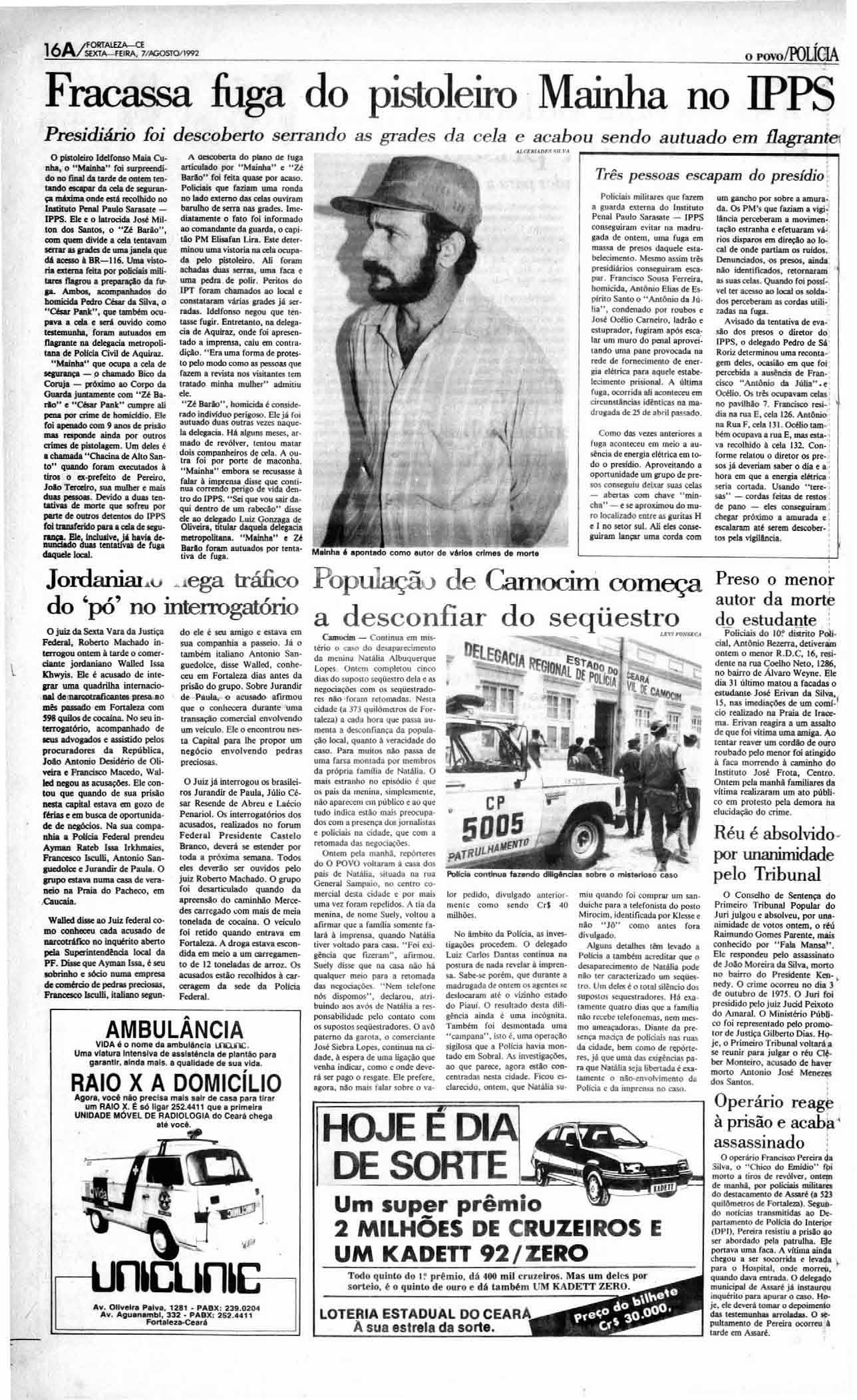 A cecooerta do plano ce f uga articu lado po r " Mai nha " e U Dario" roi feita quase po r acaso Polic:iais que faziam umar onda no lado extern o d as celas o u viram baru lho de serra nas grad es. Imedia tamente o fal o foi infonn ad o aocomandante d aguarda, ocapít ão PM Elisafan l ira Este d etermin ou uma vistori a na cela ocupada pelo pistoleiro Ali foram ac hadas duas serras, uma faca e um a pedra de po lir.Peritosdo IPI fo ram chama dos ao Locat e co nsta taram várias grades já serradas Iddf o nso negou que 11m tasse f ugir E ntretan to, na d elegacia de Aquiraz. on de f oi ap resentado a imprensa, cai u em cont rad içã o "E ra um afonn a de protest o pelo modo co mo as ressoas q ue fazem a revist a n osvisitantes rem tratad o minha m ulher " a dmi tiu ele " U Barão" , h o micida co nsider a do perigoso Ele já foi a utuado du aso ut ras vezes naq uela d eleg a cia H áal guns meses, armadode revólver tent o u ma tar d ois co mpanheiros decela.A o utr a fo i porpo rte d e ma conha " Mai nh a"embora se recusasse à falar à imprensa disse q ue co minua correndo perigo devida dentrod o IPP S. " Sei q uevou sair daqui dentr o deumrabecâc " disse ele ao Luiz Go nzaga de O livc:irt, tItular daquela d elegacia metr opolitana Mainha e U Barlo foram au t uadospo r te nrativa de f uga