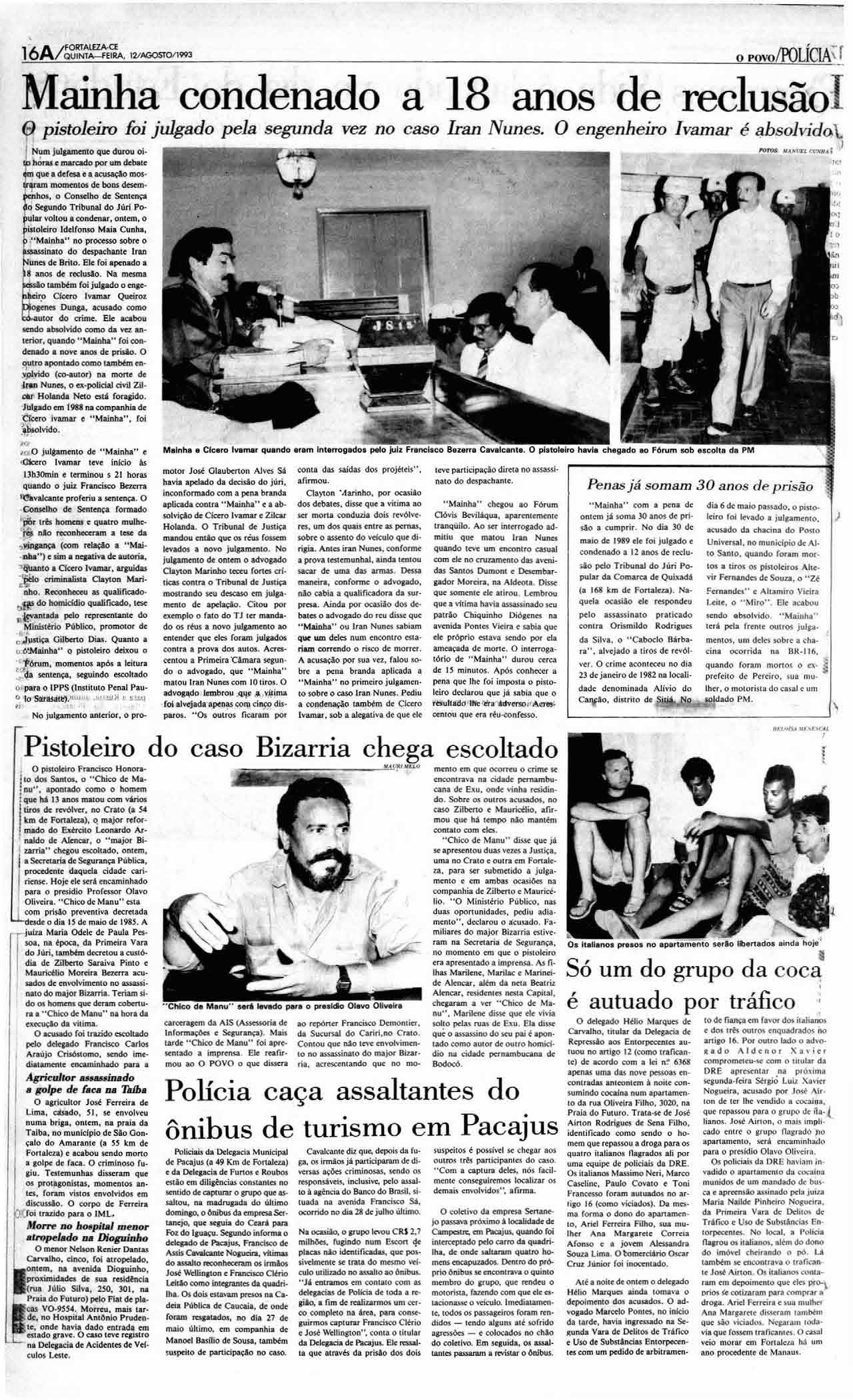 Pen asjá s o m a m 30 ano s d e prisão " Mai nha" chegou ao F ó rum Cl óvis Bevíláqua, apar e ntement e tran qüilo Ao ser inter r oga do admitiu qu e malouI ran N unes quand o teve u m en co ntr o casual co m ele no c ruzame n to d as avenid as Sant os D um o nl e Desembargado rM orei ra na Ald ro la Disse q ue somente d e at iro u Le mbrou q ue aviti ma ha via assass ina do se u pa t rão C hiquin ho Dióge nes na aveni da P o nt es Viei ra e sa b ia qu e e le p róp rio es tava sen do po r d a am eaçada d e m orte O int errogatóriode "M ainha" du r ou ce rca de 15 minuto s. A pó s co nhece r a pena qu e lhe fo i impo sta o pi stoleiro d eclar ou qu e jása b ia qu e o rt'sullad o: ' era i dvcrm j Aae'!/ ; centou q ue era r éu -confesso
