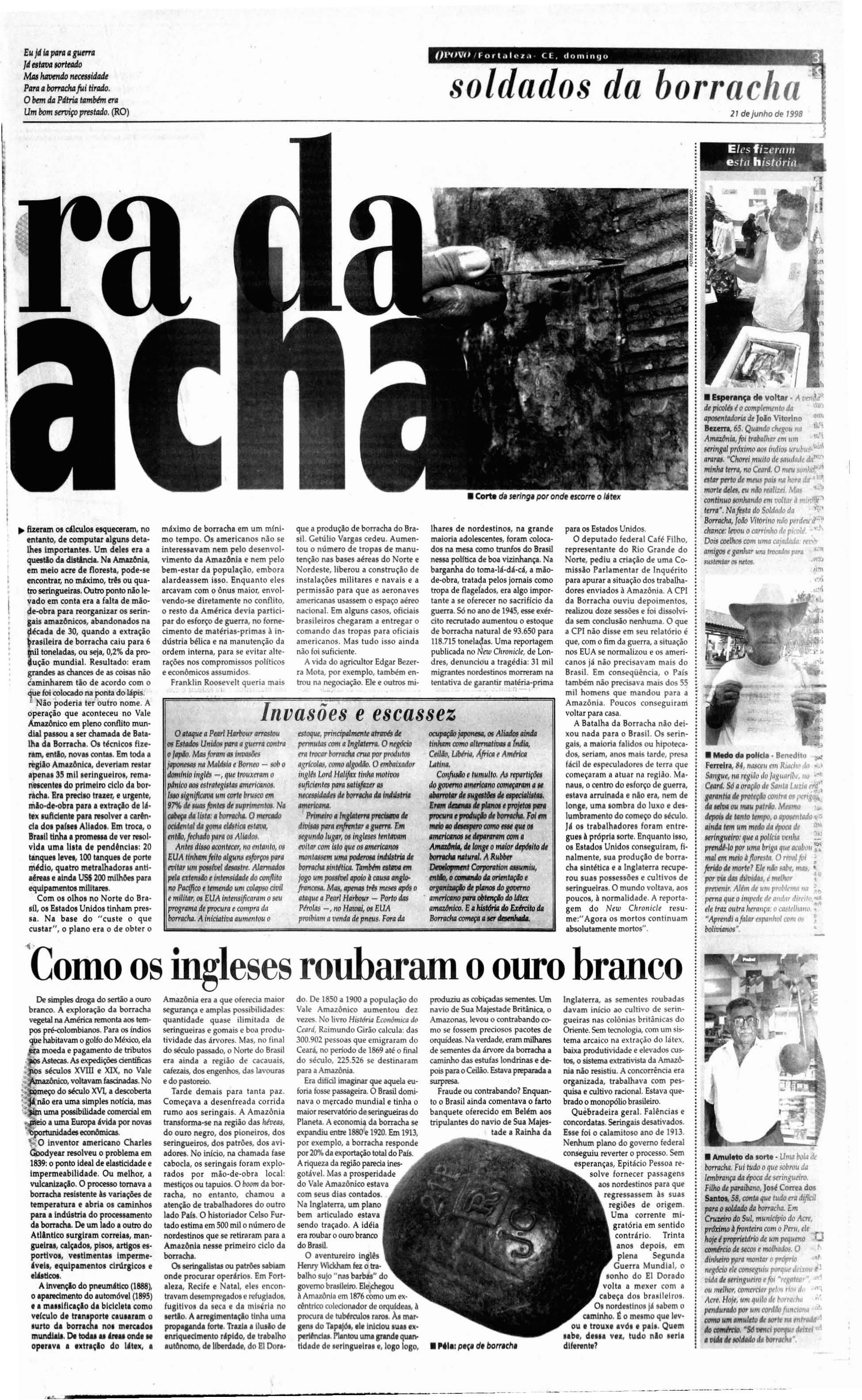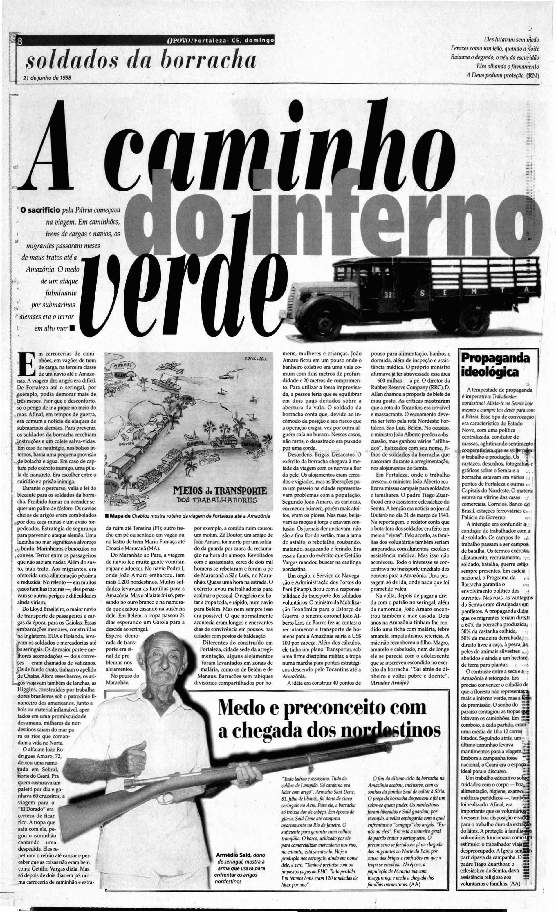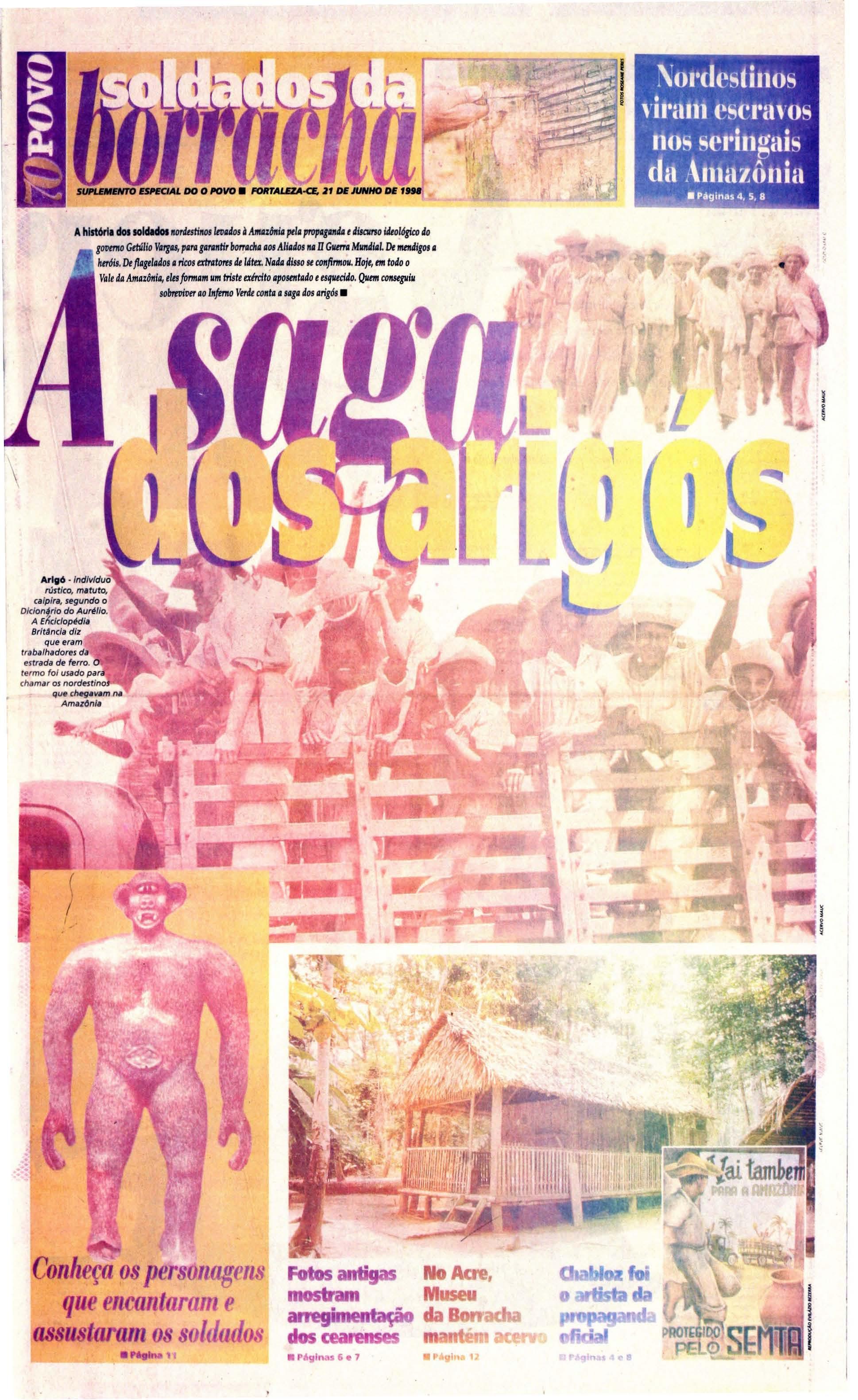 Umacalça de me scla a z u l, uma blusa de m o rtmbrani ca um cha pé u d e palha um pa r de alparcatas de rabicho, uma caneca de flendre, um pr.atofundo um talher. uma rede e uma carteira de cigarrosCoJomy No lugar d a mala um saro de e-s topa Oenxo\'JI d o soldado da borracha t'I.a o pT'l'sente d o presiden te Cetúho Vargds aos volunta ros do Inferno Vero e, como fiwu conbecida a Amollôniil pos-tenormcme Melhor que isso, sõ a pl\'lfl1l"S,'S, de d inhriro fácil t'Stlmp,lda t'1'l\ cartazesde f"\'PdgdnJa doCove rno Fede ral Dillcill't"Sisli r Principalmente para quem vi ve no Sert.io e m um a no demuita niisêriJ Nol seca 0.1 .' JlH2 c rca d e55 mil nord estinosse aleta ram p.1 ra a B.:rbll\d d a BolTolc ha Ou corr o u morre j oa quim Milreir adeSo uza,d e Rus sa s, oes te do Cc.lrá, e xphe.-f. aseca me ce tucou. A amcaça ..I inclusãona Forçi! Ex pedioona rta Brasileira qu e lu tava na háIi.a , ((lio e rnpurrêo qut' faltava Mas na in augureçâo da Col mpan ha Nacional doi Borr acha , Gt' túl io VilrgJS e mpolgou os indecisos "Brasile iros! A solida rieda de do s s en t imentes mo' d,í .a certe za pr tÔ\'ia 0.1.1 vu õne". Pra comp letar um f'dra oseringucíro campeâo O maior fabricantede borracha durante o aro levena 35 mil cru zeiros Is<ô(l e vanl.ag nS: uma v iagem Jec.:rminh.lo.lrem t' N\ io plll m.a is de cinco m il qu ilÕmt'l l'f.t5 attÔ o " EI Dorado ". Sô t'ITl F'lrt.ll za, n(lCt.'a ra, .:r Campanh a di! t'ncontnlu 30 m il l1agt' lol dos .l C'S pt'ra 0.1.' .1jud J No Inte rior lio Es-