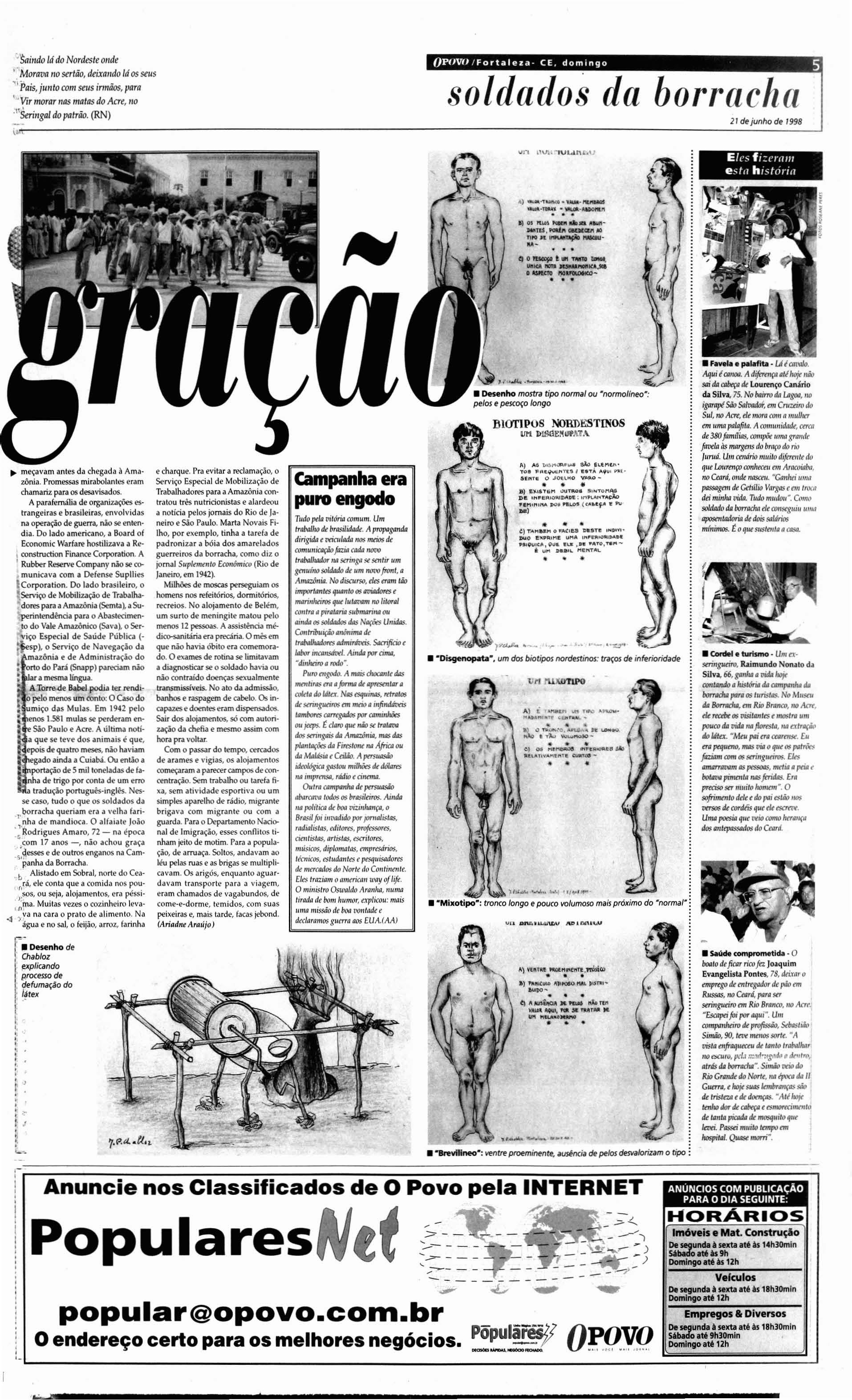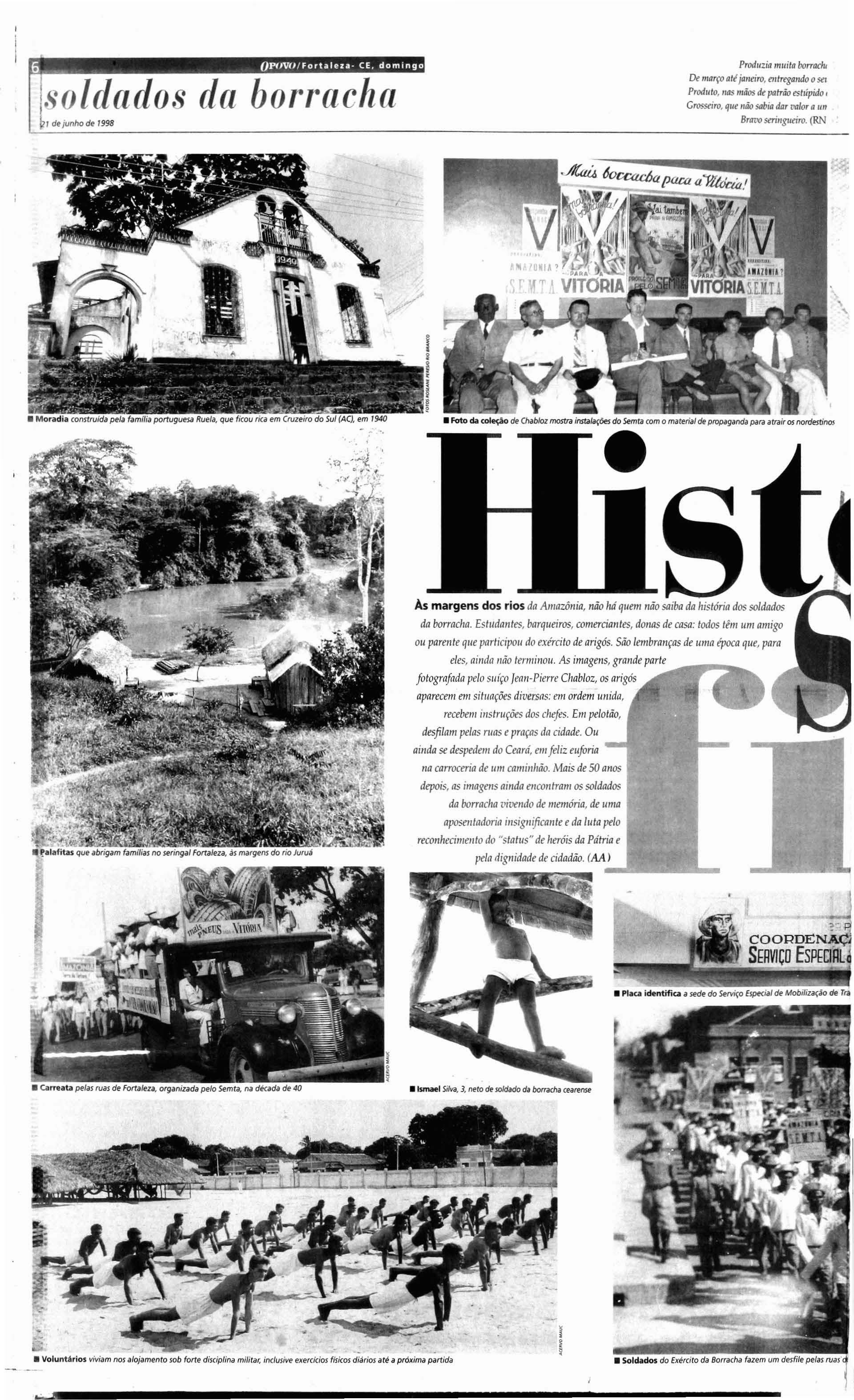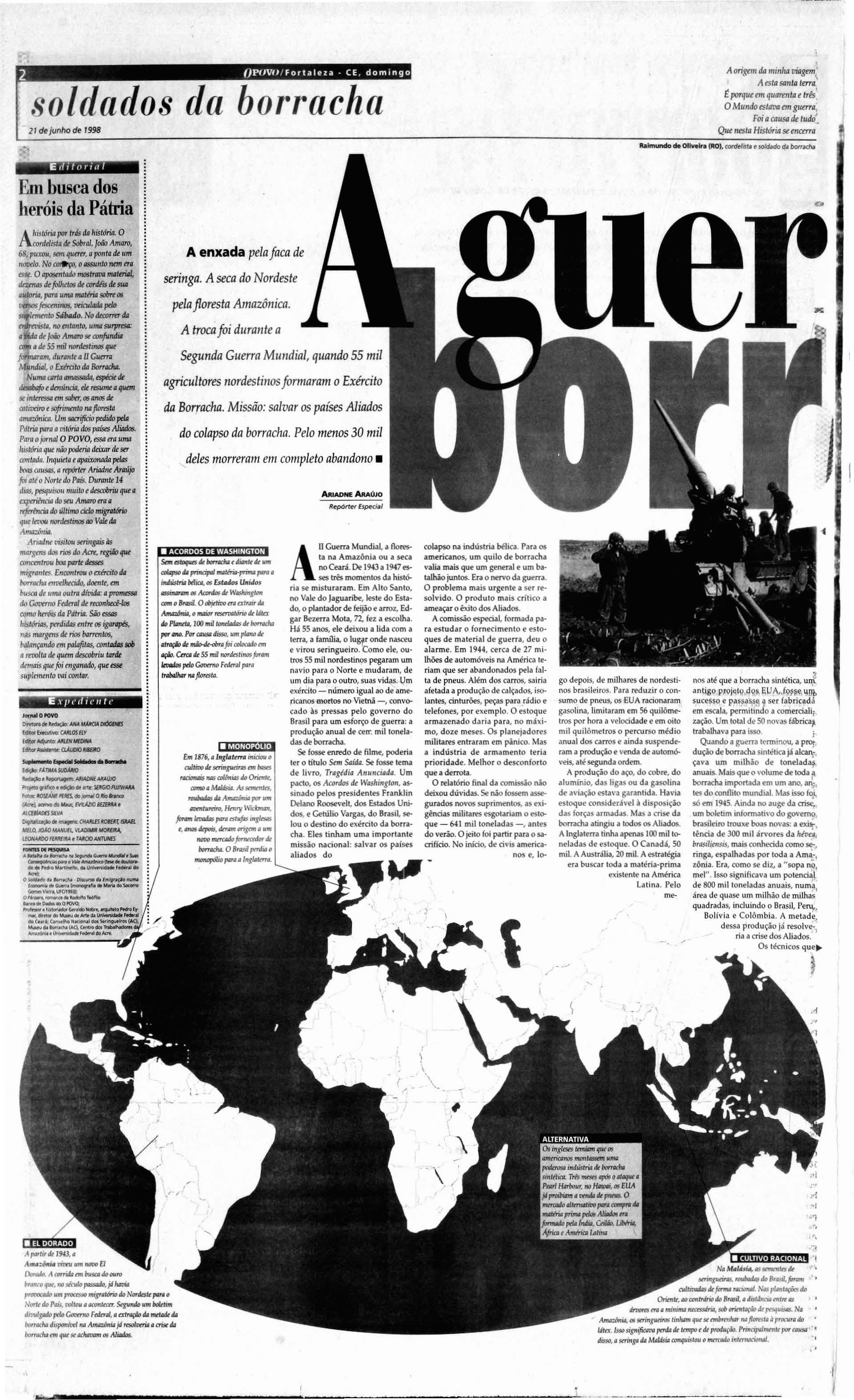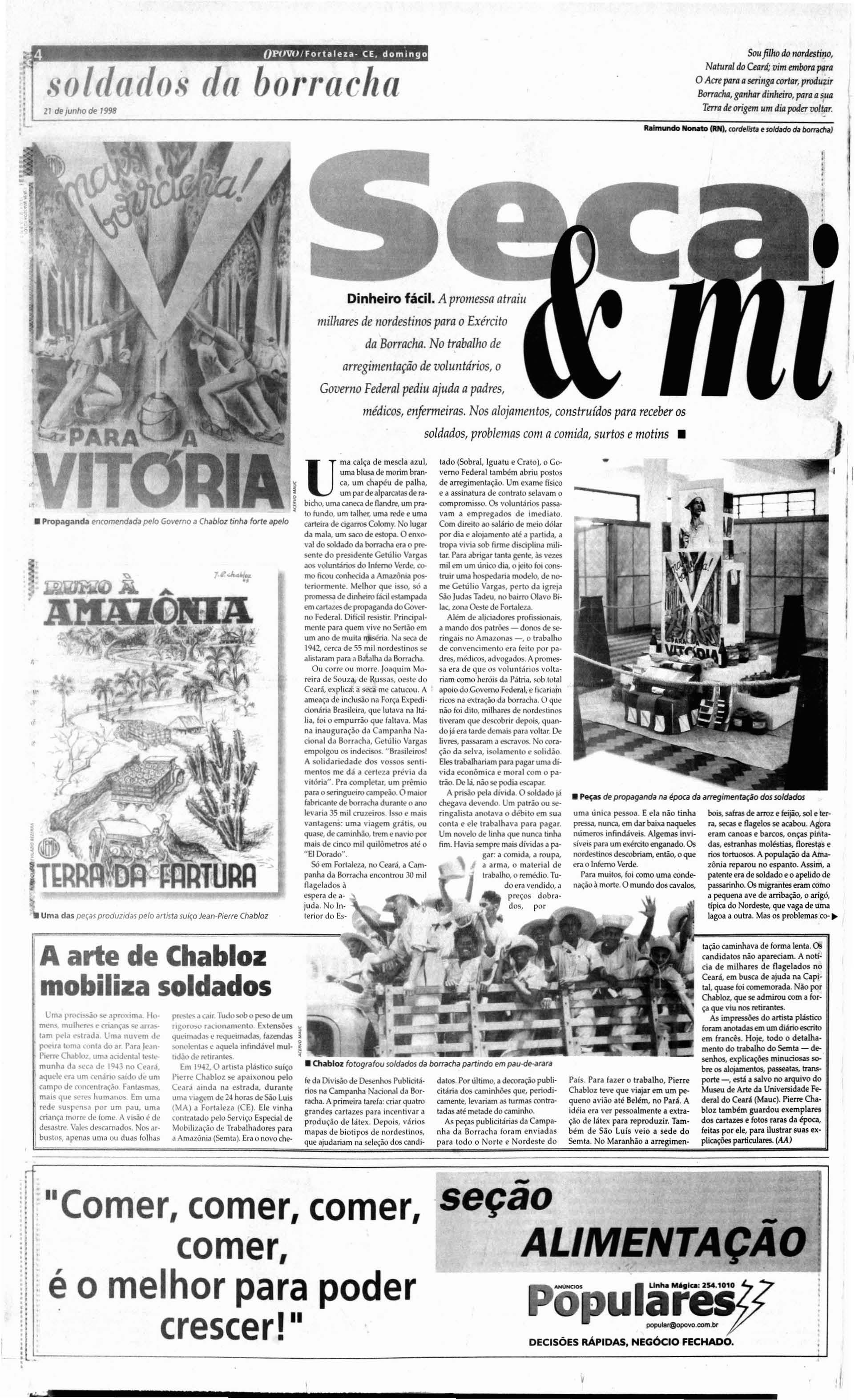 Umacalça de me scla a z u l, uma blusa de m o rtmbrani ca um cha pé u d e palha um pa r de alparcatas de rabicho, uma caneca de flendre, um pr.atofundo um talher. uma rede e uma carteira de cigarrosCoJomy No lugar d a mala um saro de e-s topa Oenxo\'JI d o soldado da borracha t'I.a o pT'l'sente d o presiden te Cetúho Vargds aos volunta ros do Inferno Vero e, como fiwu conbecida a Amollôniil pos-tenormcme Melhor que isso, sõ a pl\'lfl1l"S,'S, de d inhriro fácil t'Stlmp,lda t'1'l\ cartazesde f"\'PdgdnJa doCove rno Fede ral Dillcill't"Sisli r Principalmente para quem vi ve no Sert.io e m um a no demuita niisêriJ Nol seca 0.1 .' JlH2 c rca d e55 mil nord estinosse aleta ram p.1 ra a B.:rbll\d d a BolTolc ha Ou corr o u morre j oa quim Milreir adeSo uza,d e Rus sa s, oes te do Cc.lrá, e xphe.-f. aseca me ce tucou. A amcaça ..I inclusãona Forçi! Ex pedioona rta Brasileira qu e lu tava na háIi.a , ((lio e rnpurrêo qut' faltava Mas na in augureçâo da Col mpan ha Nacional doi Borr acha , Gt' túl io VilrgJS e mpolgou os indecisos "Brasile iros! A solida rieda de do s s en t imentes mo' d,í .a certe za pr tÔ\'ia 0.1.1 vu õne". Pra comp letar um f'dra oseringucíro campeâo O maior fabricantede borracha durante o aro levena 35 mil cru zeiros Is<ô(l e vanl.ag nS: uma v iagem Jec.:rminh.lo.lrem t' N\ io plll m.a is de cinco m il qu ilÕmt'l l'f.t5 attÔ o " EI Dorado ". Sô t'ITl F'lrt.ll za, n(lCt.'a ra, .:r Campanh a di! t'ncontnlu 30 m il l1agt' lol dos .l C'S pt'ra 0.1.' .1jud J No Inte rior lio Es-