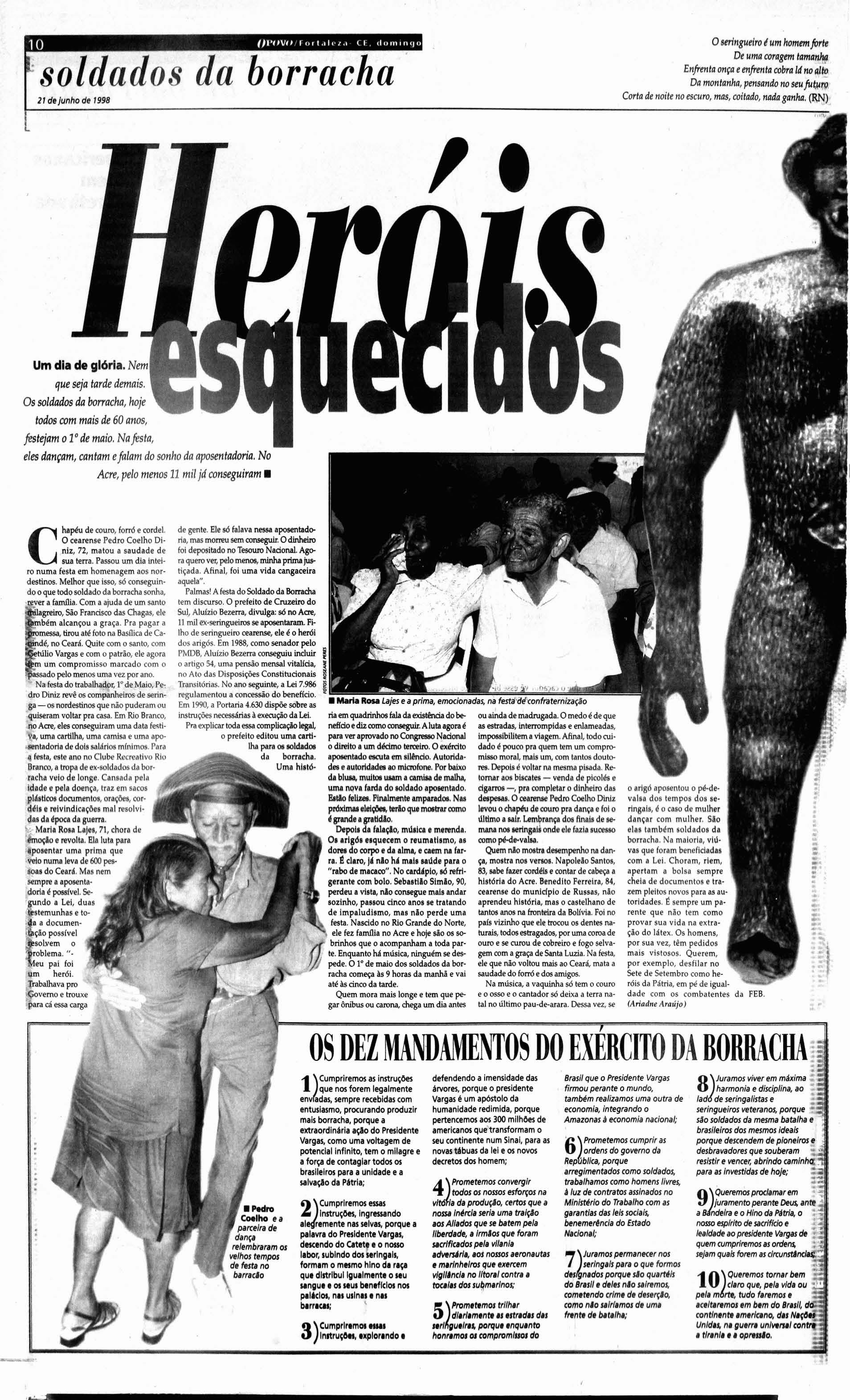 Na festa do trabalhadct, I de Mai o, Pedro Diniz revê os rompanheiros de seringa - OS nordestinos que nâo puderamou quiseram voltarprol casa Em Rio Branco, no Acre , eles ccreegcíram uma data Iestiv.. uma cartilha. uma camisa e uma apoR ntadoria de d oia '-lldrios mfnimos Para 4 festa , es teano noClubeRecreanvc Ri o Branco, a tropa de ex-soldados da borrilic hili veto de longe Ca nsada p ela id ad e e pela doença, trazem secos p láltlrot documentos, orações, cord él e relvindlcaçõeI mal resolvid ai d a época d aguerra 'M- Marl. ROia l aJeI, 71 , cho ra de Ímoçlo e revolta Ela iula pau apolen tar um a primaqu e velo numa lev. de 600 pei1011 doCeará Mas nem sempre a apose ntad oria é poea!vel. Segcndc a l ei, dua s test emunhas e to4a a d ocu menpossível tso1Yem o roblema -, eu pai fo i u m herói :Trabalhava pro e trouxe para cá essa carga