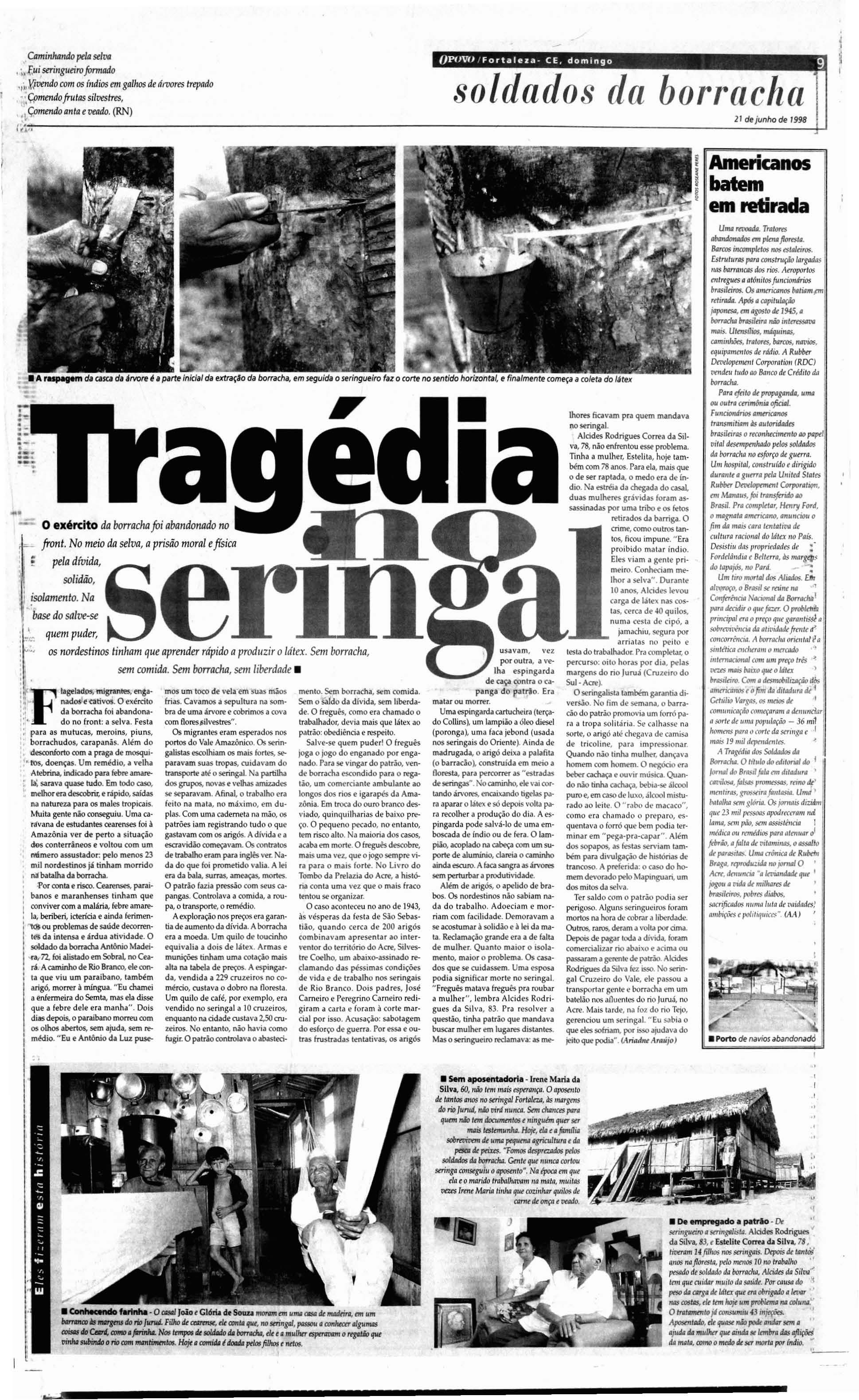 tado (Sobral. lg uatu e ( ra to), oGovern o Federal também ab riu pos tos de arregimenta ção Um exame físico e a ass inatura ..I con tra to sela vam o compromisso Os vohmtarios passava m ae mprega dos deimedia to Com d ireito .ao salário de meio d ólar por dia e alojame nto at é a parti da ,.a tropa vivia sob firme disciplina militar Para abrigdr tdnl.a geme à s vezes mil em um ún ico dia. ojeito foi construir uma modelo, de nome Gt' túli o va rges pe rto JJ ig rt'j.:r São Jud 3S T.a dt'U, nu ba irro 0 1.1\'0 Bi lae. lOrlol Oest e d eFortal eza AltÔm de allci.ldOM profissM. ll'la is amandodos pa triJo'S - donos d e rin gaísno AmJlO nolS -, o tr abalho deconvenci mento e ra fe ito po r padrcs , médicos, ad vogado-,A p l't.' illt.'Ssa e ra de qU "llS volun t í r ins VOIt.lriam comoheróis d a ('oi lriol sob total a poio d oGove rne f l>,Jl'rdl t' fi(ol r i.l in ricos na t'xtrolç.l ll dJ borracha O q Ul' nê o foi d ito, milh.:rres d e nordest inos tiveram q ue descob rird epois , qu.:r nd o jáera tarde de mais f'dr.:r \'O Il,1r De IiV I't'S pdSs.lr.lm a t.'SCTolVOS No coraç.lO doi selva isolame nto e sohd âo Eles trabalhariam pa ra pag.a r uma d í vi da eco nômica e moral co m (l p .atrâo Delá. n,)o se pt>d i.a {'!;Capar A p risâo pela di\ iJa O sotde do já rnt'g.l \'ol devendo. Um palrão ou Sl'r ingalista anO!JV.l (l d tÔ bito t'm s ua cont a e e le Irab.llh.:rn pa ra paga r Um f\Owl o de 1inh.J qut' n unCol linha fim. Havia 5l'mpre moli sdividas J pagdr : d wm id.a , a I'f.l u pa a ilrmol , o matt'r ial d e tr.lbol lhll o rem.:.:Jio Tud o t'rol wn d id(l, a pr t'ços dobrad os, por