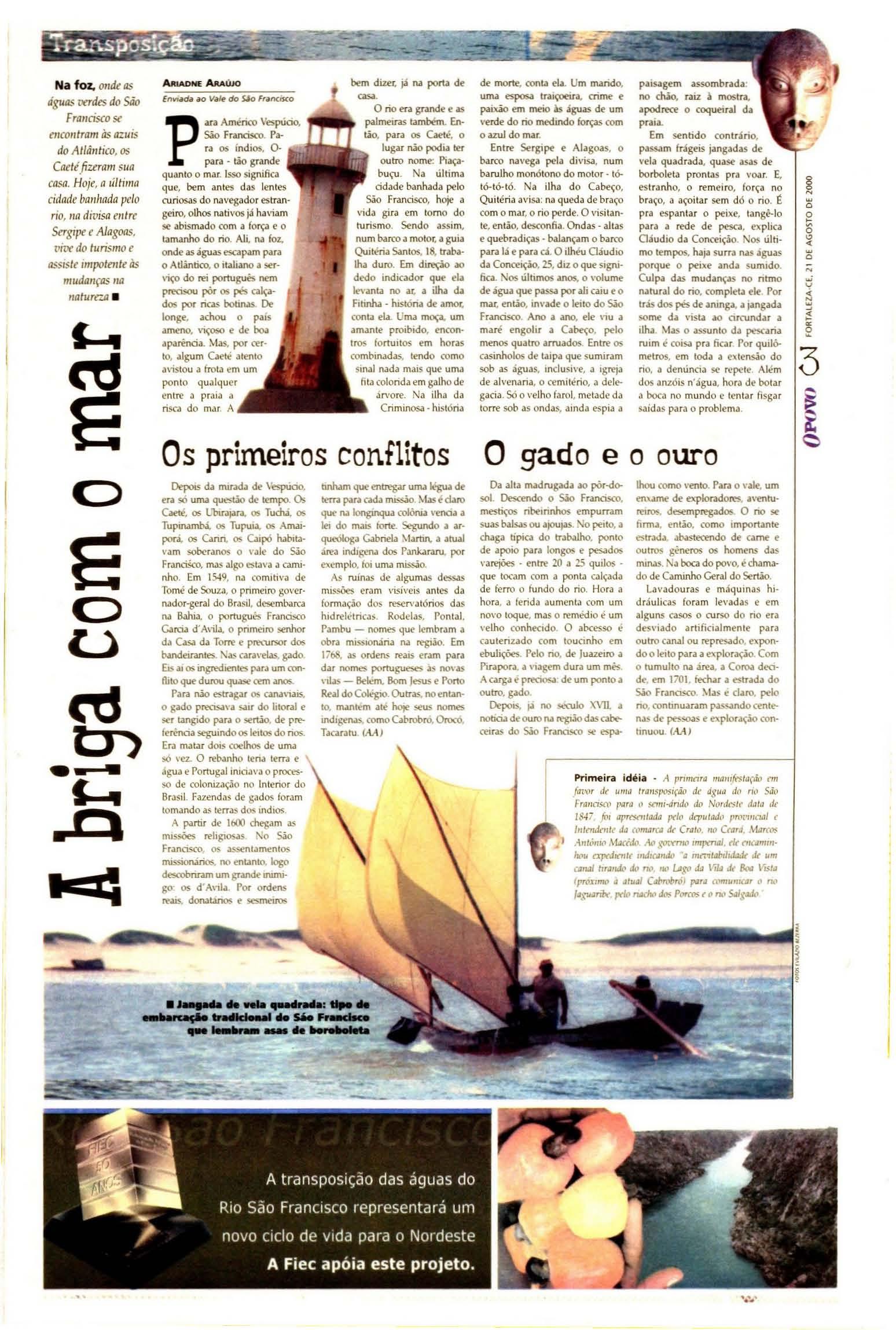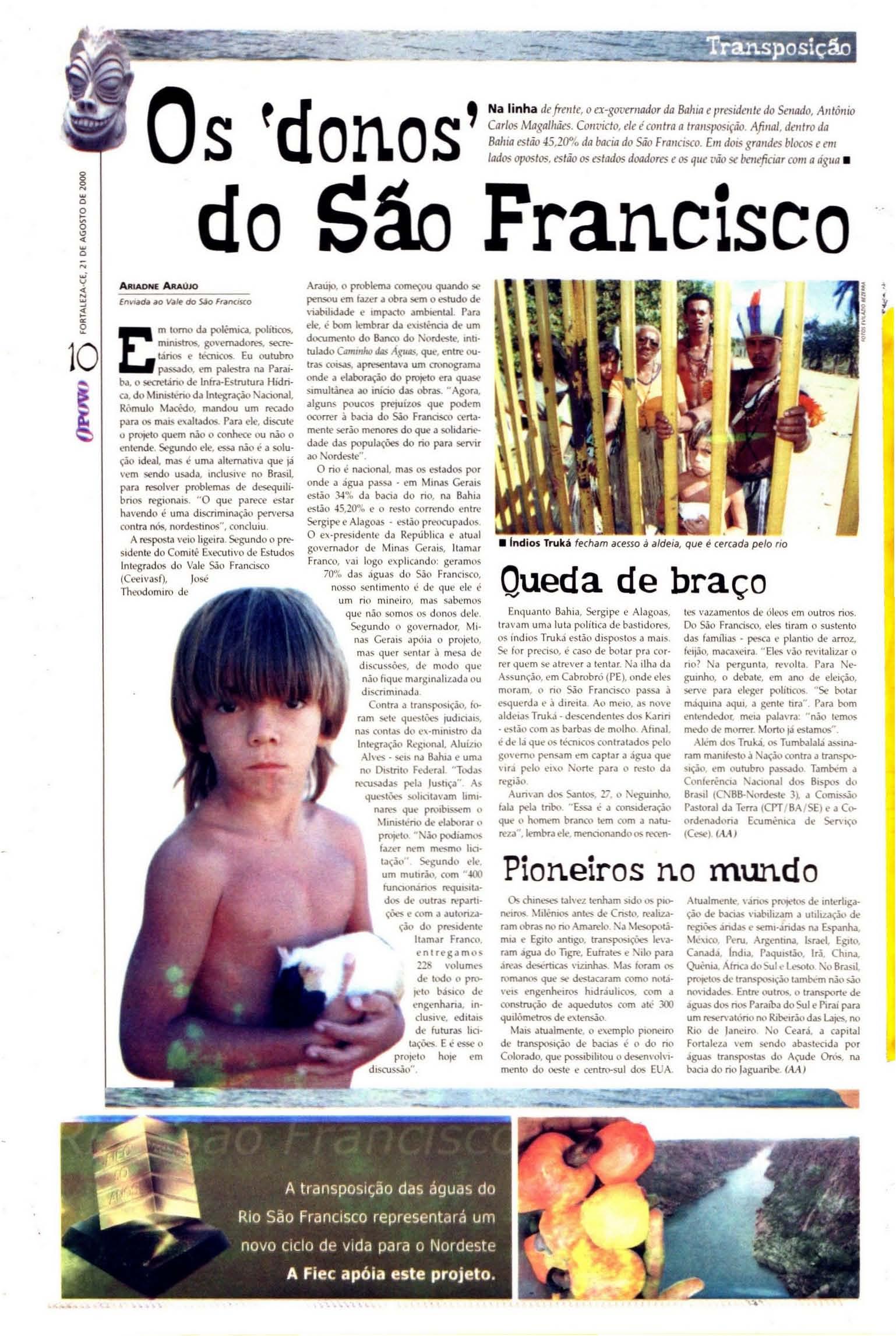 da .igua de ch uva co re truç âo de pt'qu\' nos açudes, poços a rt s ia n os. Icm u rna po r.;.lo d e pt'q uen o15 mici ativas qU l' solucion am o proble ma d as f'l'lu t'n,ls co m urudadcs sem CS-.'\t":< Invt"S hml'n los f.l raóniros , ma..< o prot>lE'm,l li qu\' o modt'lo d o nos..so d_n\'ol\; ment o dentro d es...s.a f;O\' e ma nça que est.i .li, n.io aOl."dll.l n.l S pequen.l! iniciati\'J s E' a lras ">;:I StC o .1.1 '" f; randes mpre lt"' lT.l s q ue ClUge m que t'So,st'S pfOll'l os ""iam .lprovados. Ent.io nós olt'Tt"d it.a mos nos proj\' los alterna tivos 'lu\' ja es l,)o apn.w.ldos, tt'S tados e prova ram s u a efic.icia Entj o so u a favo r dt"Sses proJt' tos a he ma tiv{l<;, q UO;' real mentt' do so lud()T\d r o prot> lemol da .igu<l , ma..s init'lizml'fl· 11' n.io se investe I\\'S<.\"S Prott'tos peqUE'J1O'> , S() Sol" Imt.'n.--OS protel q ue vão dJr u m g ra nde d i\ idend o p ar,) a..s g ra ndes empn.·lt r.lS En tão ti po r aí que \ '<11 • f'I('IoSs.l m hca Pr<l ..-un,:iUl T eu .1111: 0 que .I ,wmll'O n..io d N s.m gue Se q uil't'r qu\' o n o S.io Fr.lnciSt.'O d ot', ga r,l ntJa \ ;d .l d k En t.k> som os n> \ 'ilalização d o rio e m p nm"'lro IUg ilf pr a dt'poi.s p'·n."Jr t' m It'\' Jr .i gua pJ ra o ulrJs repÕt'S , o r - O St'lllk" 111\l/l " lU 1"w.j.'THW(J..l IIU rli1t. ' ' h' "'''I II J.. ,1.- ú lll SCI "' lh:.:l' T'1 rll <l f rcsrrt'ol (4.' J.l rnl' Dom Luís - s.-m dl.i\ id d , A .-redll ,l que a 101 Umil \"I.rad .1 d \' poipn.l Acredito 'JU\' , na his ton J.> no S.io Frol ncL",,'O a gt'f\ !C pod ialar .trlt '_·., dq"-lis Um e'\emplo dlS-.so ti que !i\'('fTlO!' no (6 d\' mL. s.a do Bom Jes u s dos :-.Iavegan, \'S, aqui na Ban,l, e T\d hora d'b o f rtas chegou um ll dad.io ro m q UJtro de lh o qu\' nmd o o ld' IM, dizen do ' olh.l L'SO aqu i foi a hm pez-a que eu fiz p<'r &lm Jl"!' US no n o dde ' , É (l tiro .1 inl d ,lti va particu l.lr d t' údJdã o, qu e SI;' mtiu so li danLIdo, fO I na be ira. do no e tirou o [1\ 0 S.i o mJl ha n.'S d \' iniciativa.." vão s u rgindo, .a h, .lqui. oICOl á, u mas m.lL.S 0'l: .miz.ldas , milis be m ou tra..s es pon t..ine.lS, e a gm tt' ri frut o d a f"regnn..JÇ ão