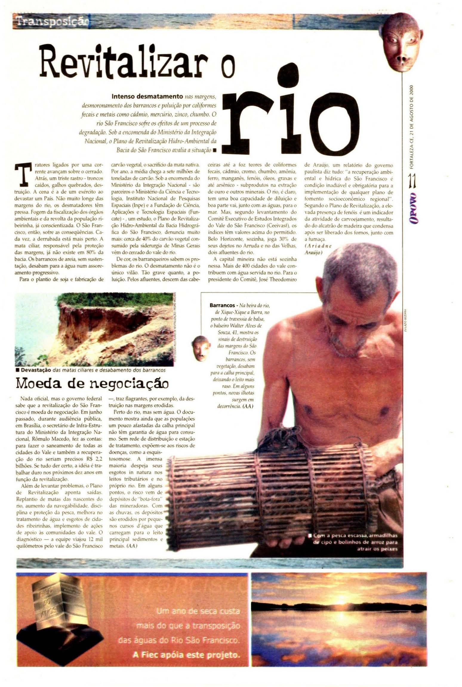 beira do rio q ue IO gam seu s dejet os diretonorio, St'ja també m os deje t os q u im i(OS d as indú strias 1;1 na ft1\iJo de Belo H o rizonte, d o s u does te d e qu e e u ma n-gião N slantc mdU $trializ-a da 1s.."O devagarmho vaimatan do o rio Tercerro tE o probkm ol da Imgação há nenhum das águob , :-':ão que • gen te stiJ coo rr • .1 irrigOt{.lo De mill1t'1I a nenhuma , moi '" n.i o e :üs le ncnhu ma oldmmlStr.lÇ.i o da águ.l 111'<1.1<1 , Qut' r dizer- cad a um f't"ga o q U\' quer, se m dar Sdtl sf.a.;ão a Isso n..io pod Um outro problt'1TIJ relan ce a ('5.S(' modelo de o uso de muito a):roló «o Isso devag a rinho v ai In do tu do p arJ o rio e envenenando cada vez mais as s ua s Outro pn.*, ll' mi1 s.io os N ITaml' n los, .lS g randt"!' e barr.lf;ell.s , 11 0ft' J f"t"SC a .: rara no São FrJnci >oro "lu ' oull'(lr.l{lÍ um no \ i.<,('{N,) ch io d\' pei\t' As f;ra nd ("<i. impt'd..m • s ubidJ dos p h es poara .I .1 "'0 \ 01 e t"S tj ae,lb.1 ndo co m a \' Idol d , rio , "l U\' t.l mbim es tÁ tril-ns l(l rm.lndo t' m Im \'n. )<j [Jgos , s ub e m"'di(l São Frandsro, ,1q u\' IJ n-p.io q uI:' Vii i dt." Sob radinho J -'Pau lo Alon$o, o ri o n.l(l o r - P." 'l"( o smhPr ti o rro ,.-l, ' JlItr"II '· f'l'Si('" C\ll''''' Wrn.I "'"01111 1 Dom l uis Em pnmeiro lu gar ti u m p roq ue !l: m um,l casca SOCIal : le\'ar para os do l.i d\' tlm.l , UmJ e,} S( .l sociJ l. que escond e os \'\' rda d\'iros inlt' M> "t.'S qu.' polítkos t' \'Co nOm icos Sl'f; unJ\, lugar : o p fll)\' lo demJndJ um dinhl'iro muilo t'1 (O\'.ld o (' um tl'fTlpo II:ra nd\' d e c '\t'<..'lJç .io A ):\'nl\' fi ca pt:n.s.lnd o ' me u Deus, se rj q UE' ol S pro \im,l s 10'1' ,)\ ' a m\'Sm.I d \'lt·muT\dção q ut' o J tu.ll go \'t'mo 1o'l"T a q llt' n.k.' " .11'0;' 1' m.lb um pro,cto m mo aq udes d o t\'mpo da dll.ldur , ro mo Trall.<;,t m.uônic,i. qllt' \' .Ii mur dmheiro publll'O e n.io cht'g.l r .l l ugJr nenh um ' e\i ste nenh um p rlll'-" Io StW n>,llm\'nt\'''':no dt' re.:l t'nç,) o, d t' dt'St' m 'o l\imcrl lo do po vo o nd \' o rio PJS-s.l n.lturalmentt' Se n.io cons..·gulram resoh 'Cr o p robt\'ma d o povo o ndt' o rio pa,<s.l naturalm t' nt\', que certeza a genle v.li ter q UO;' o rio V.li n."SOIver prot> ll'fTla onde e le nem SoClj ul'r pa s.l' Terre iro, esSE' tipo de projt.1o d,,·molnd.a um cons umo folT .aôni co d e ene rpa c• E quem tE quE' \ 'ai pa g,l l t'So,s.a O po \'O' O povo n.io tem condi ção En t.io