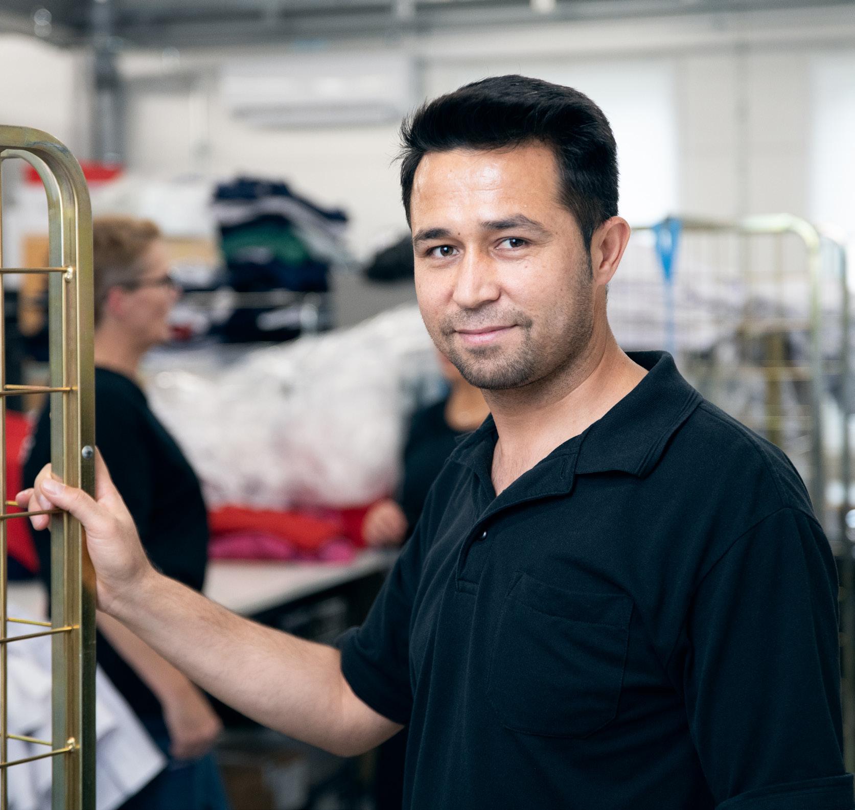HUNDRATUSENTALS MÄNNISKOR i Sverige går varje dag till sina arbeten. Klär på sig rockar, byxor, jackor. Kliver in på entrémattor och torkar med trasor. Bäddar med nya örngott och dukar med manglade servetter. Utan att ha köpt en enda textilie. Istället är de en del i vår hyrlösning. Att hyra istället för äga är nämligen vägen framåt mot ett cirkulärt samhälle. I vårt textila kretslopp förlänger vi livet på hundratusentals produkter varje dag. Vi tvättar, lagar, hämtar och lämnar – om och om och om igen.