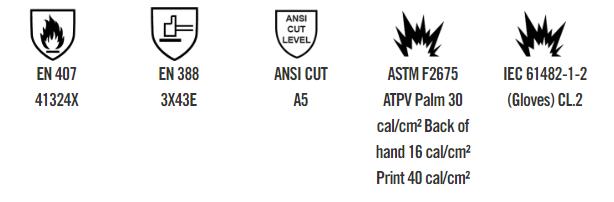 114586 grå. STORLEK En storlek (säljes i par). MATERIAL 100% aramid, FR silikonbeläggning, 545 g/m². EN ISO 11611: 2009 Class 1, EN ISO 11612; 2008 A1, B1, C1, E2, F1.