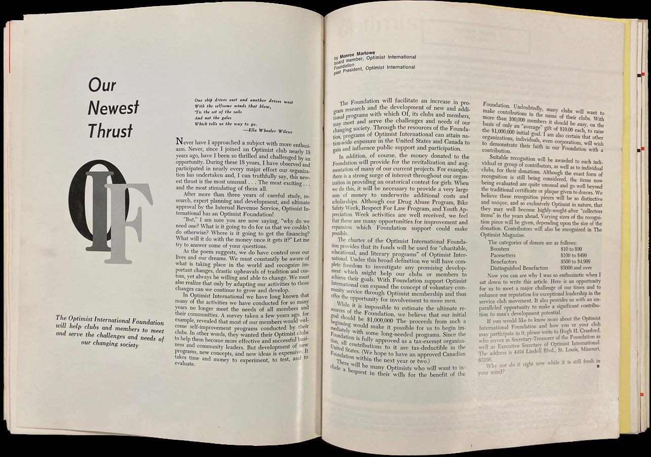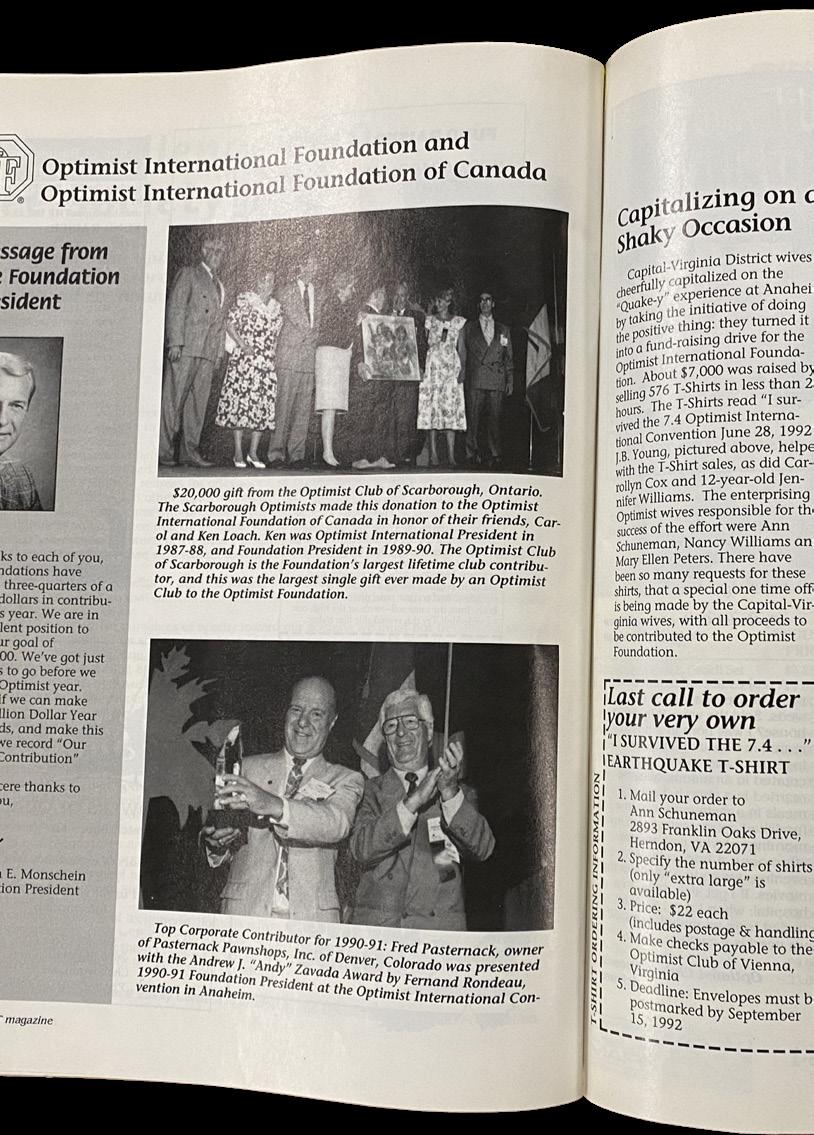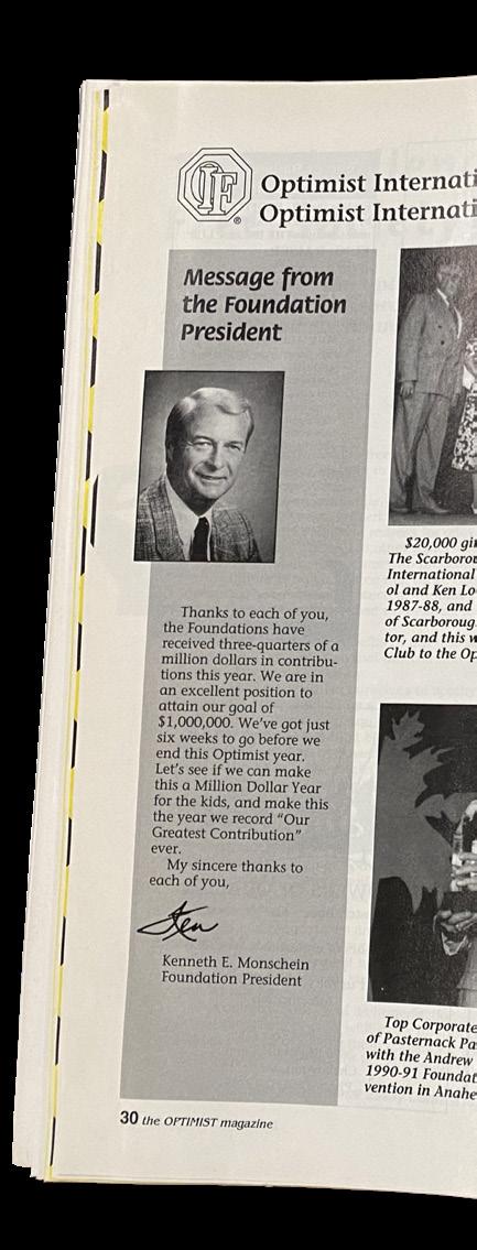 « C'est avec grand plaisir que je repense à mon mandat de président de la Fondation Optimist International. Mon souvenir le plus marquant a été d'avoir pu annoncer à nos 2 000 membres Optimistes, réunis lors du congrès, que nous avions connu une année couronnée de succès et dépassé nos objectifs de collecte de fonds pour cette année-là. »