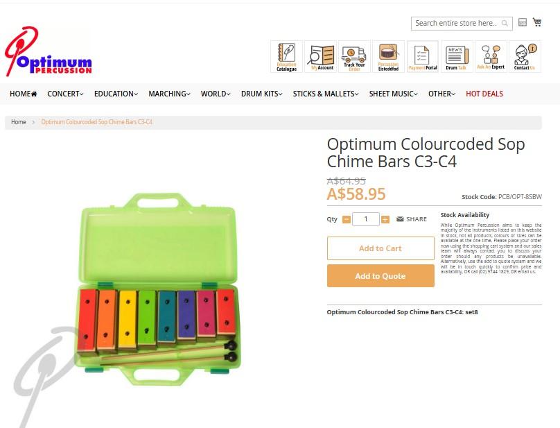 Check our website at www.optimumpercussion.com.au for LATEST PRICING and thousands of products. You can build a list to request a quote or put your order in directly on-line together with your school purchase order number.