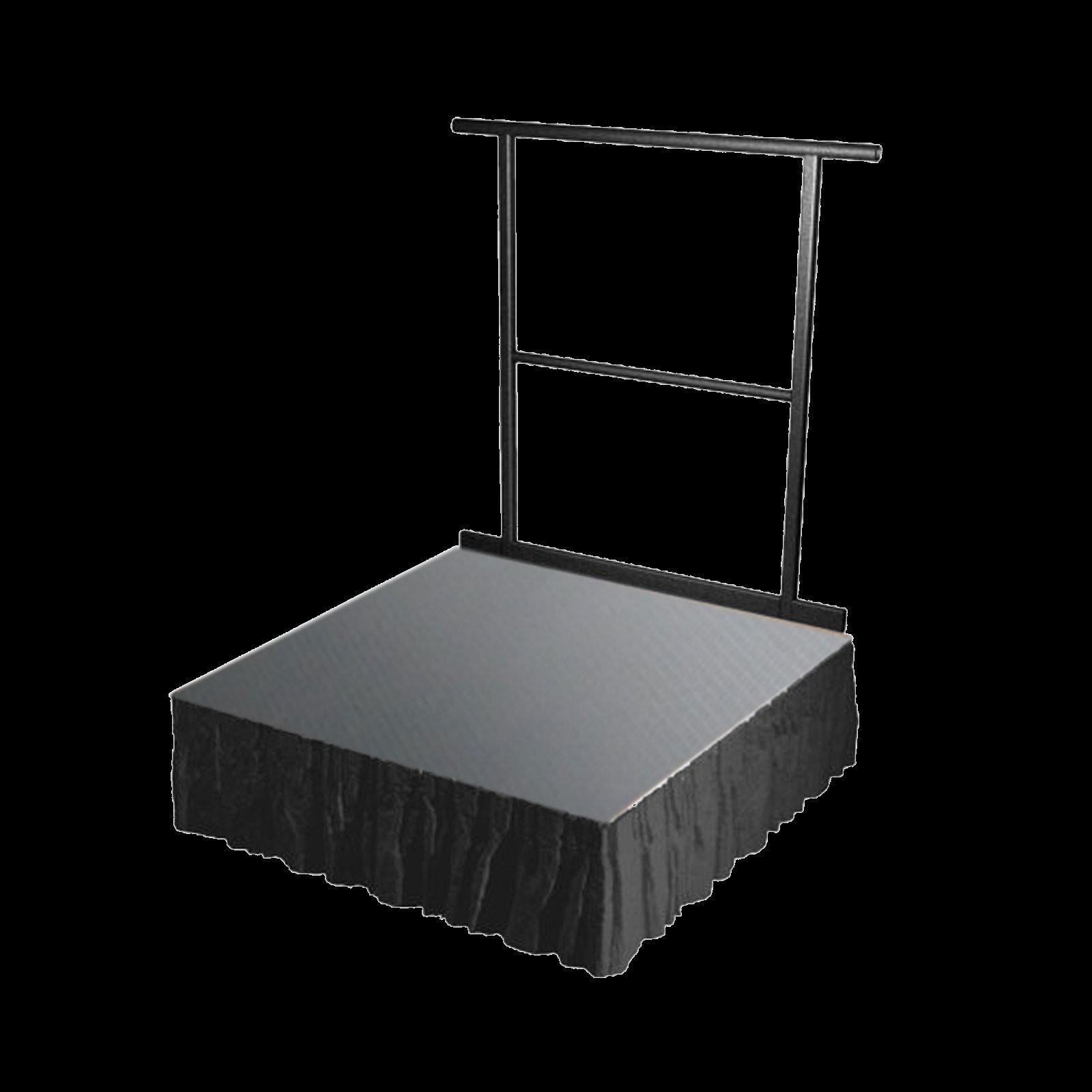 1M x 1M with 200mm legs Complete with Handrail and Skirt can be put together, taken apart and stored quickly and easily. No Screws, No tools.