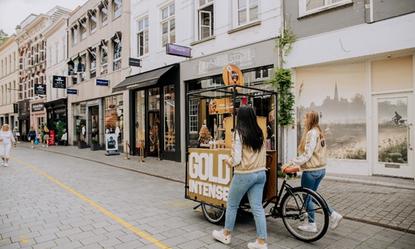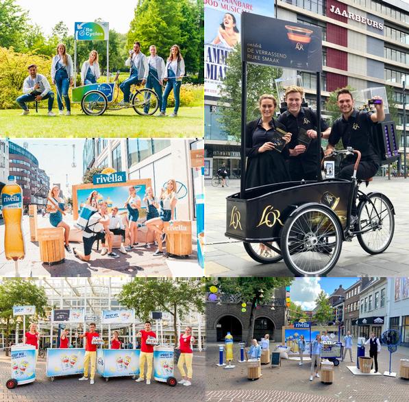 Fiets is niet helemaal in beeld. Promotor loopt ervoor.