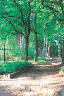 verderbeklimjeschuinrechtsdetrappenvaneenkruisweg. OphethoogstepuntkomjebijdeKapelvandeKruisberg. Indezelfderichtingdaaljeevenaftotbijdekleinere