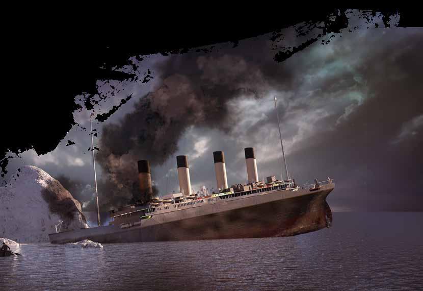 Terwijl de muziek klinkt, zie je wat er elders op de boot gebeurt. De kapitein doet nog een poging zijn zinkende schip te sturen. Iemand anders zorgt dat de klok op de schoorsteenmantel goed op tijd loopt. Twee oudere mensen liggen op een bed waar het water al onderdoor loopt, met angst, maar verzoend met het naderende einde. In de feestzaal, die ook al volloopt, zit een man met een glas wijn in zijn handen, hij draagt een hoge hoed en is één van de prominenten op het schip. Hij kijkt verward en lijkt niet helemaal te beseffen wat er gebeurt, hij heeft er geen controle meer over. Het strijkorkest staat op het dek en blijft spelen terwijl hun voeten al in het water staan. Uiteindelijk zinkt het ‘machtige schip’ en komen meer dan 1500 mensen om het leven.