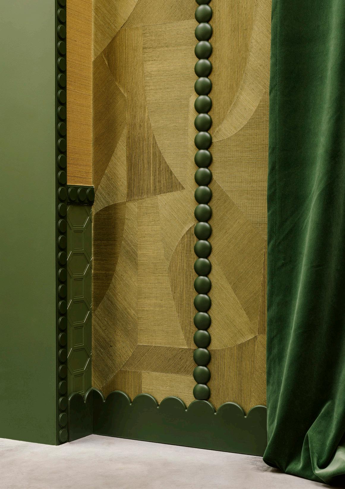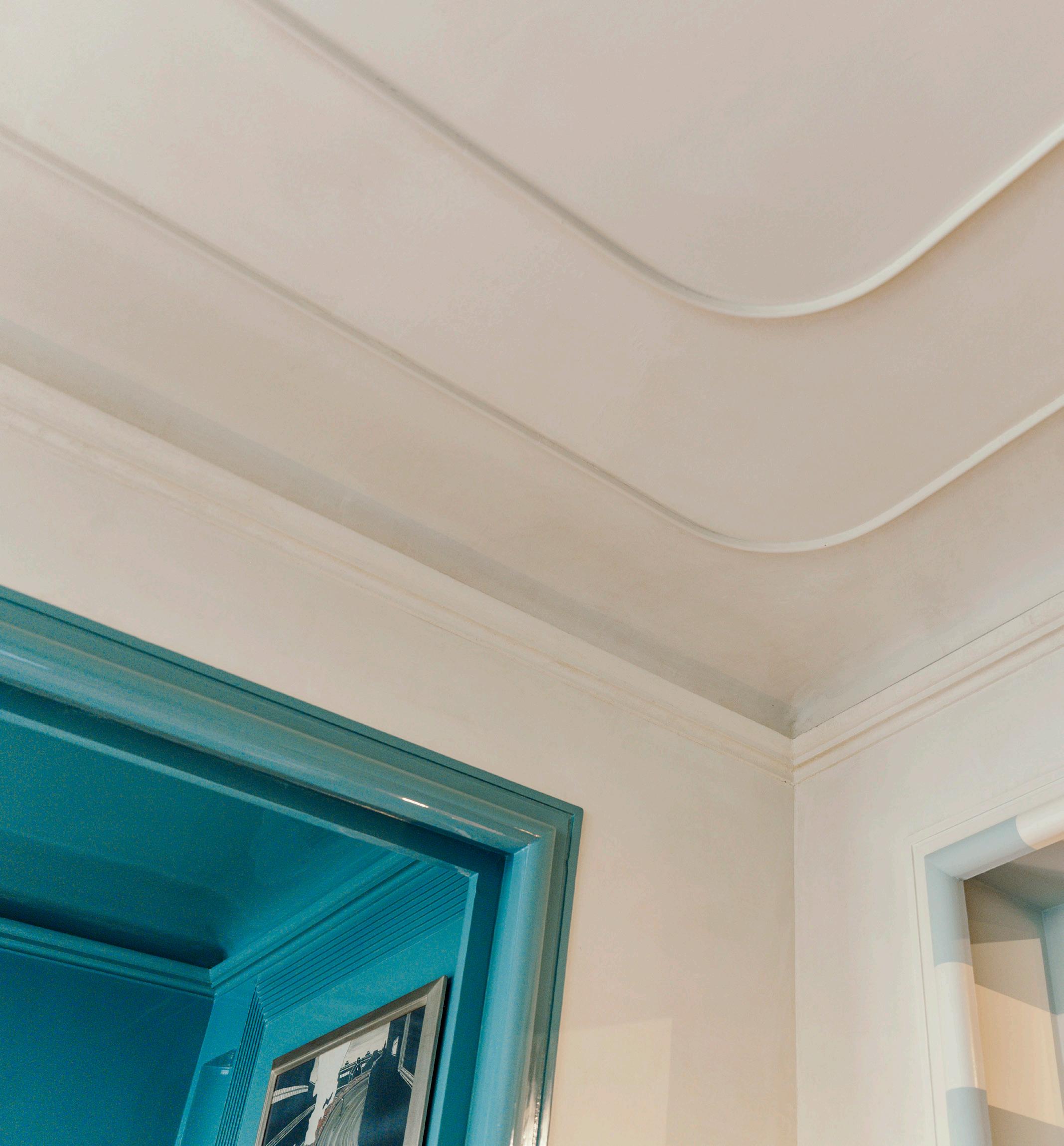 Horizontal lines also play a vital role in Art Deco. Particularly stepped profiles at the base of the wall or on ceilings, as they bring structure to a space and create a layered depth effect. High line skirting boards translate this principle for today’s interiors with clear, horizontal accents that subtly refer to that classic Art Deco design language. Higher up the wall, a single line at two-thirds height visually divides the room.