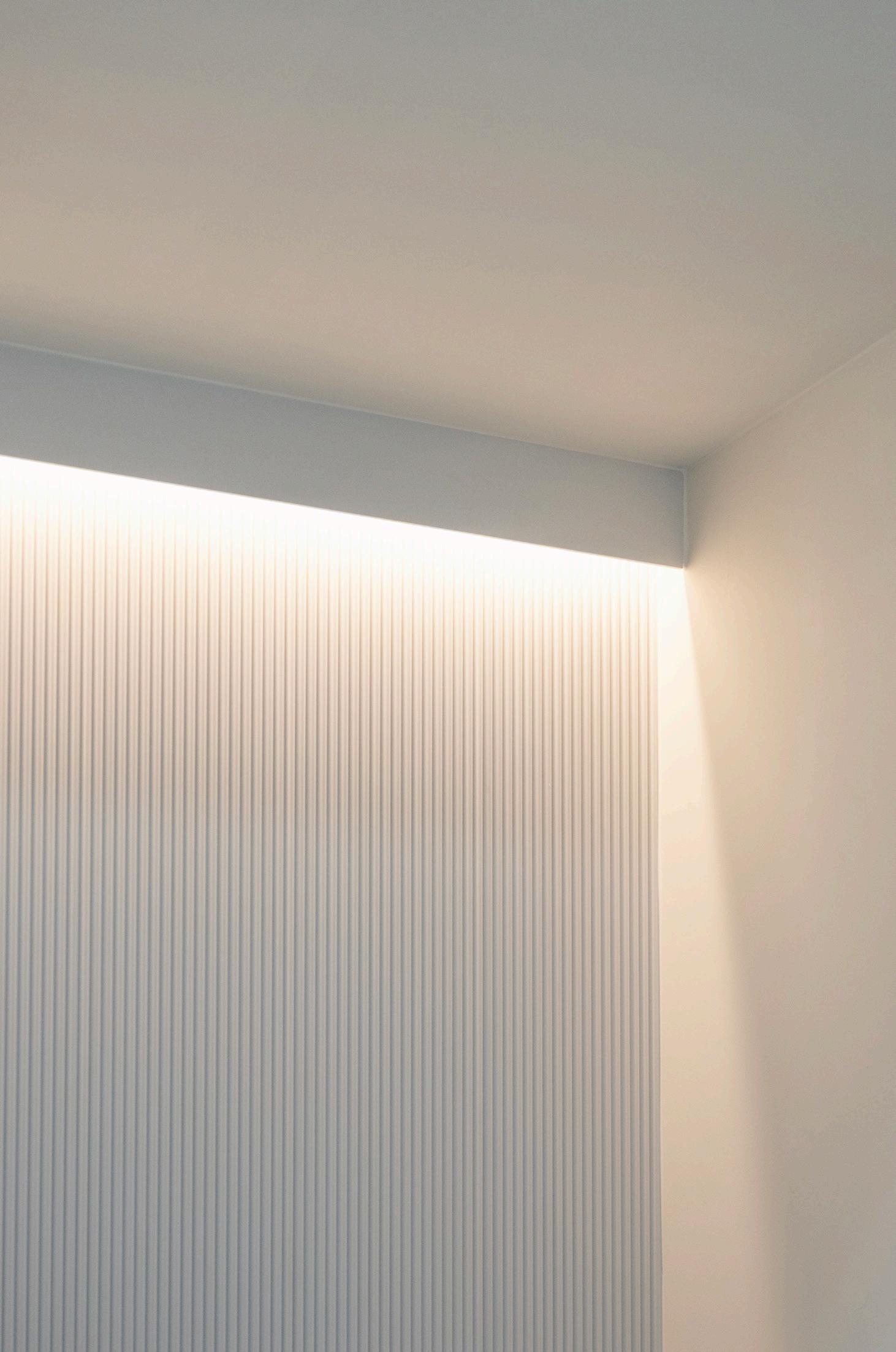 L’applicazione definitiva di LEDGE, che si estende in modo continuo attorno all’intera stanza. I binari per tende o i sistemi di tapparelle possono essere nascosti e può essere aggiunta anche un’illuminazione LED indiretta. Trasforma pareti e soffitti in un unico elemento architettonico armonioso.