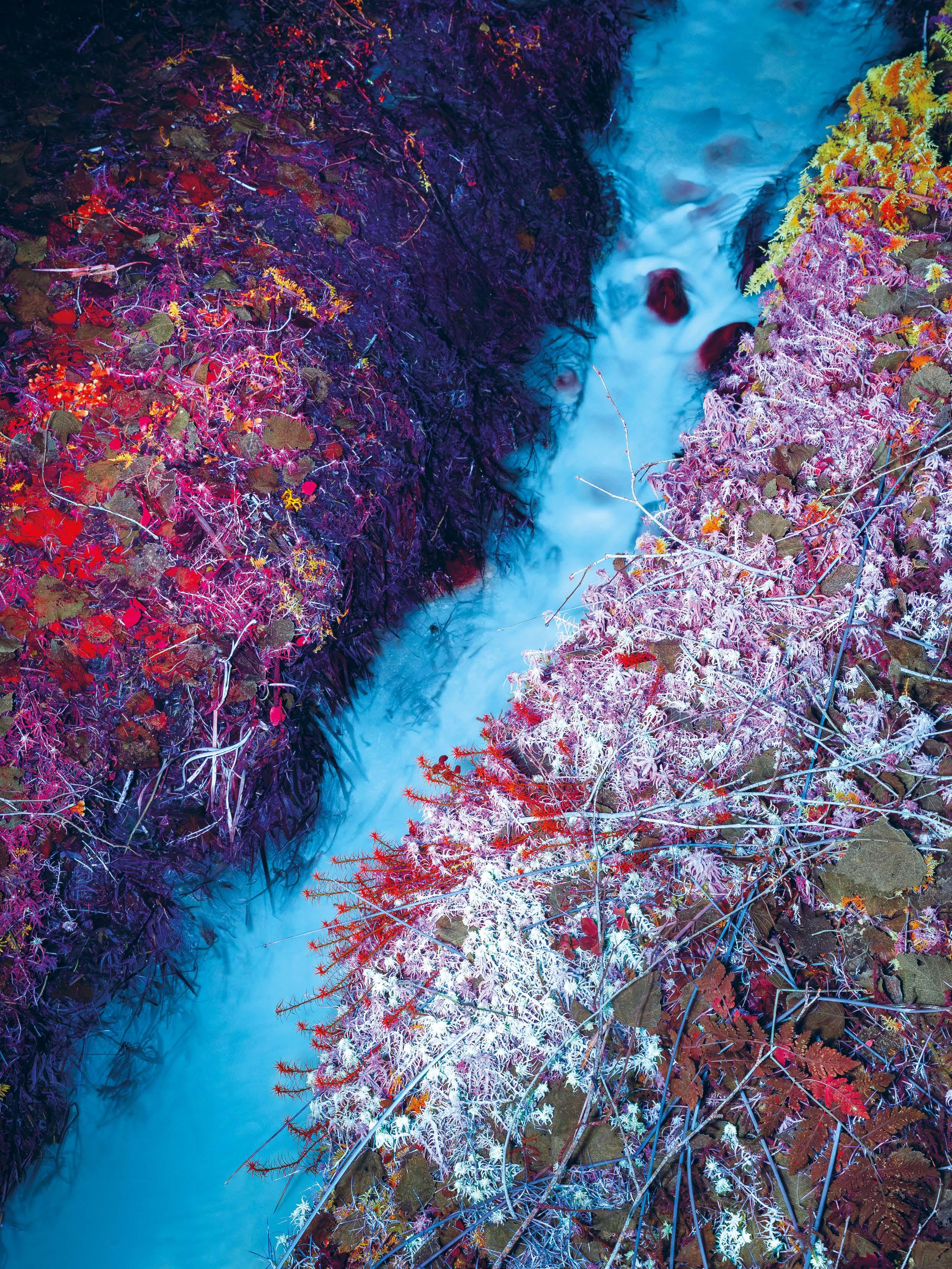 De ces années, il a gardé le flair pour saisir « les volumes, les matières, les couleurs » au gré de ses déambulations photographiques. Elles ont commencé en 2013, sous la forme d’explorations nocturnes dans les villes, les friches industrielles. Il découvre alors la magie du temps de pose long et sa palette d’effets : cinq minutes de temps de pose font du mobilier urbain un brasier ou enflamment une montée d’escaliers (Révolutionparisienne). Une immersion dans la forêt de Fontainebleau, que connaît bien ce grimpeur longiligne, l’encourage à se « confronter à ce milieu naturel. Ici, je sens s’ouvrir tous mes sens ». L’expérience produit Marche céleste, une série de mises en scène d’arbres et de roches illuminés. Alexis Pichot utilise du matériel d’éclairage, dont des drones, pour créer ses tableaux merveilleux, dans tous les sens du terme : « Commedansunstudio,jemodèleledécornaturelpourexprimermon onirisme. » La méthode est appliquée pour Résurgence, qui documente la lutte contre le chantier de l’A69 par les "écureuil·les", ces militants qui occupent les arbres pour empêcher leur abattage. Le photographe passe plusieurs mois parmi eux. « Tout était réuni :monamourdupaysageetmonsouhaitdem’engagerpourlaprotectionde la nature. » Là encore, ses images nocturnes se dessinent à la lampe frontale, à l’éclat de la lune, l’intensité d’un foyer. Lorsque le site est évacué puis rasé, en septembre 2024, Alexis Pichot simule « la montée de l’âme d’un chêne » par un trait de lumière filant vers les étoiles… Résurgence est le second volet de la trilogie consacrée aux arbres que le photographe développe depuis Les Gisants (sur l’abattage de platanes le long de la RN7) en 2022. Il est ainsi sur le point d'achever sa stupéfiante et dernière série, Rêve primaire: ou comment rêver la forêt des Vosges à travers la vision d’un pollinisateur, capable de percevoir les rayons ultraviolets. Porté à la fois par une « envie de féerie » et sa rencontre avec le botaniste Francis Hallé (disparu en fin d'année), Alexis Pichot confronte ainsi les réels en travaillant, toujours de nuit, les réactions chimiques produites par la lumière. À l'arrivée, de véritables tableaux tels des fonds sous-marins ou des paysages lunaires. Magique !
