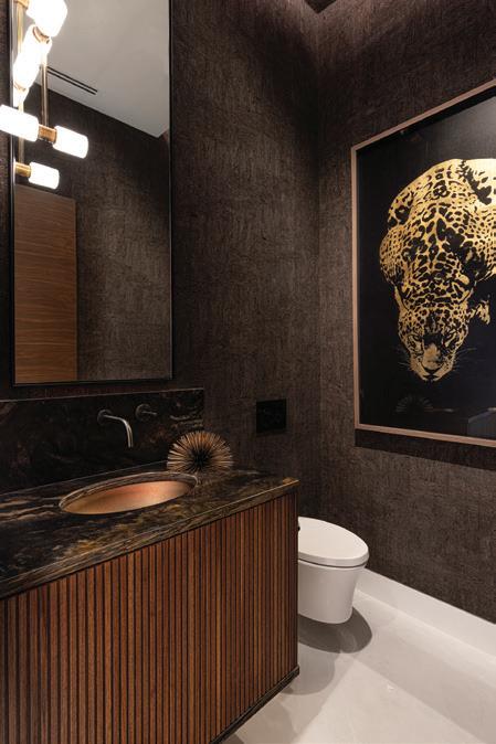 shadow line that runs around each door — really intricate, clean details. Some of the different materials we used ranged from large-format slabs to create grand focal walls to delicate, high-end stones to create more furniture-like features on some of the vanities,” adds builder Chris Salhab.